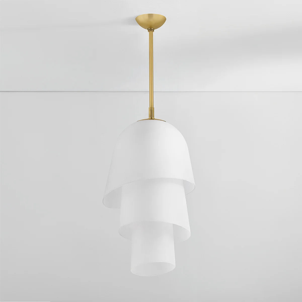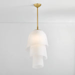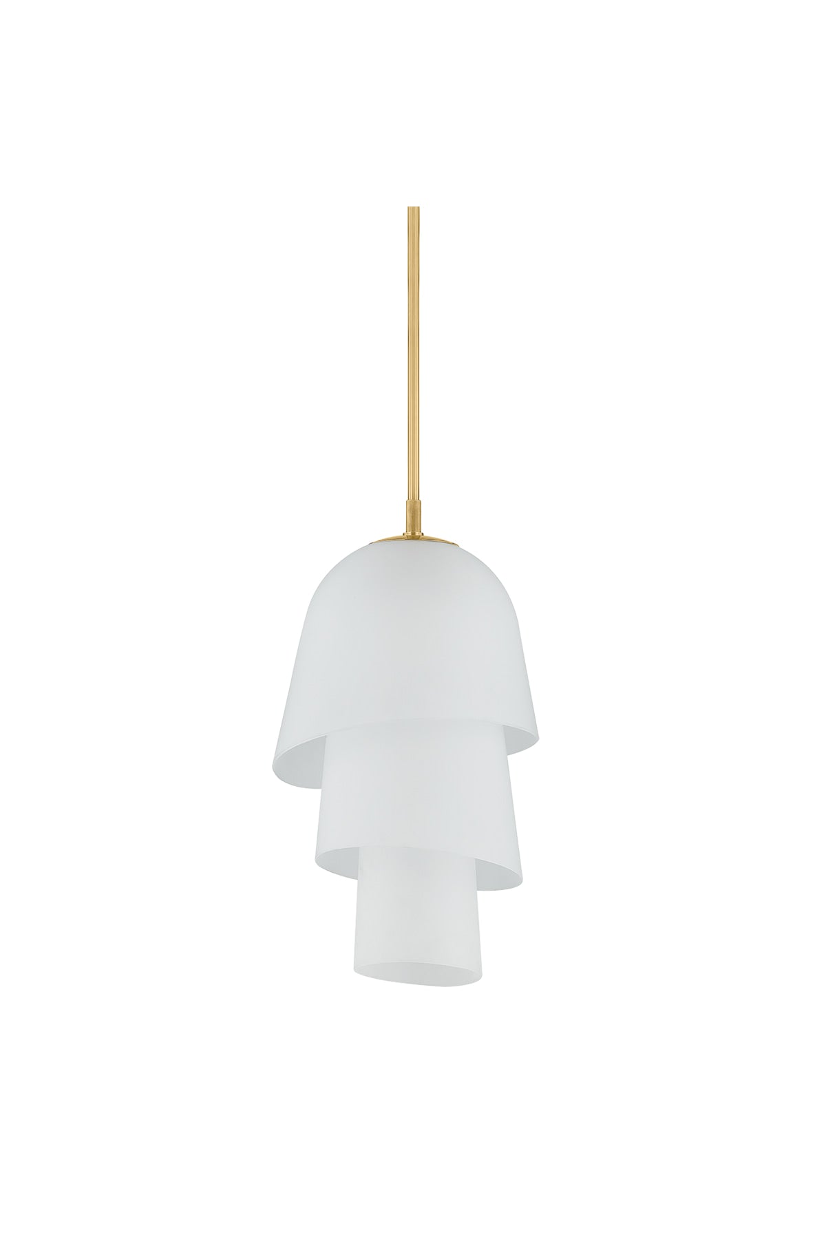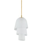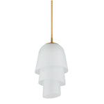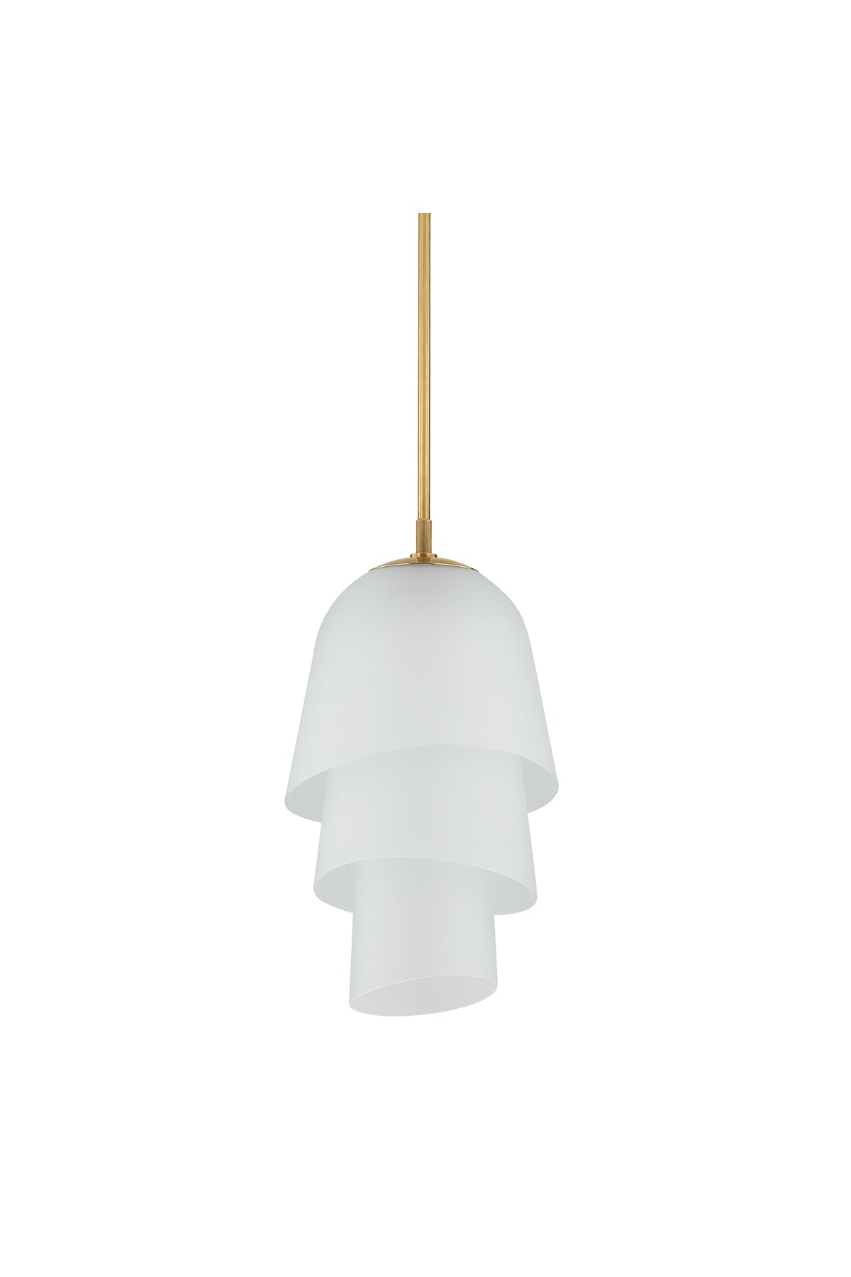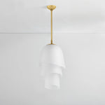 Recalling the shape of a bluebell, the Hela Pendant features a three-tiered bloom crafted from etched clear glass. The bias cut on the glass ends enhances the overall fluidity of the silhouette. When illuminated, Hela emits a warm diffusion of light that is complemented by a Vintage Brass rod. Bulb(s) not included.