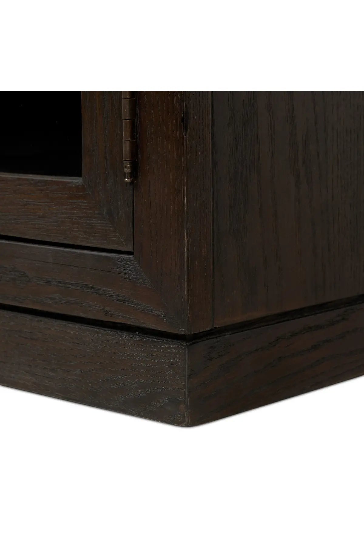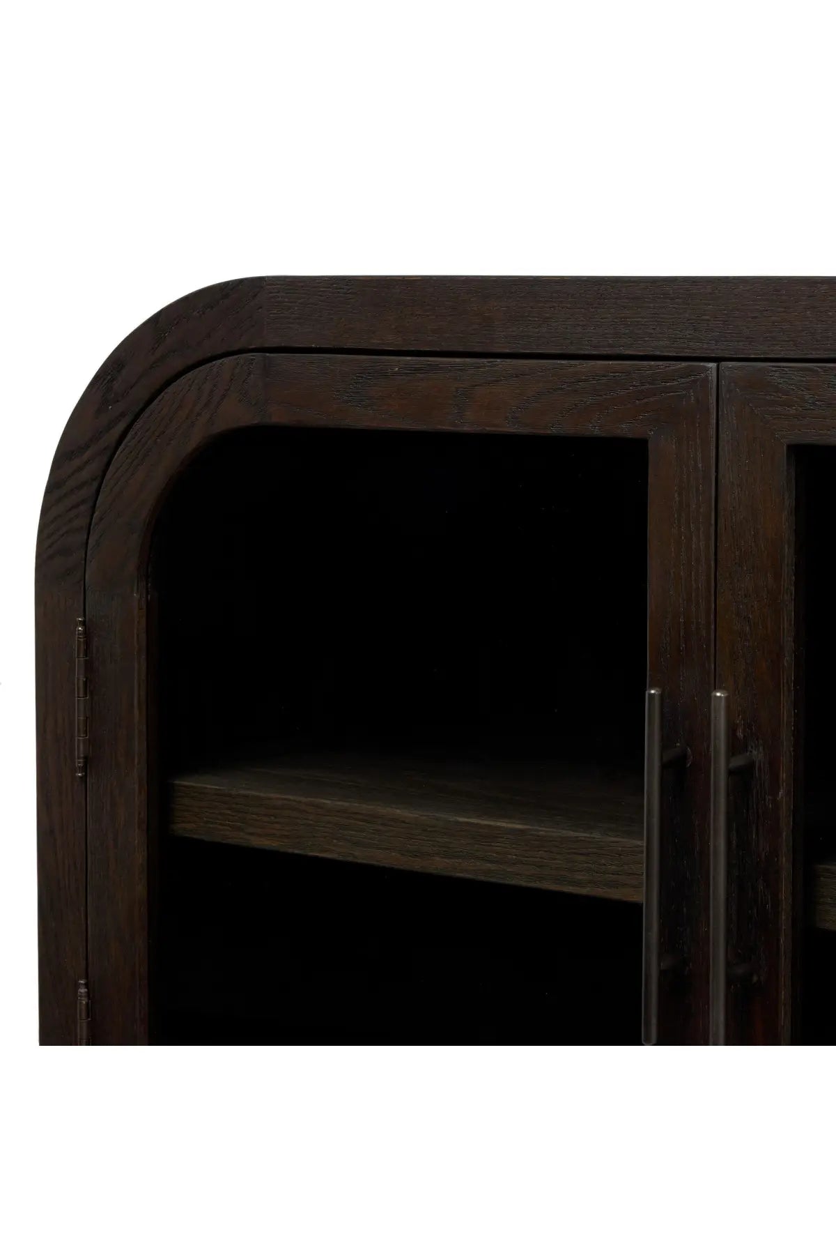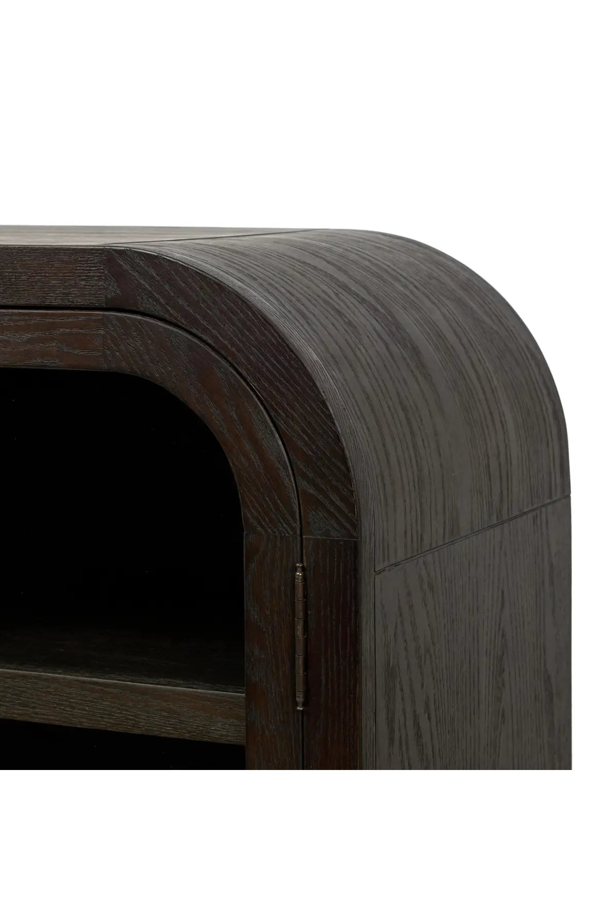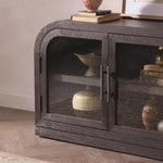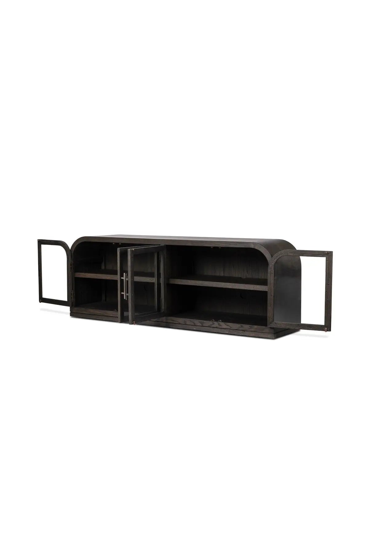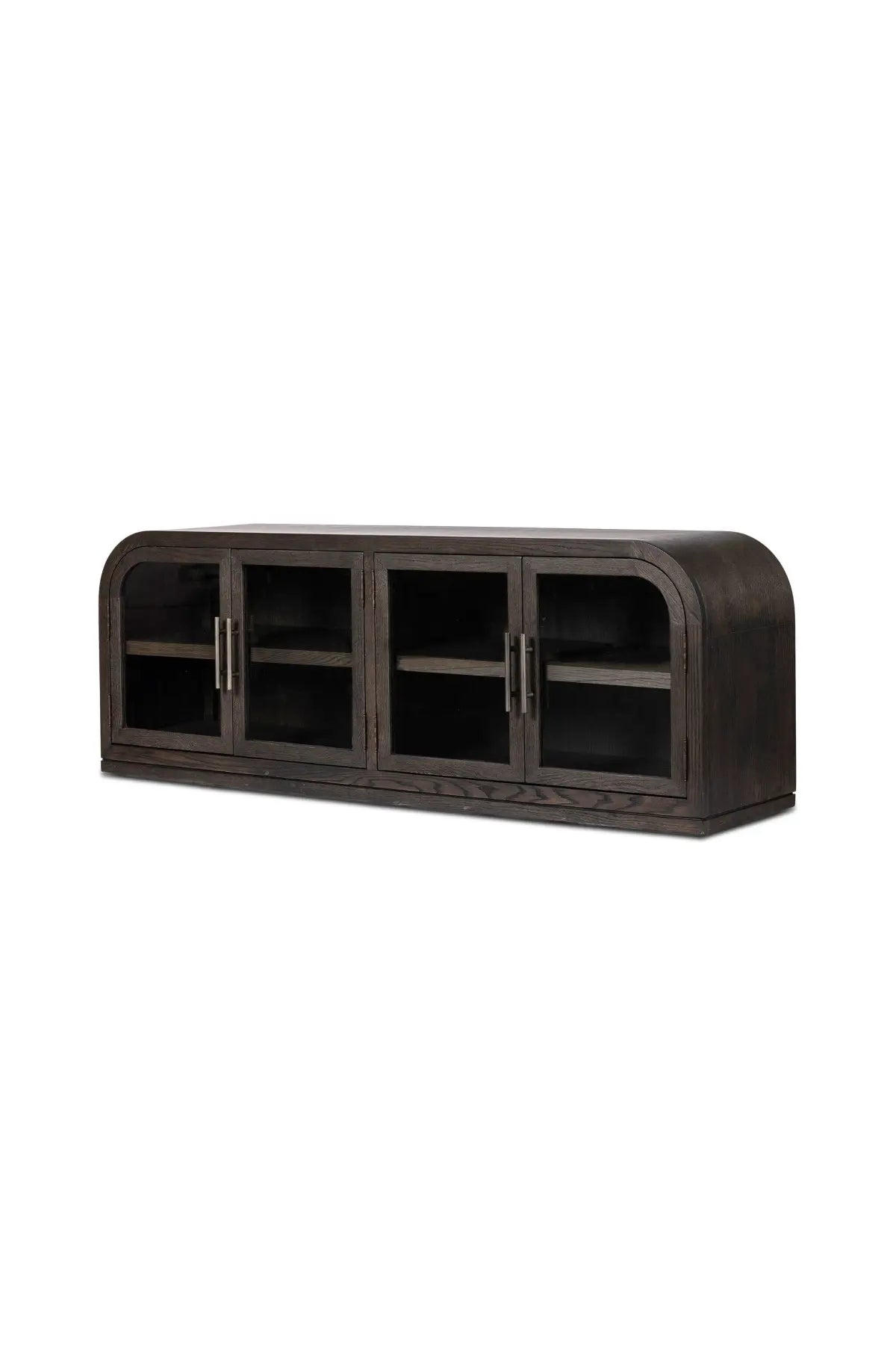 Meet the Hepburn Media Console. Beautifully arched with a flush plinth base, a versatile oak cabinet features a dark, rich finish. A tempered glass front and generous interior shelving creates endless possibilities for your media storage.