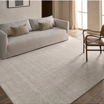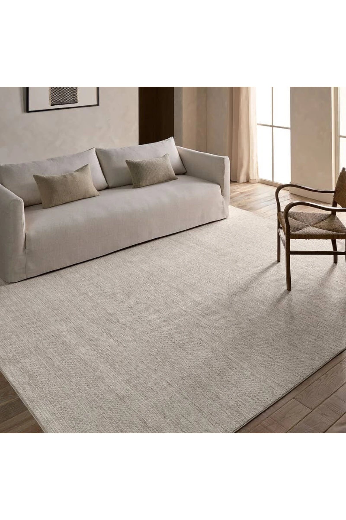 Meet Icten - Light Taupe. The Icten Rug in Light Taupe features a subtle ombré effect and a grass-style pattern in a versatile white shade. Its modern design suits both minimalist and transitional spaces, offering style and functionality. Samples are modeled at our North Scottsdale/Phoenix location.