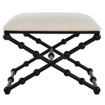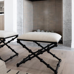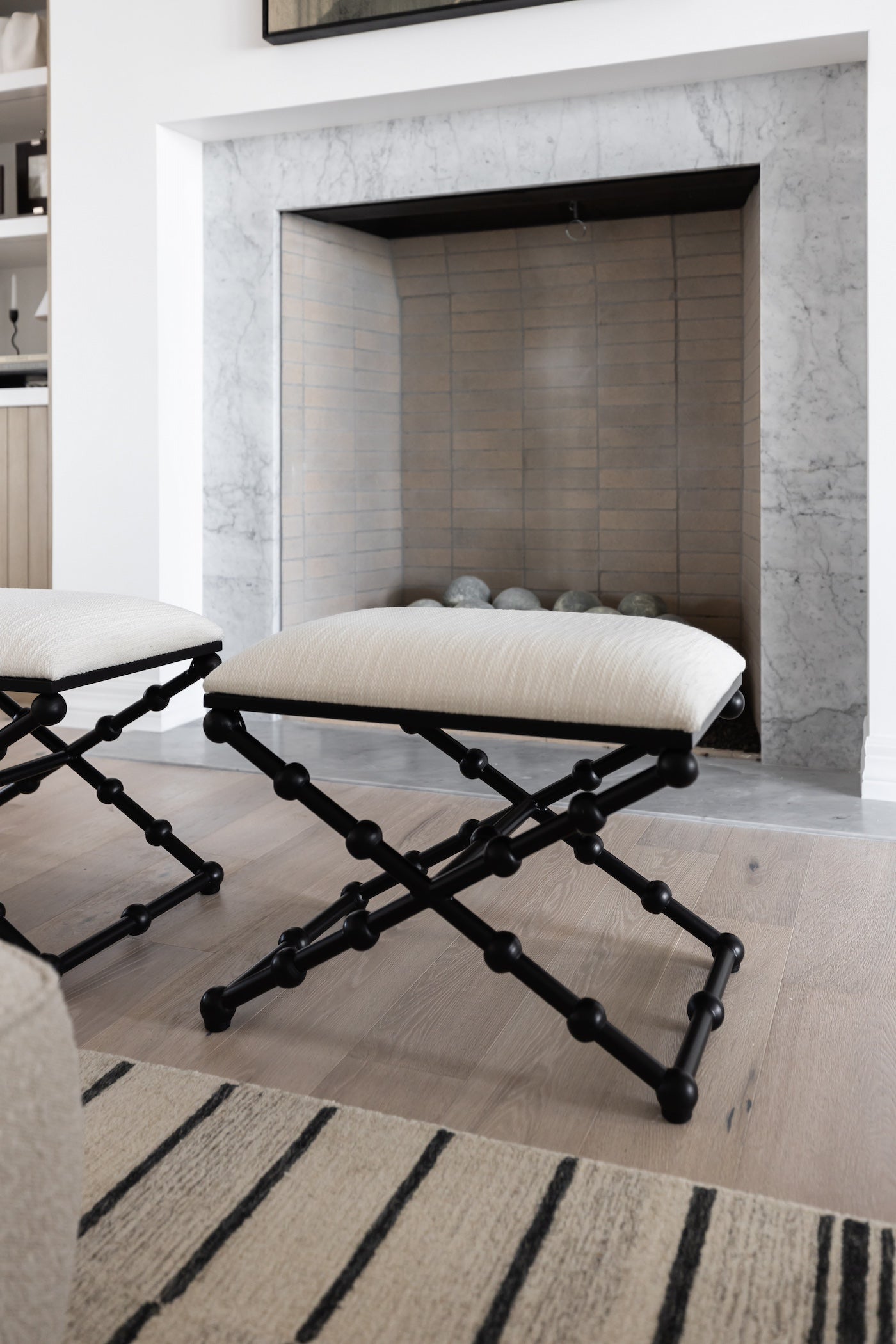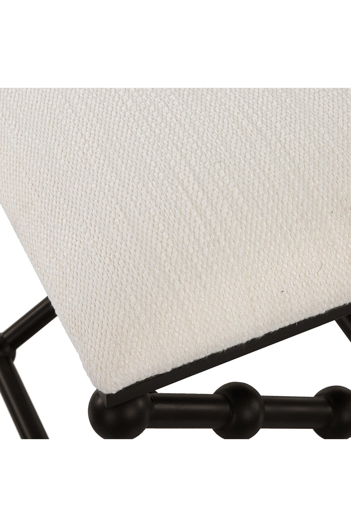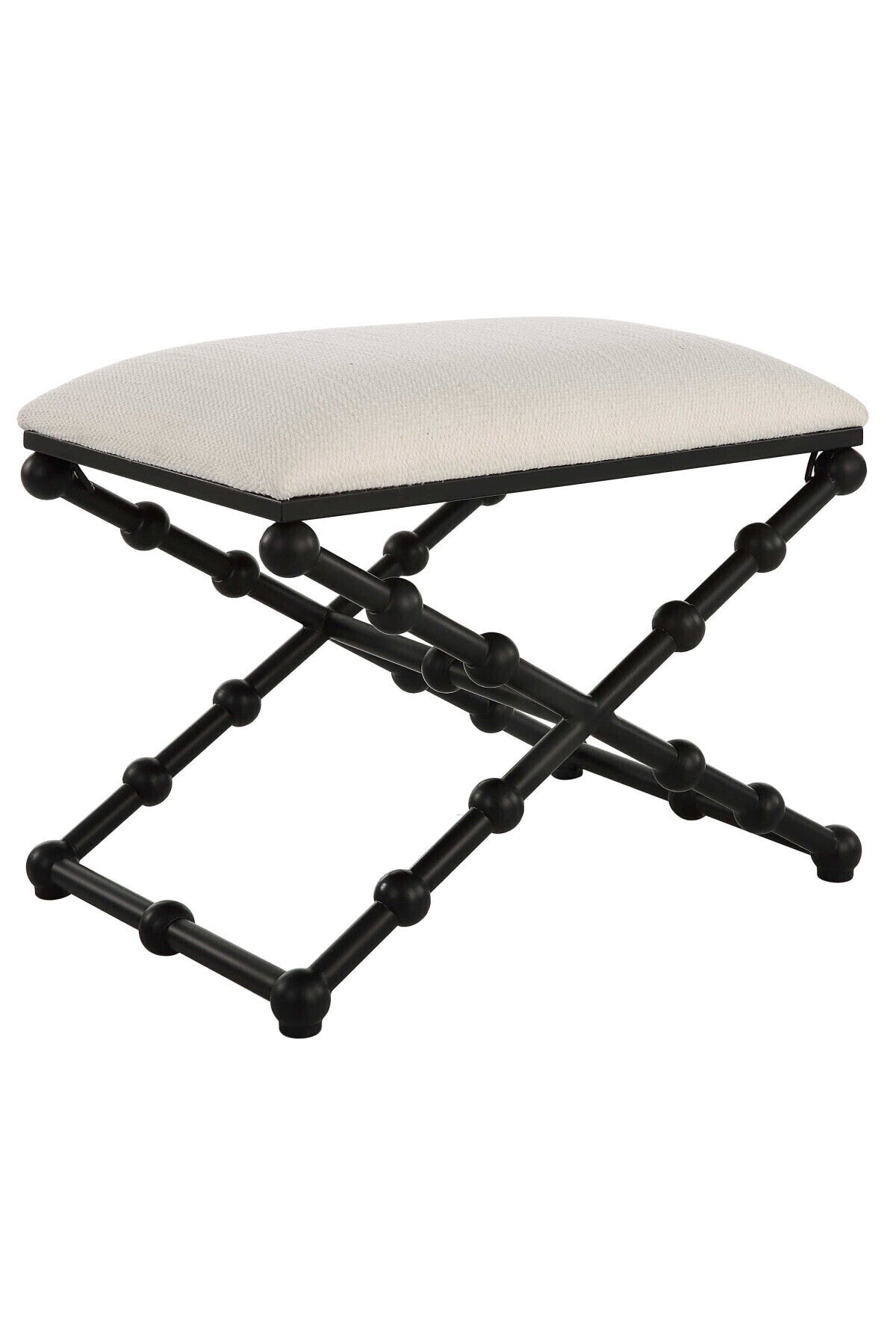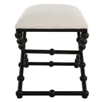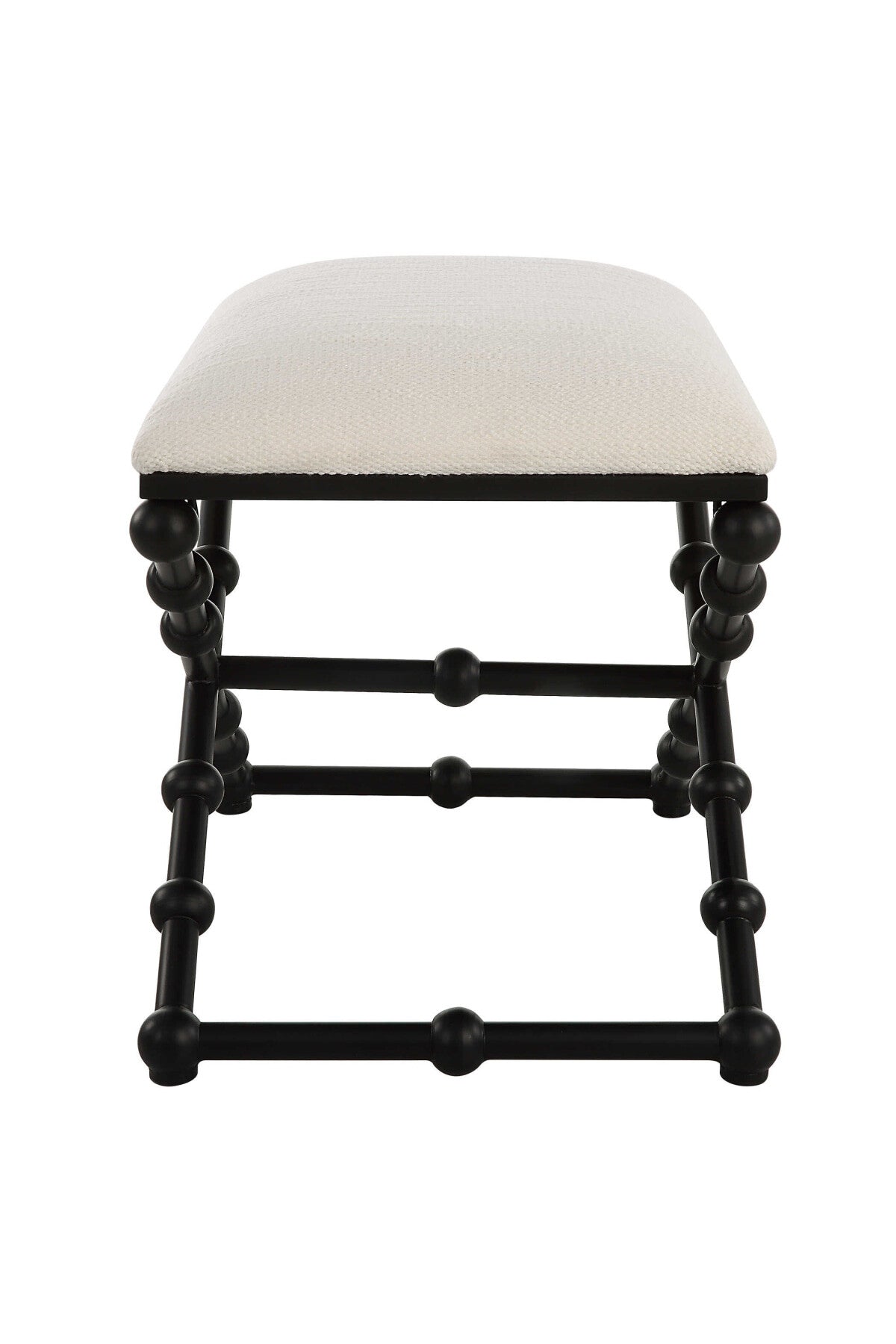 Meet the Iron Drops Small Bench. Sophisticated style created by the whimsical bubble legs ensures the Iron Drops Small Bench to stand out in any home. Crafted in iron with a satin black finish contrasted with a cushioned seat in a crisp white textured polyester fabric with performance treatment.