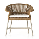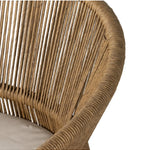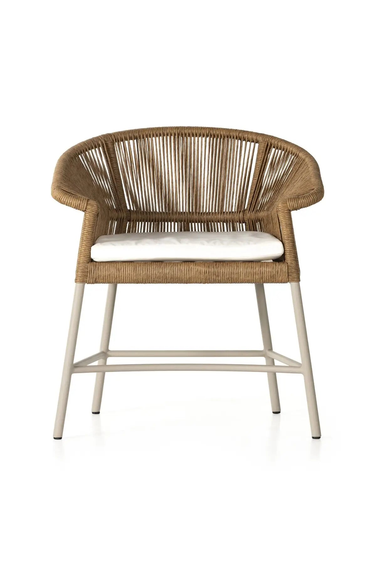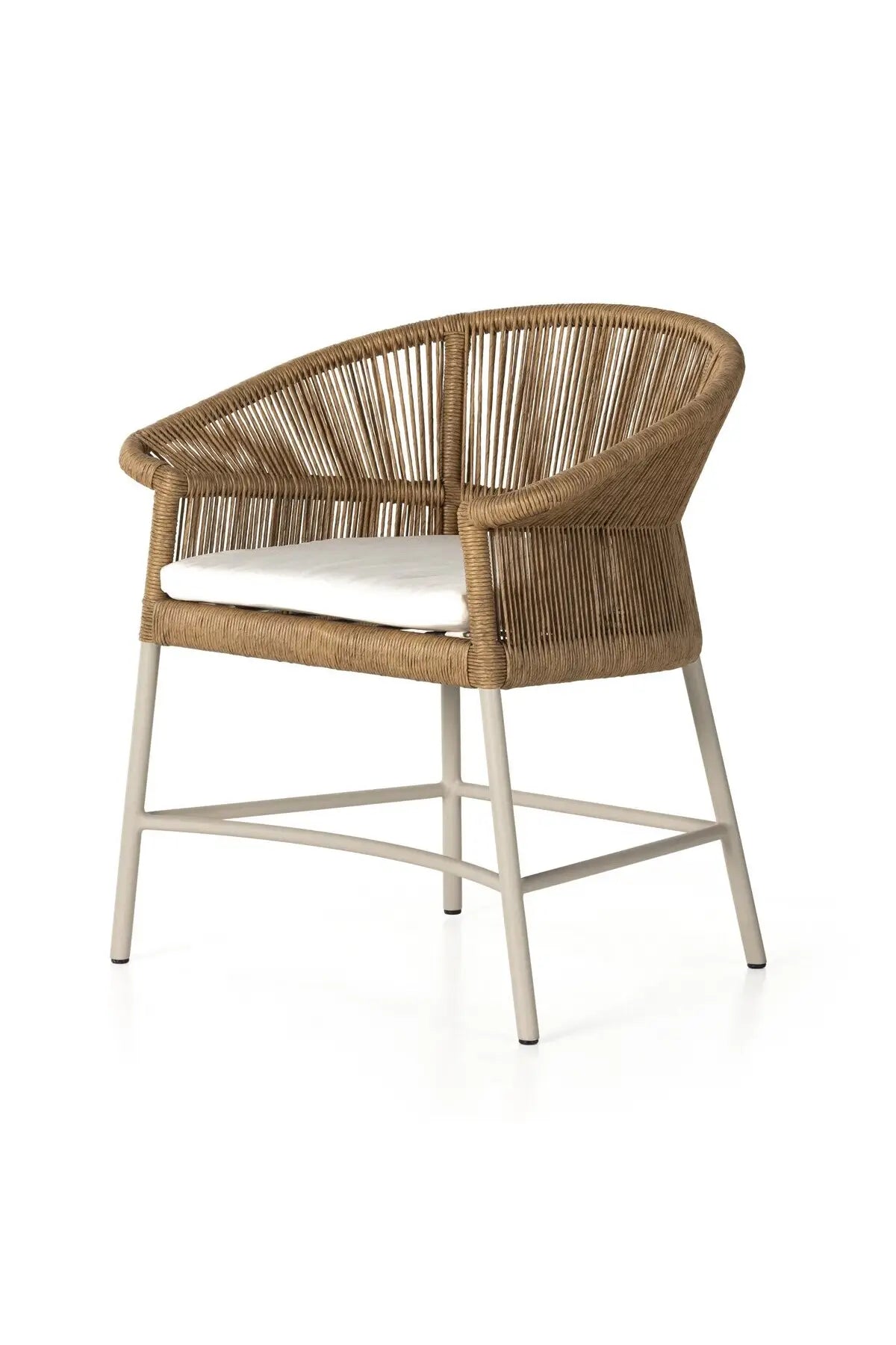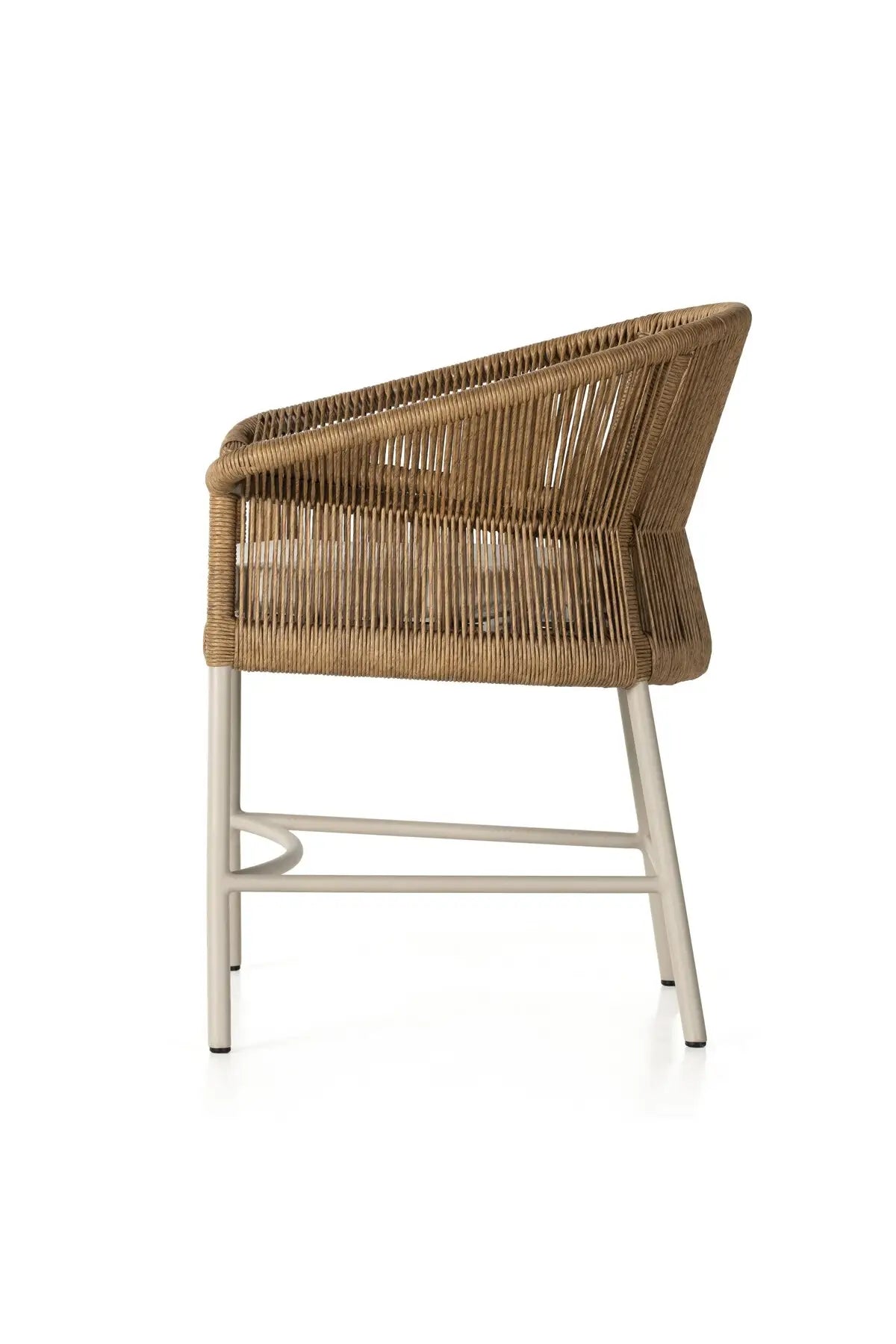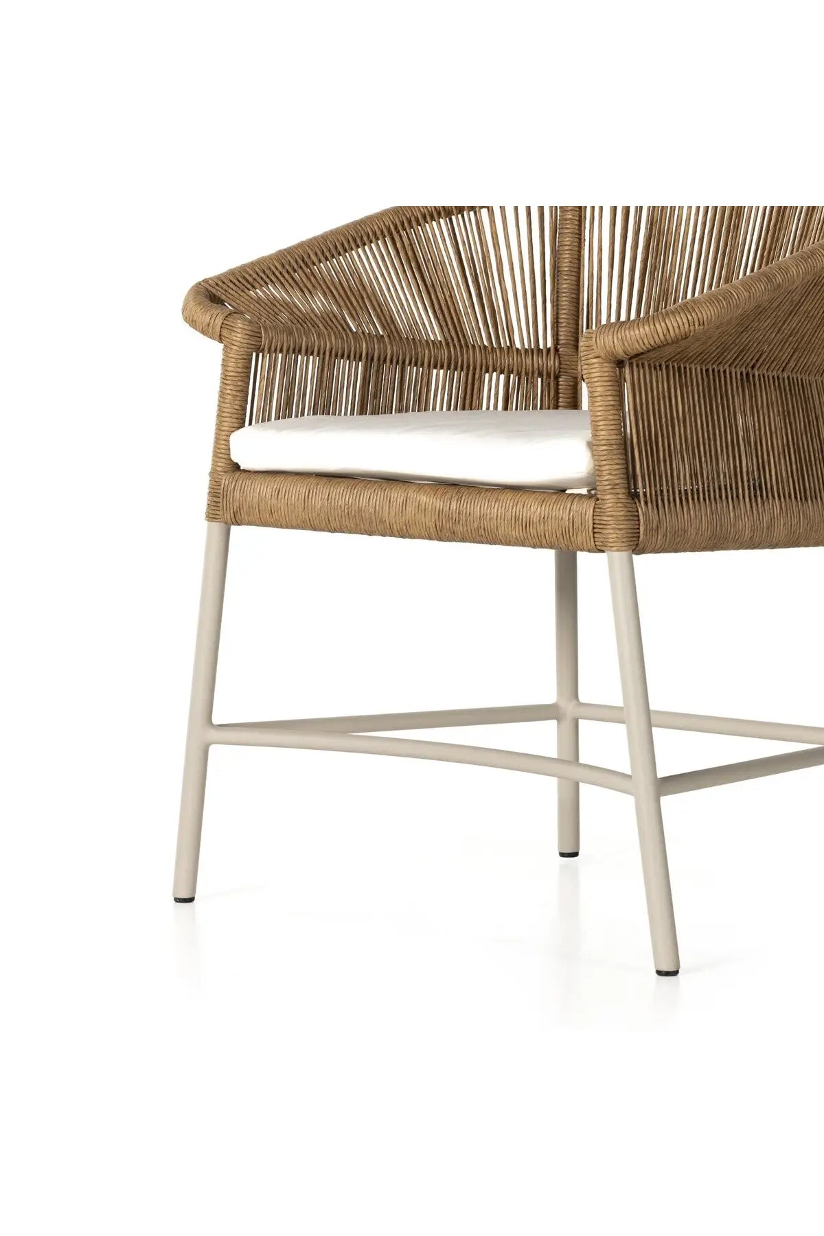 Meet the Irving Outdoor Dining Armchair! A beautiful rope-based design in caramel tones is woven across a durable aluminum frame. Features a comfortable barrel shape with angled detailing all around. Topped with a removable cushion upholstered in 100% Olefin, known for its UV-resistant, water-repellent and quick-drying abilities. Cover or store inside during inclement weather.