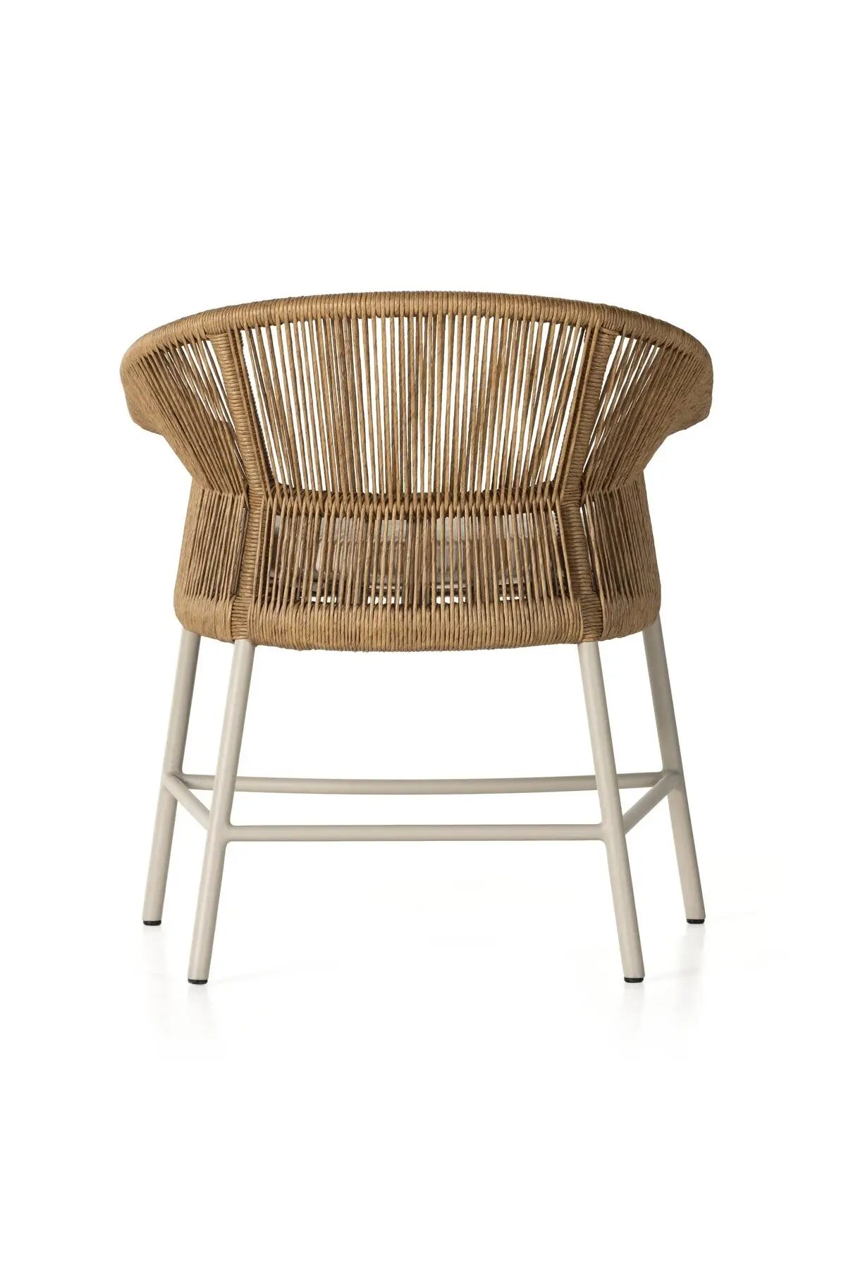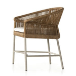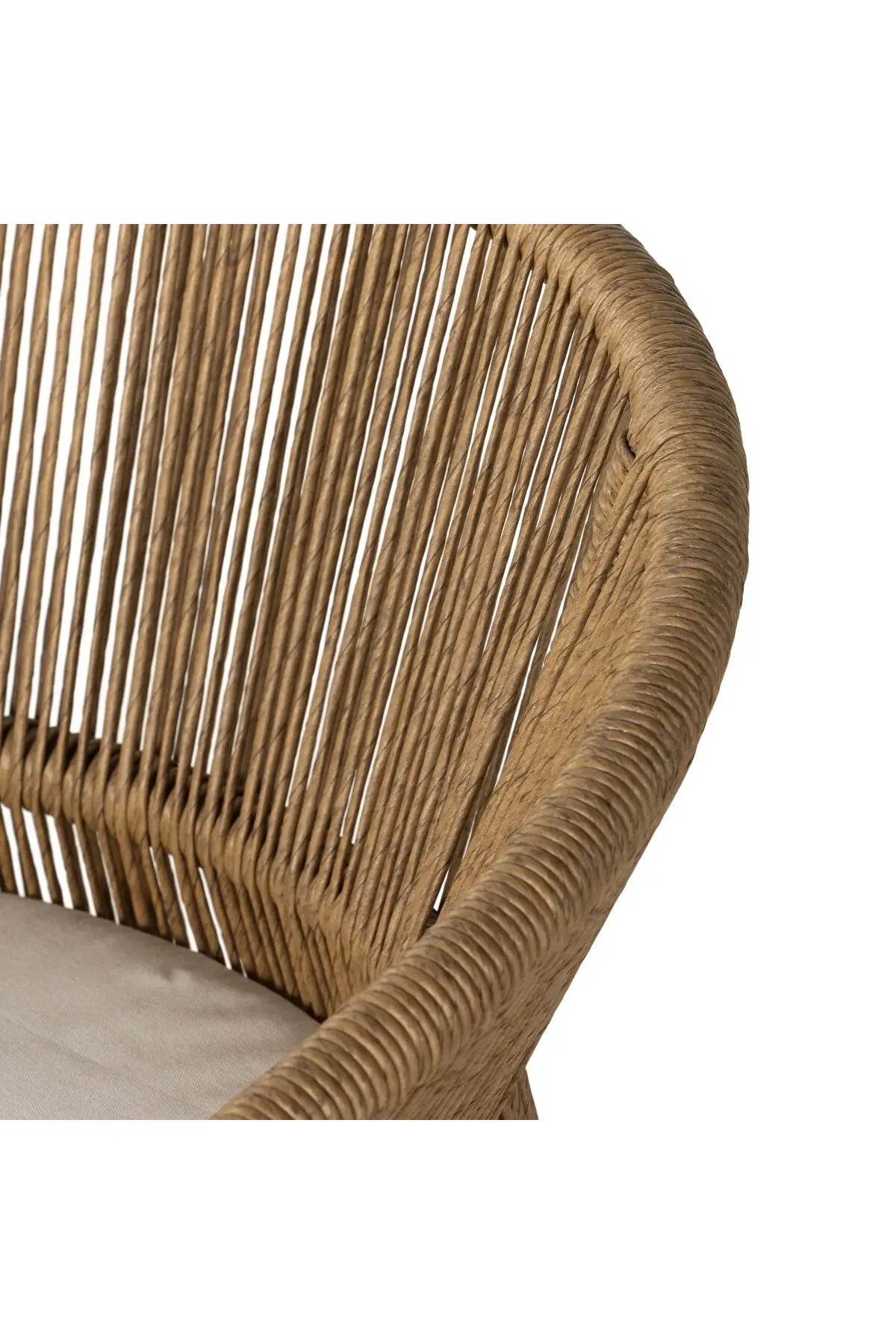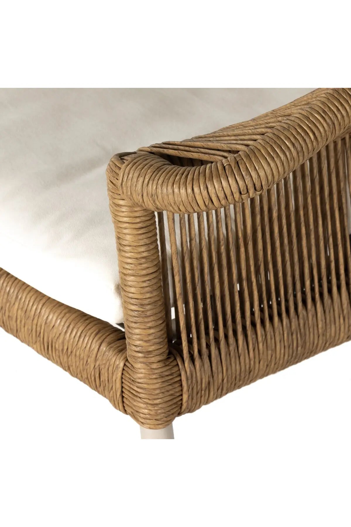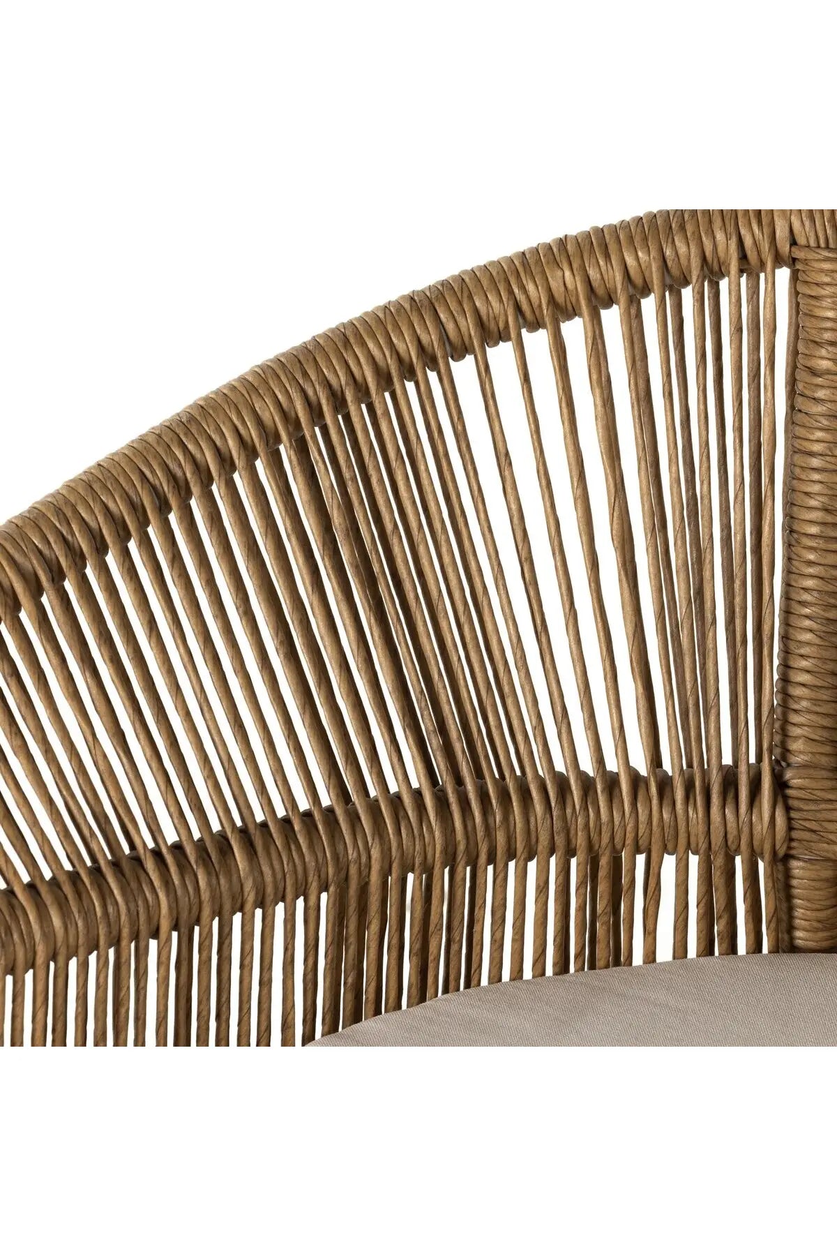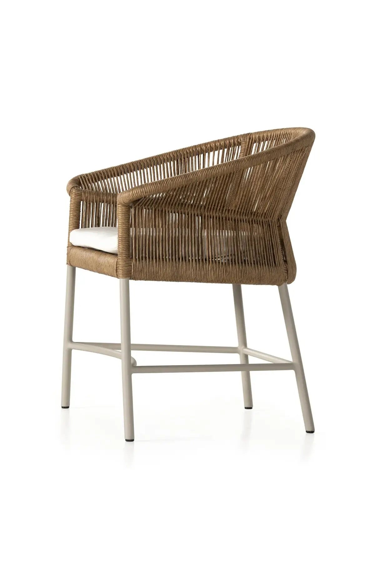 Meet the Irving Outdoor Dining Armchair! A beautiful rope-based design in caramel tones is woven across a durable aluminum frame. Features a comfortable barrel shape with angled detailing all around. Topped with a removable cushion upholstered in 100% Olefin, known for its UV-resistant, water-repellent and quick-drying abilities. Cover or store inside during inclement weather.