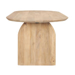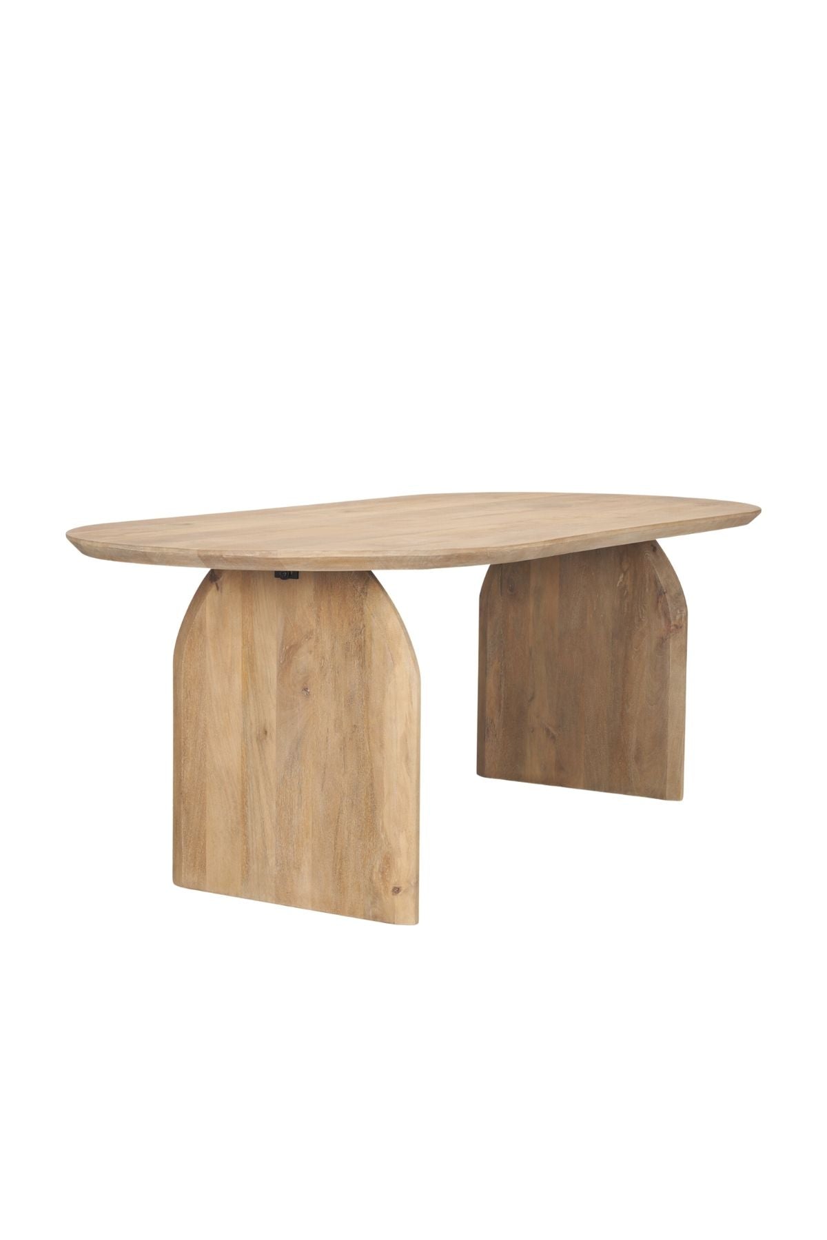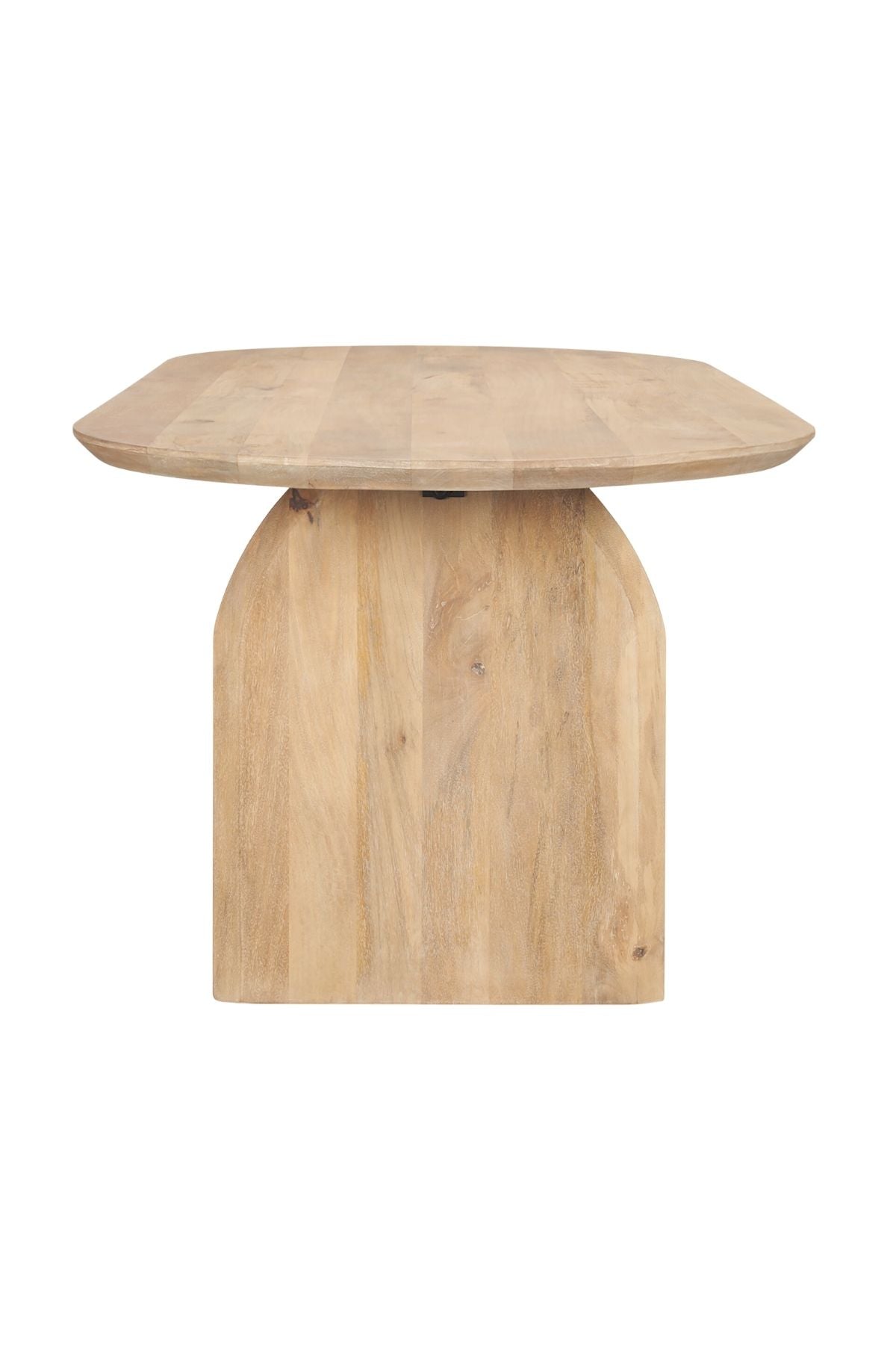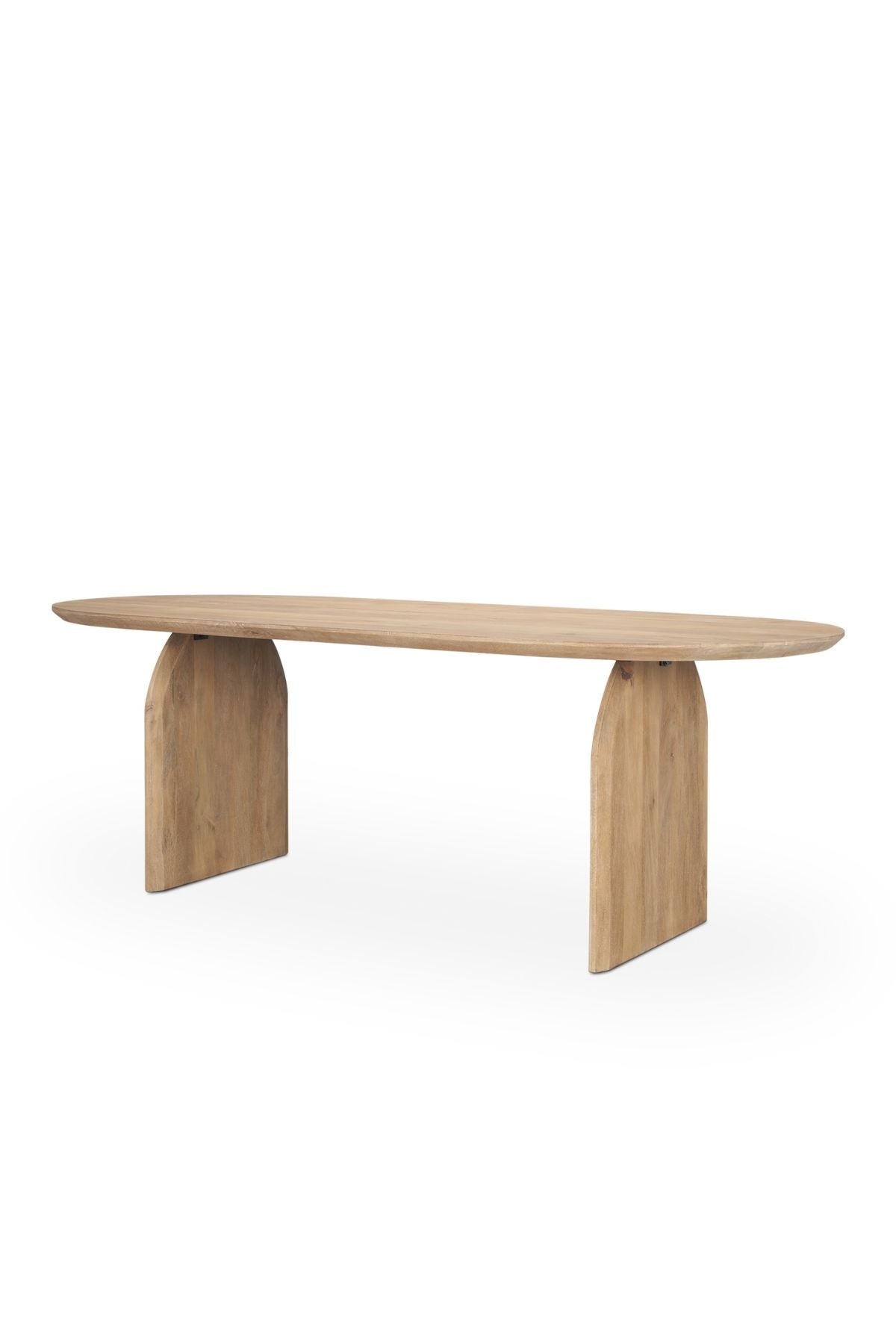 Meet the Isla Dining Table. Made of solid mango wood in a light, neutral brown finish. This tasteful masterpiece boasts an inviting oval tabletop and gracefully slender arched legs, showcasing its captivating curvature as a defining attribute.