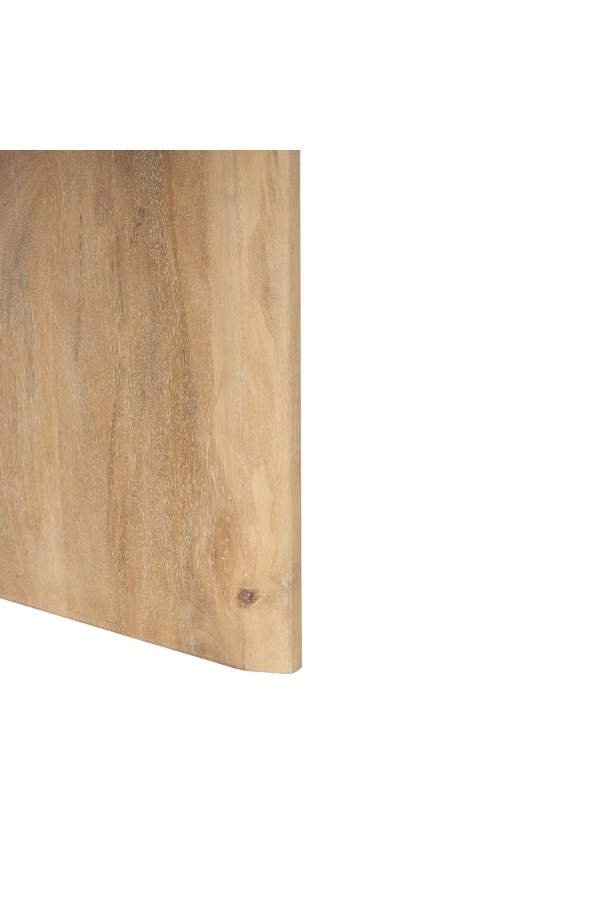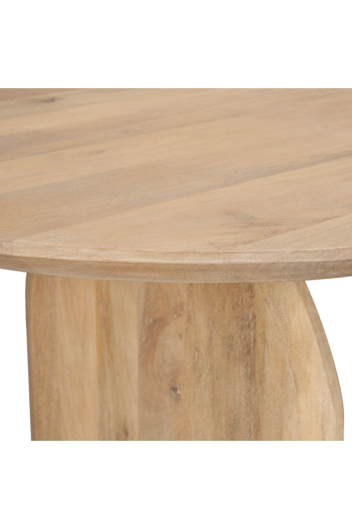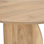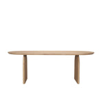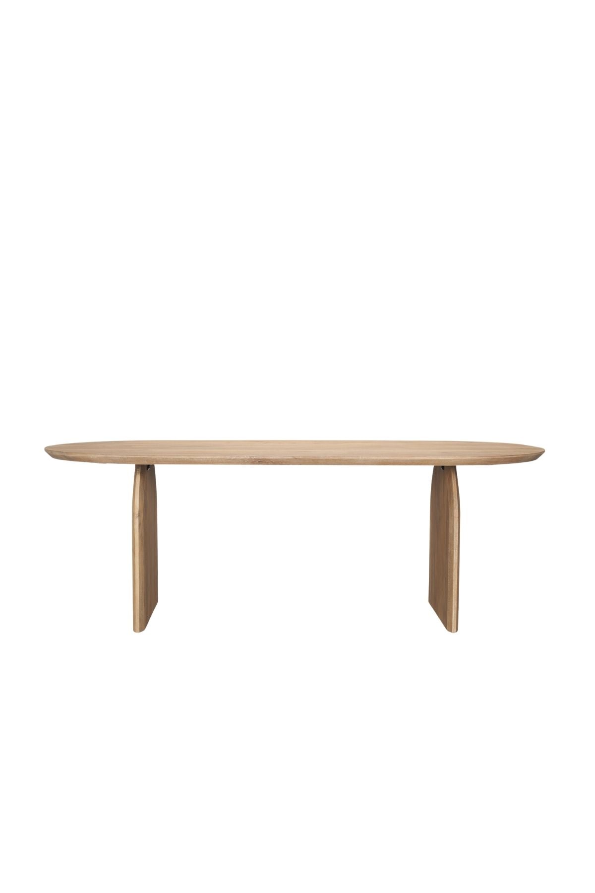Meet the Isla Dining Table. Made of solid mango wood in a light, neutral brown finish. This tasteful masterpiece boasts an inviting oval tabletop and gracefully slender arched legs, showcasing its captivating curvature as a defining attribute.