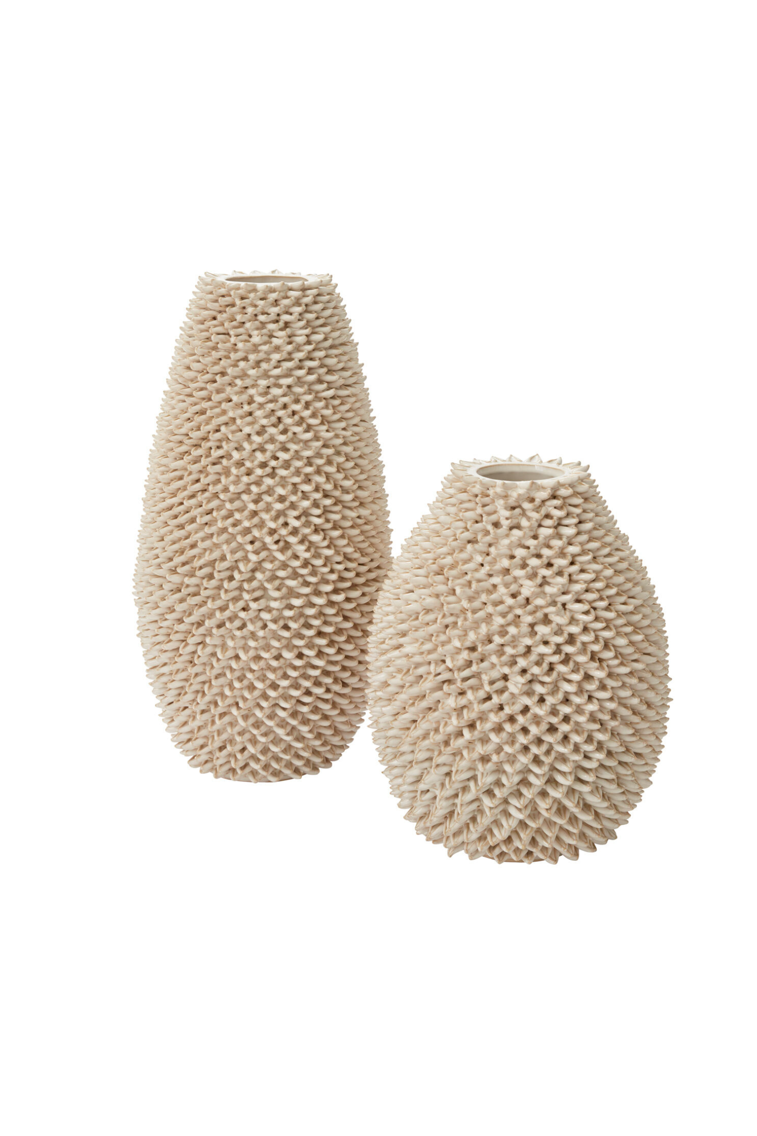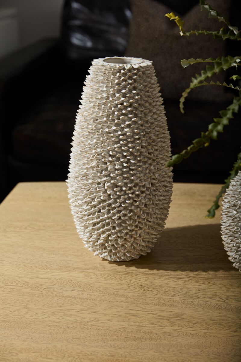 Each artisan-crafted ceramic Ismene Vase is truly one-of-a-kind, featuring hundreds of meticulously handmade, hand-applied shell-shaped details across its elongated oval body. Designed to be both sturdy and substantial, these vases are perfect for floor placement or large surfaces. Their textured design offers versatile styling options, from branchy arrangements to seasonal florals, adding depth and artistry to any space.
