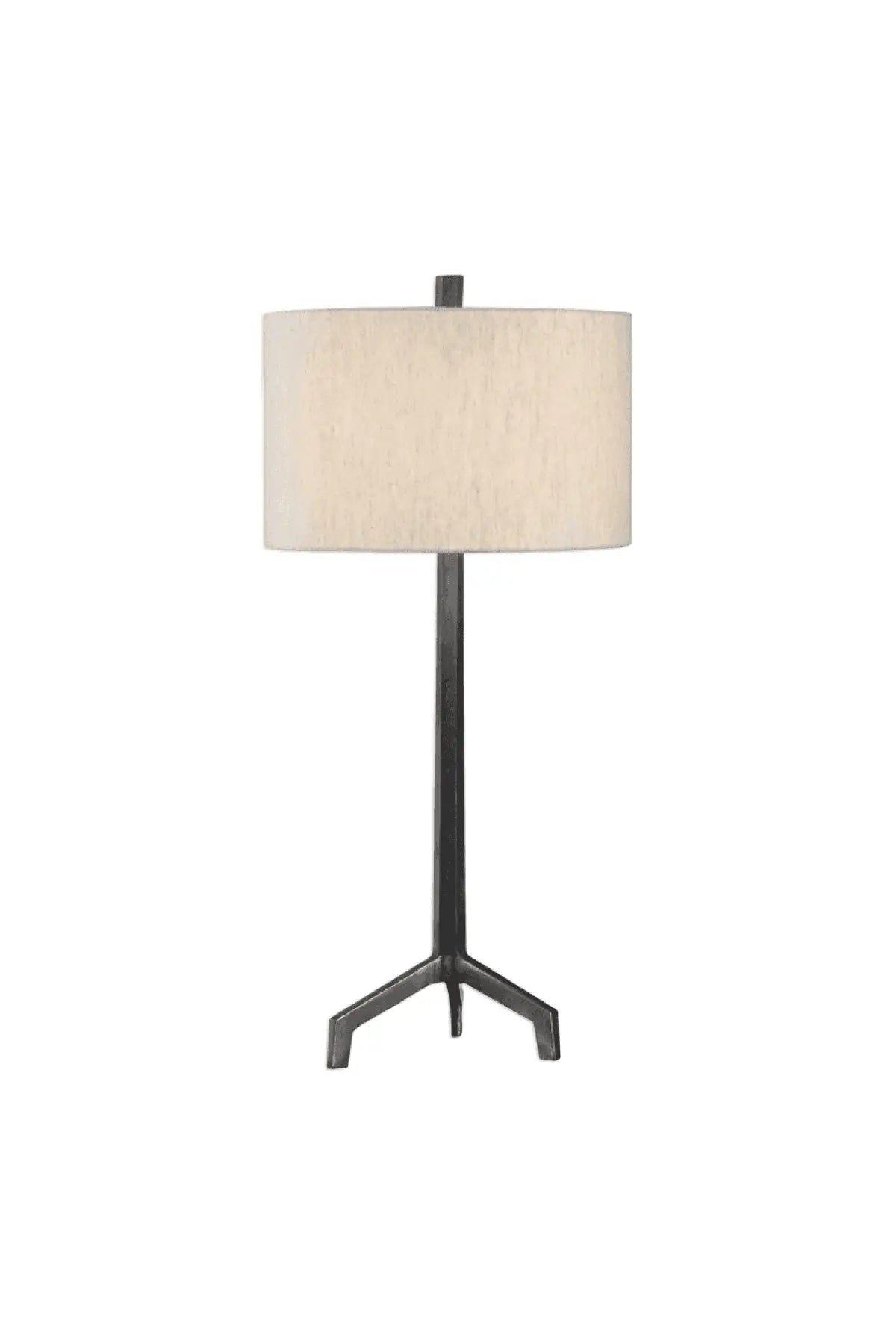 Meet the Ivor Table Lamp. The most refined addition to any table. Tapered cast iron with a subtle textured surface, with a raw steel finish and burnished distressing. The round hardback drum shade is a light beige linen fabric with natural slubbing.