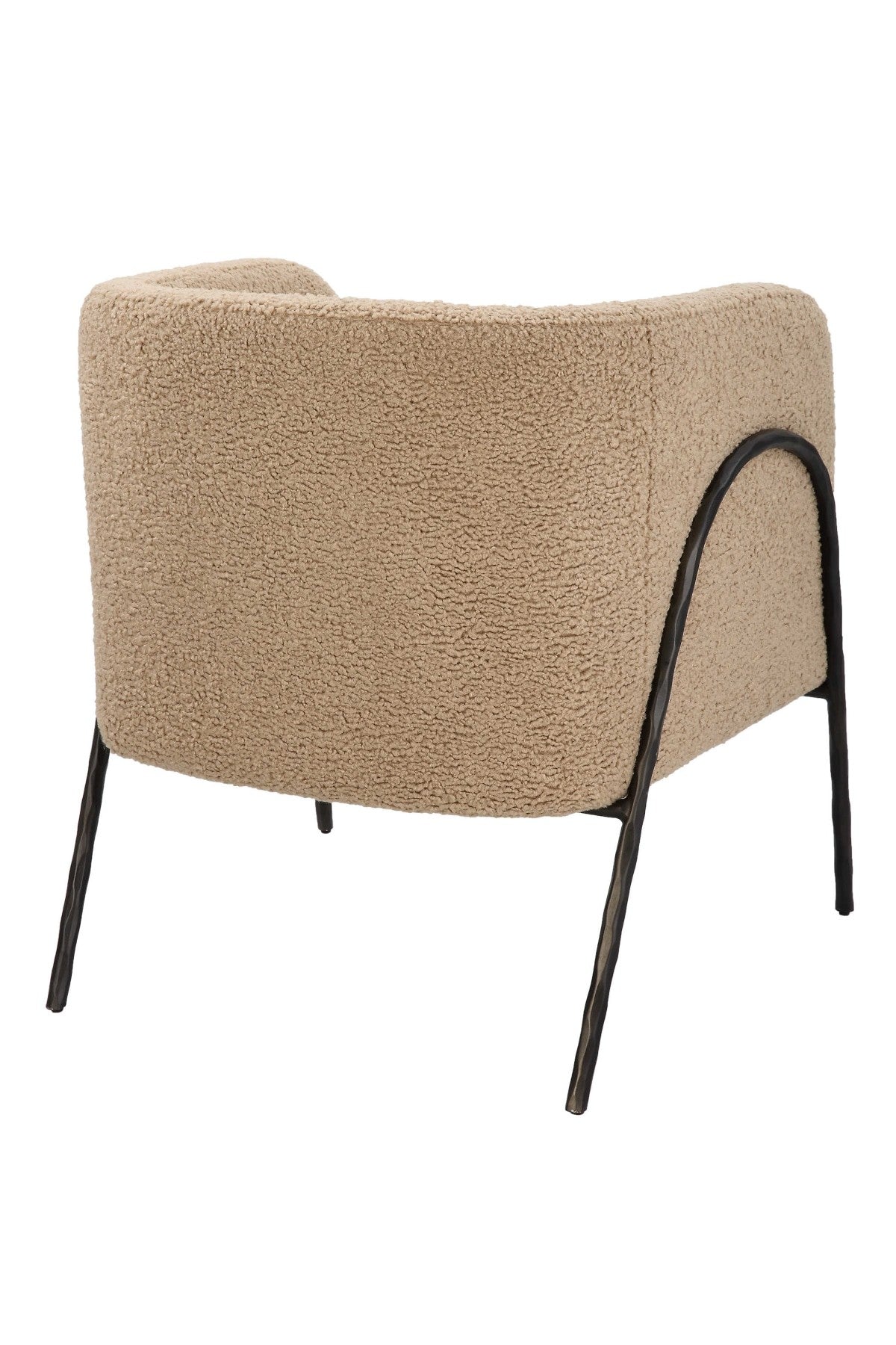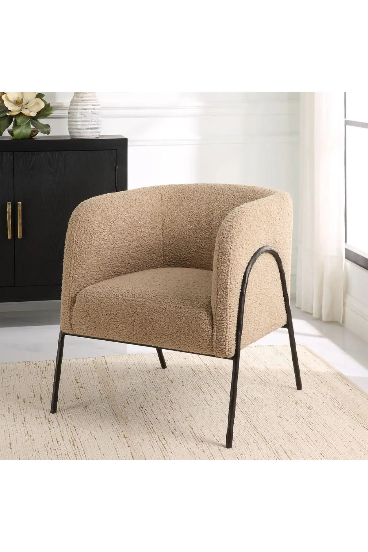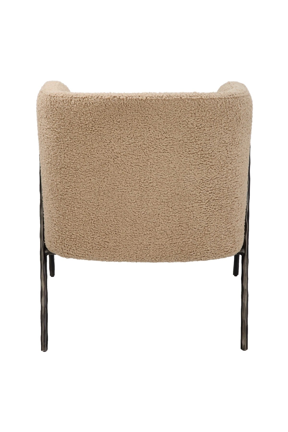 Meet the Jacobsen Accent Chair. Inspired by Scandinavian designs, this barrel back style chair showcases warm latte faux shearling nestled in a curved chiseled iron frame finished in dark bronze.