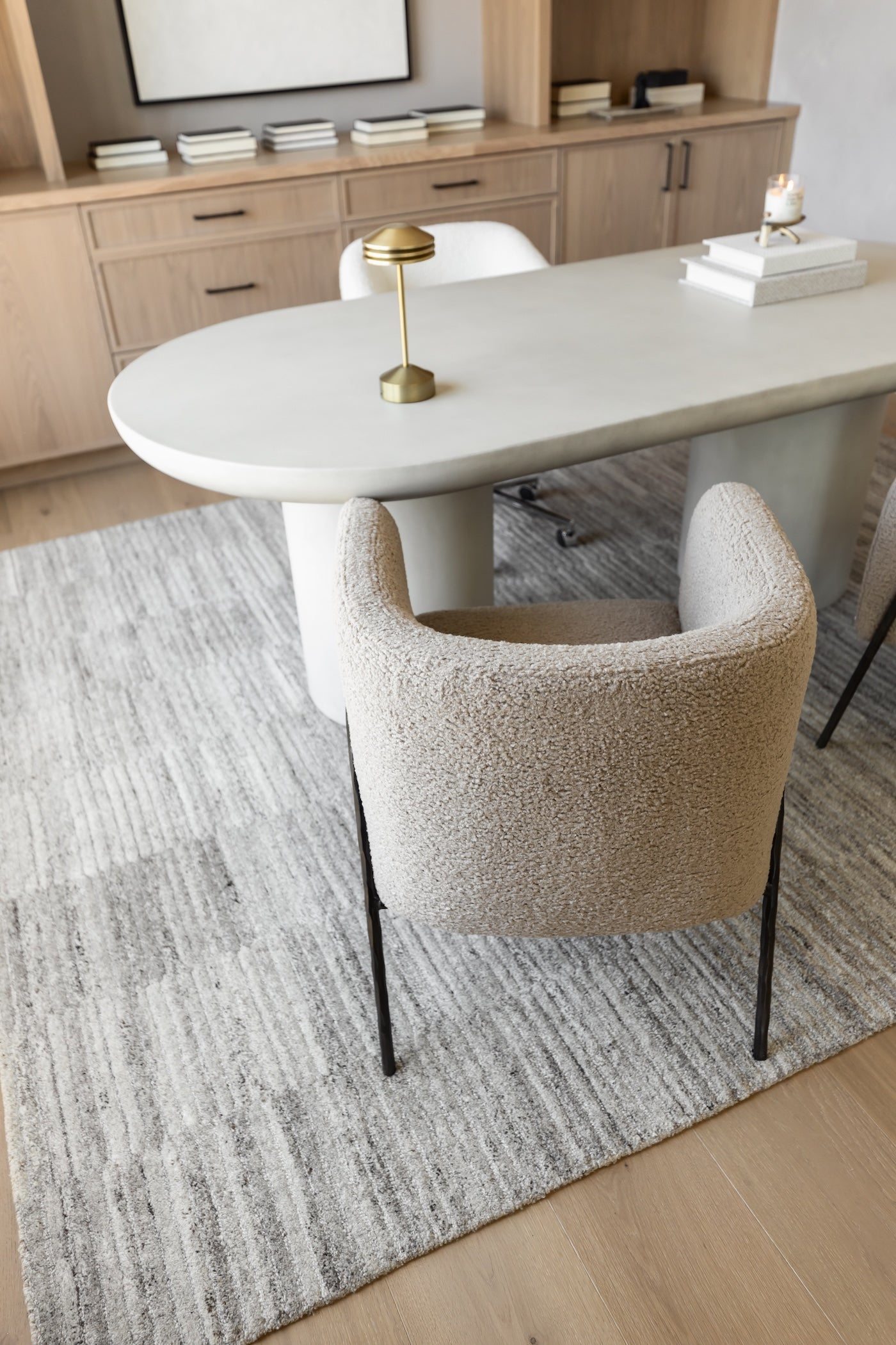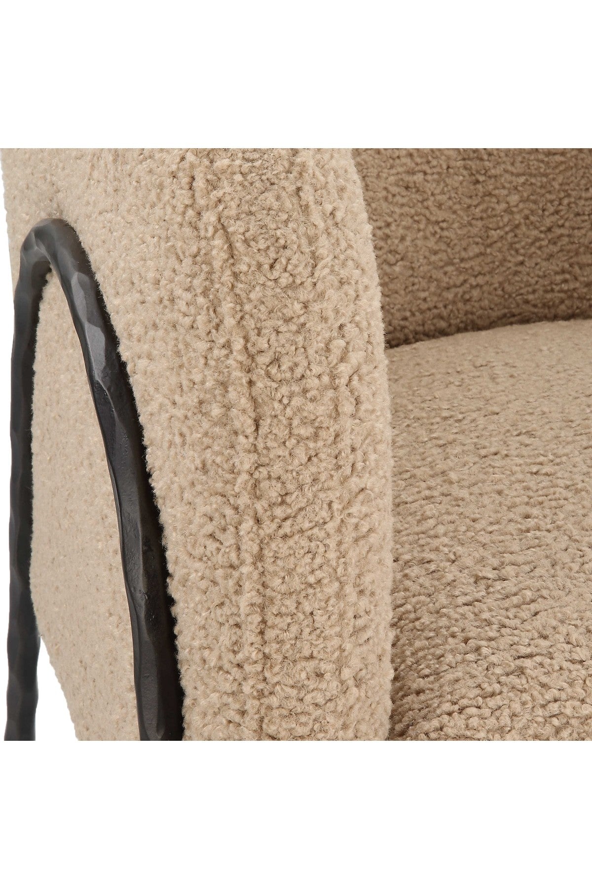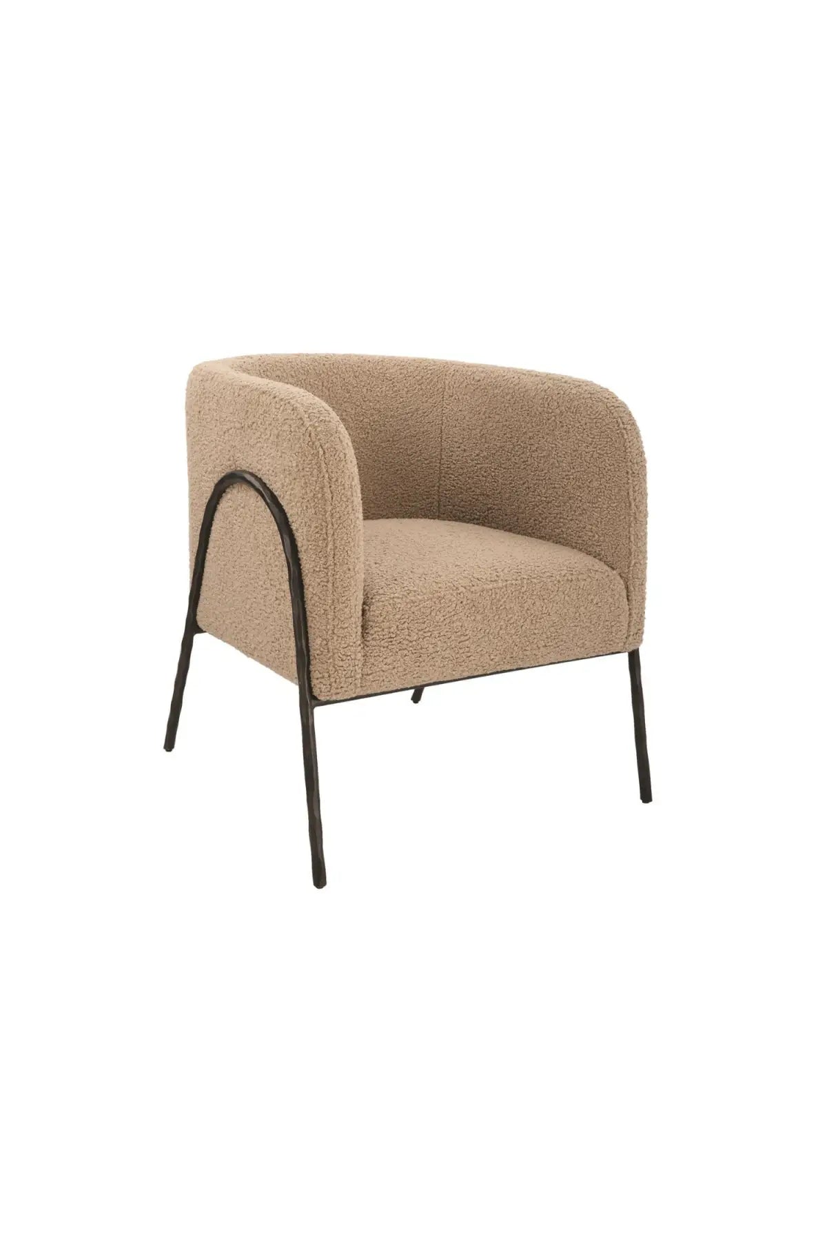Meet the Jacobsen Accent Chair. Inspired by Scandinavian designs, this barrel back style chair showcases warm latte faux shearling nestled in a curved chiseled iron frame finished in dark bronze.