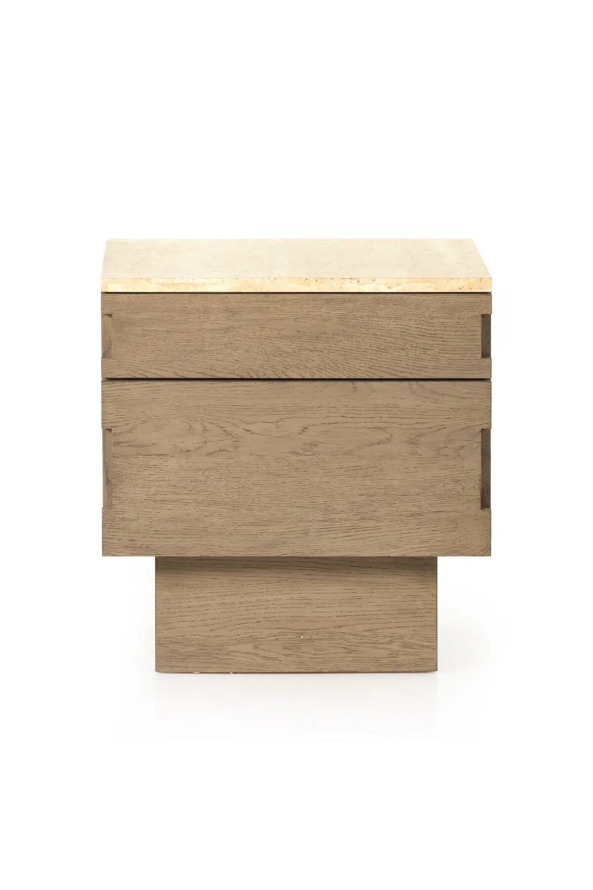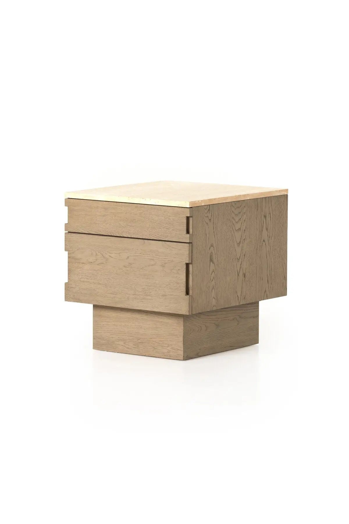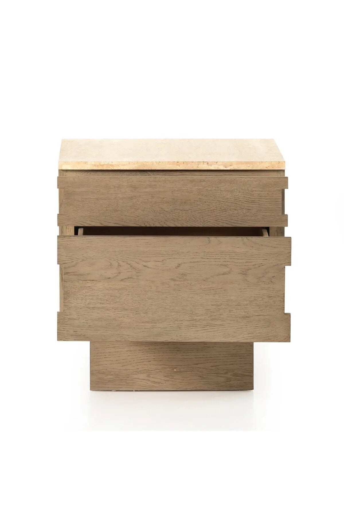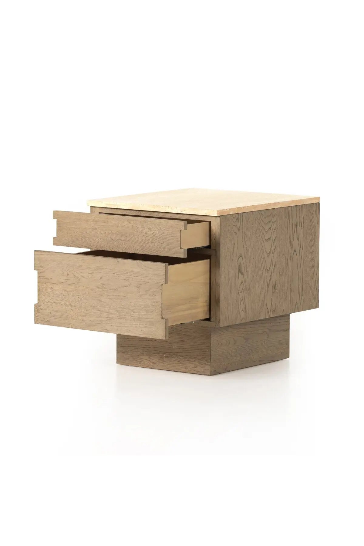 Meet the Jaylen Nightstand. Made from light-finished oak atop a plinth-style base, dual drawers bring extra storage space to the bedside, with a solid travertine top reflective of 1970s inspiration.