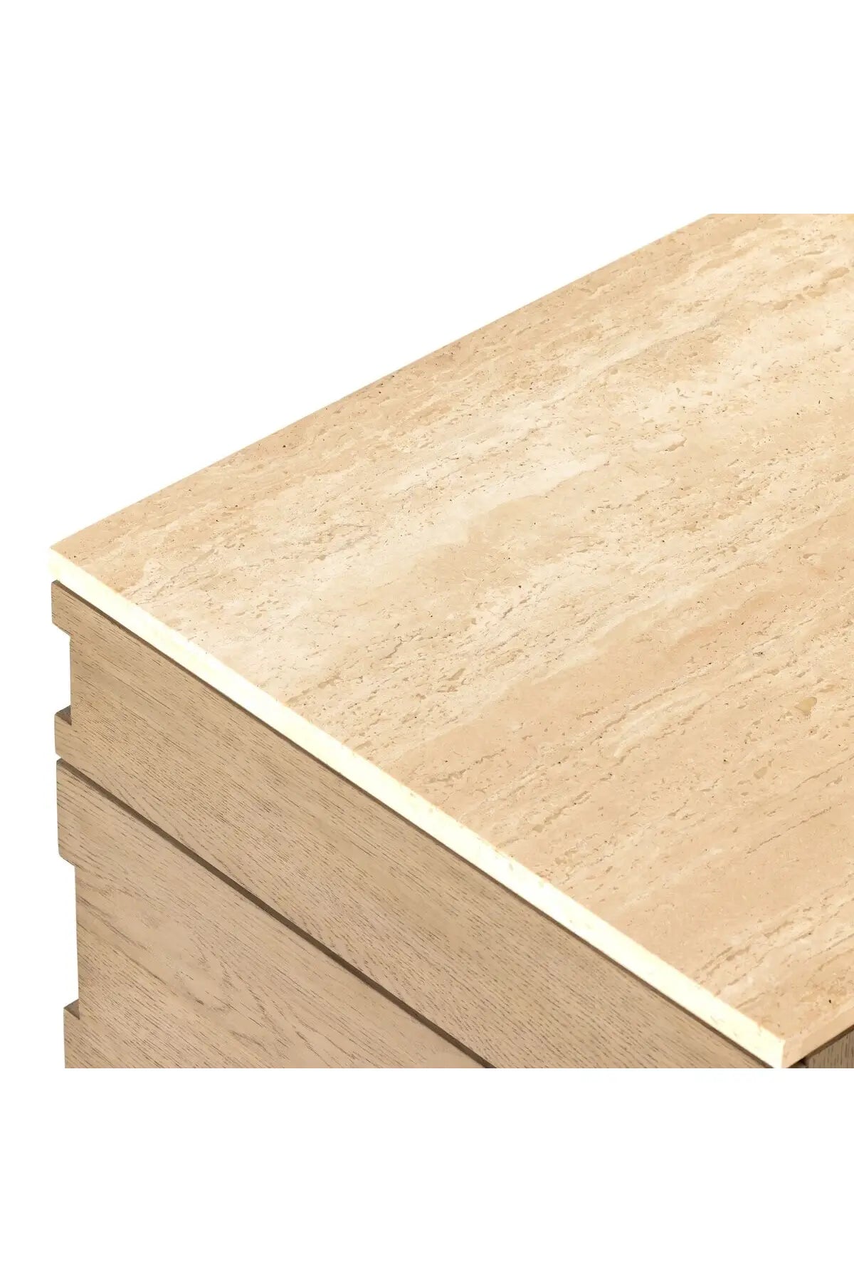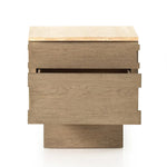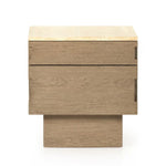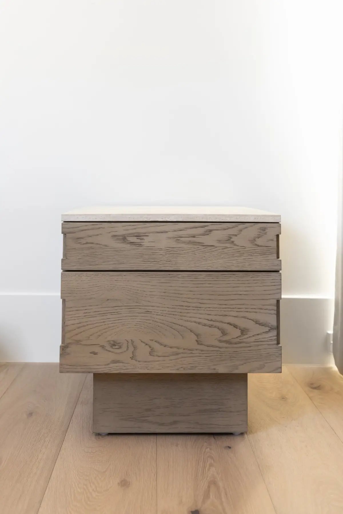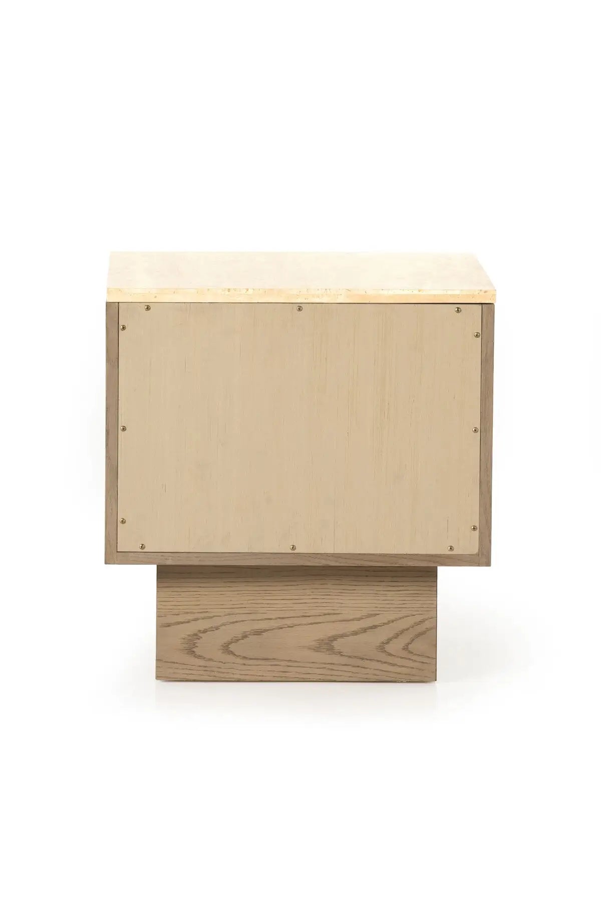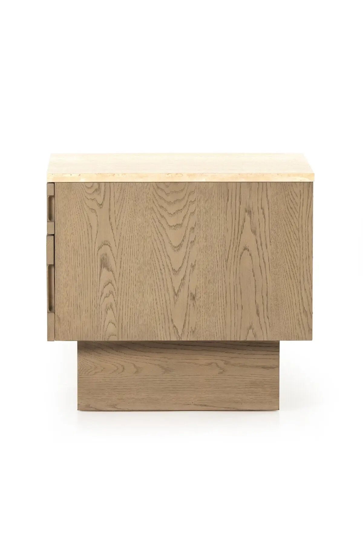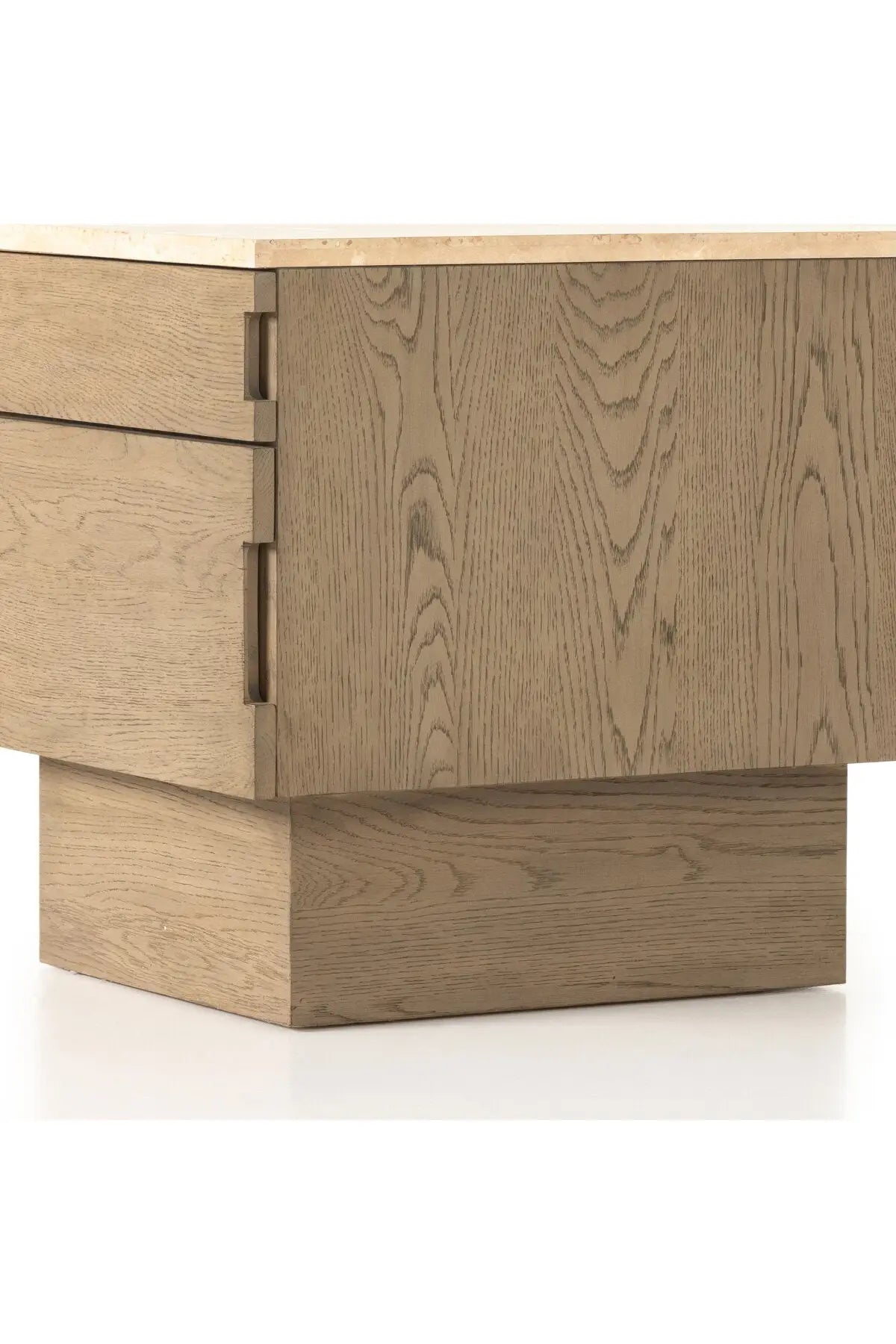 Meet the Jaylen Nightstand. Made from light-finished oak atop a plinth-style base, dual drawers bring extra storage space to the bedside, with a solid travertine top reflective of 1970s inspiration.