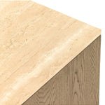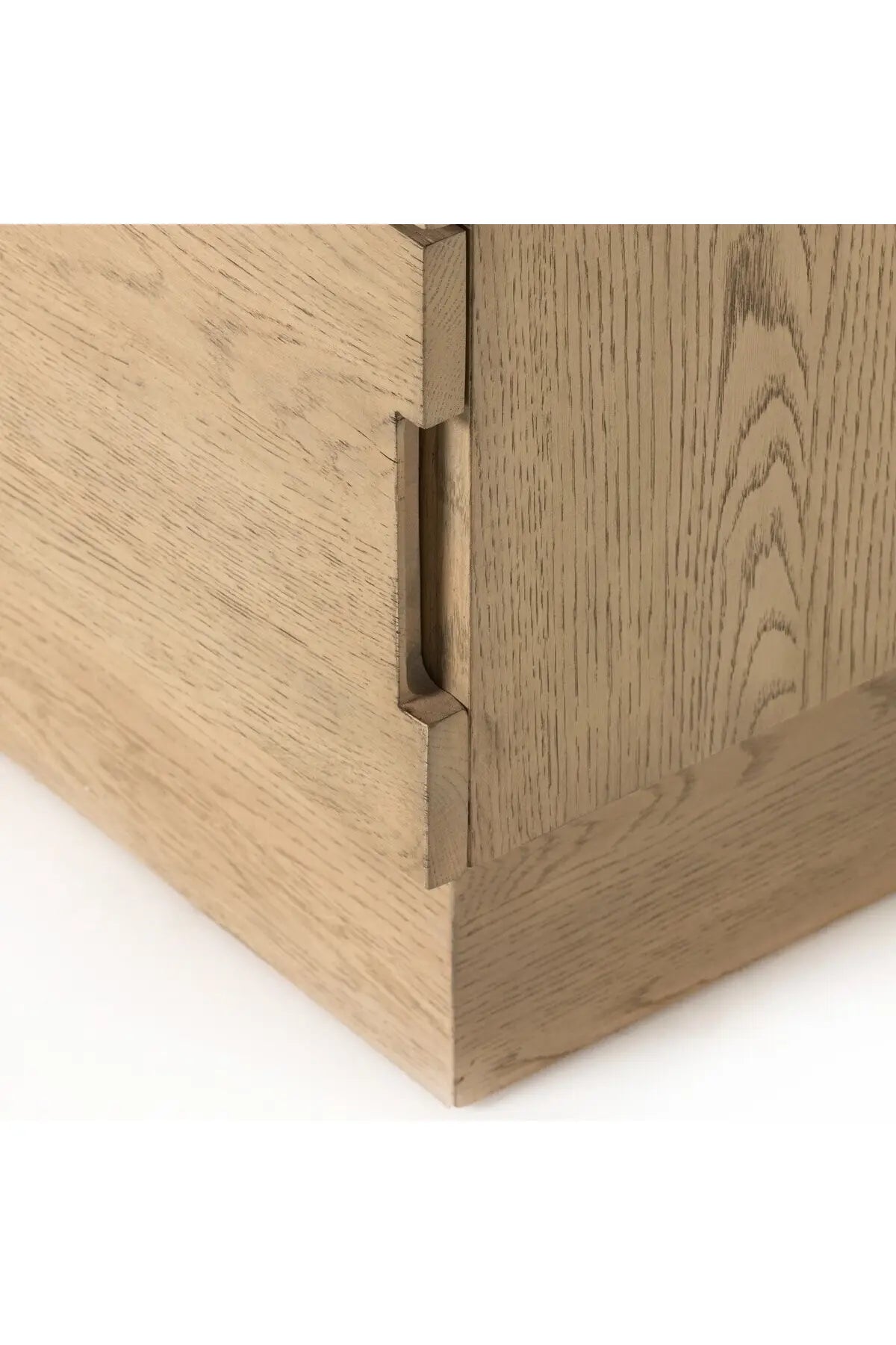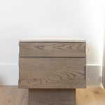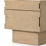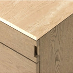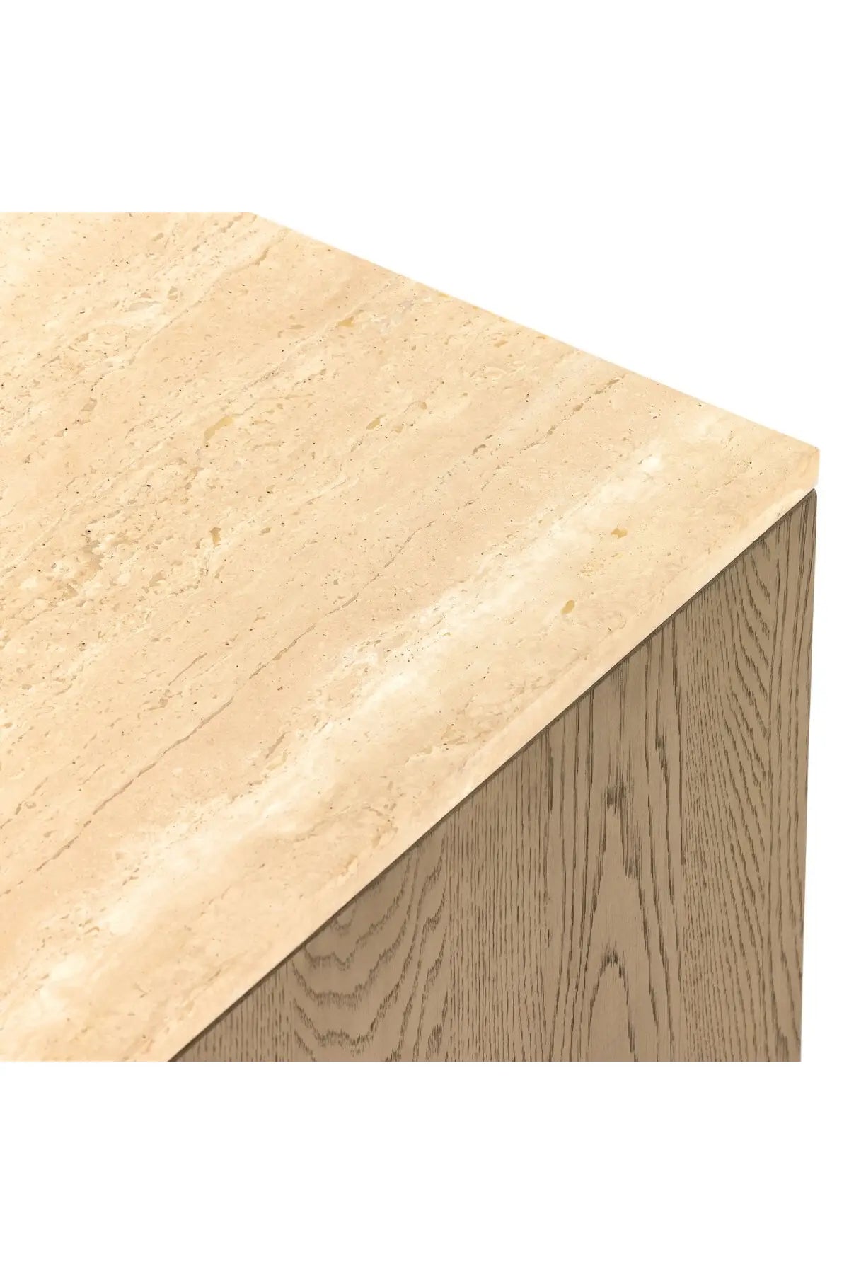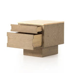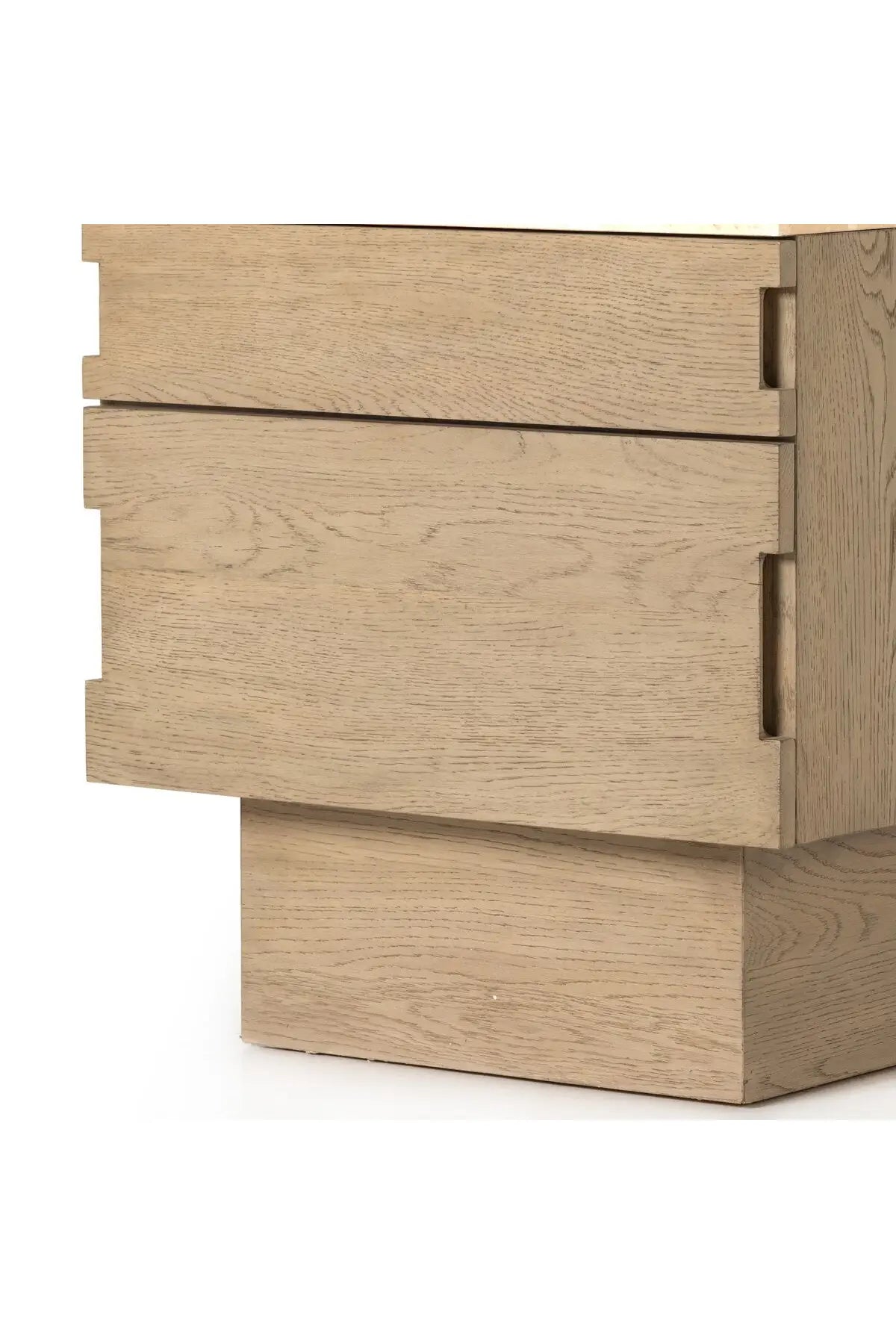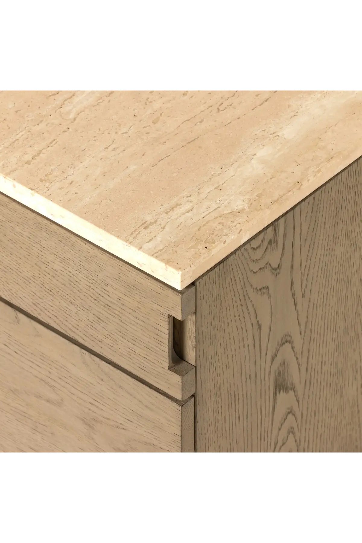 Meet the Jaylen Nightstand. Made from light-finished oak atop a plinth-style base, dual drawers bring extra storage space to the bedside, with a solid travertine top reflective of 1970s inspiration.