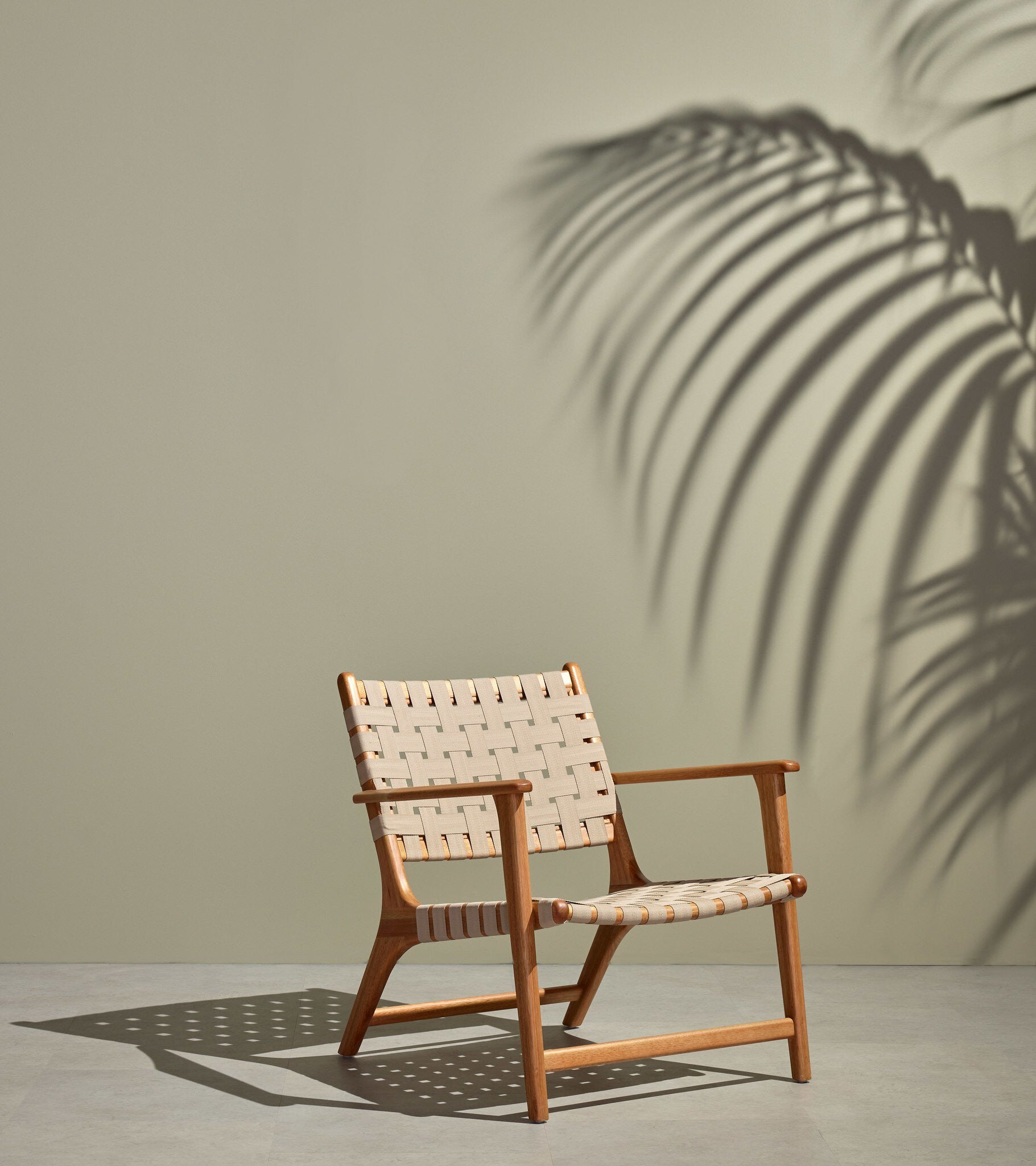 Meet the Jevon Outdoor Chair. Beige strap-style webbing lends a light, open look to outdoor-friendly seating framed out by FSC-certified eucalyptus in a subtle auburn. Cover or store indoors during inclement weather and when not in use.