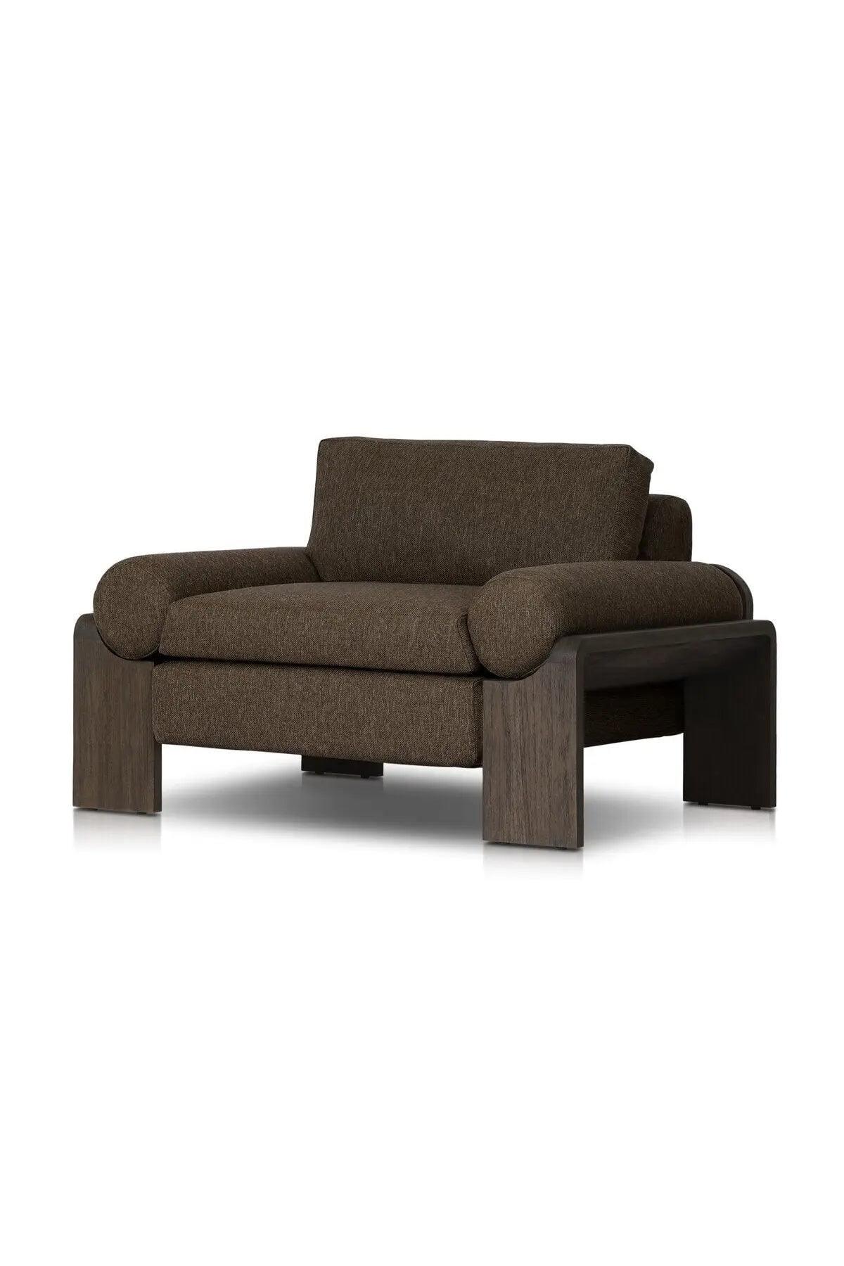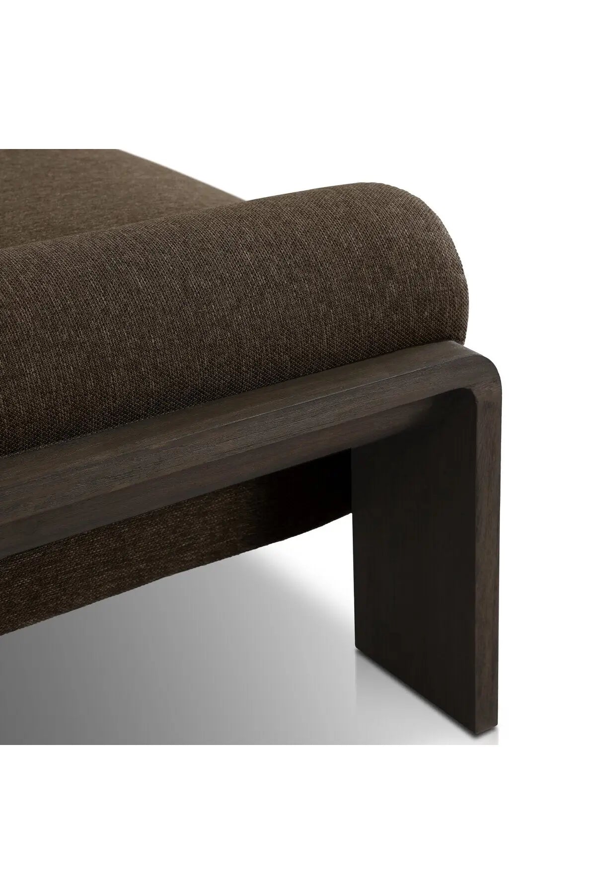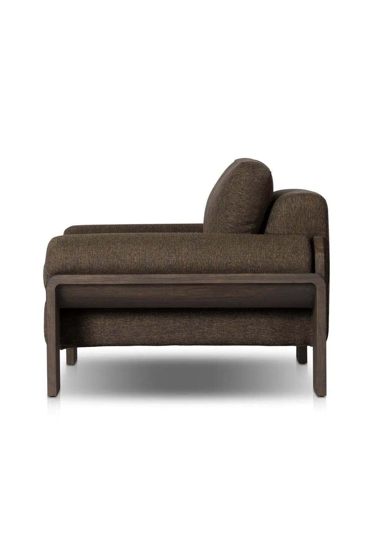 Heavy wood meets upholstery in the Potter Outdoor Chair. Loose bolsters cradle the fixed seat, adding a playful element to this bold, angular frame. The monochromatic look of textural deep brown fabric and saddle brown stained FSC®-certified teak ground the piece, accented with wide leg proportions and a box edge loose back pillow. Cover or store indoors during inclement weather and when not in use.
