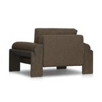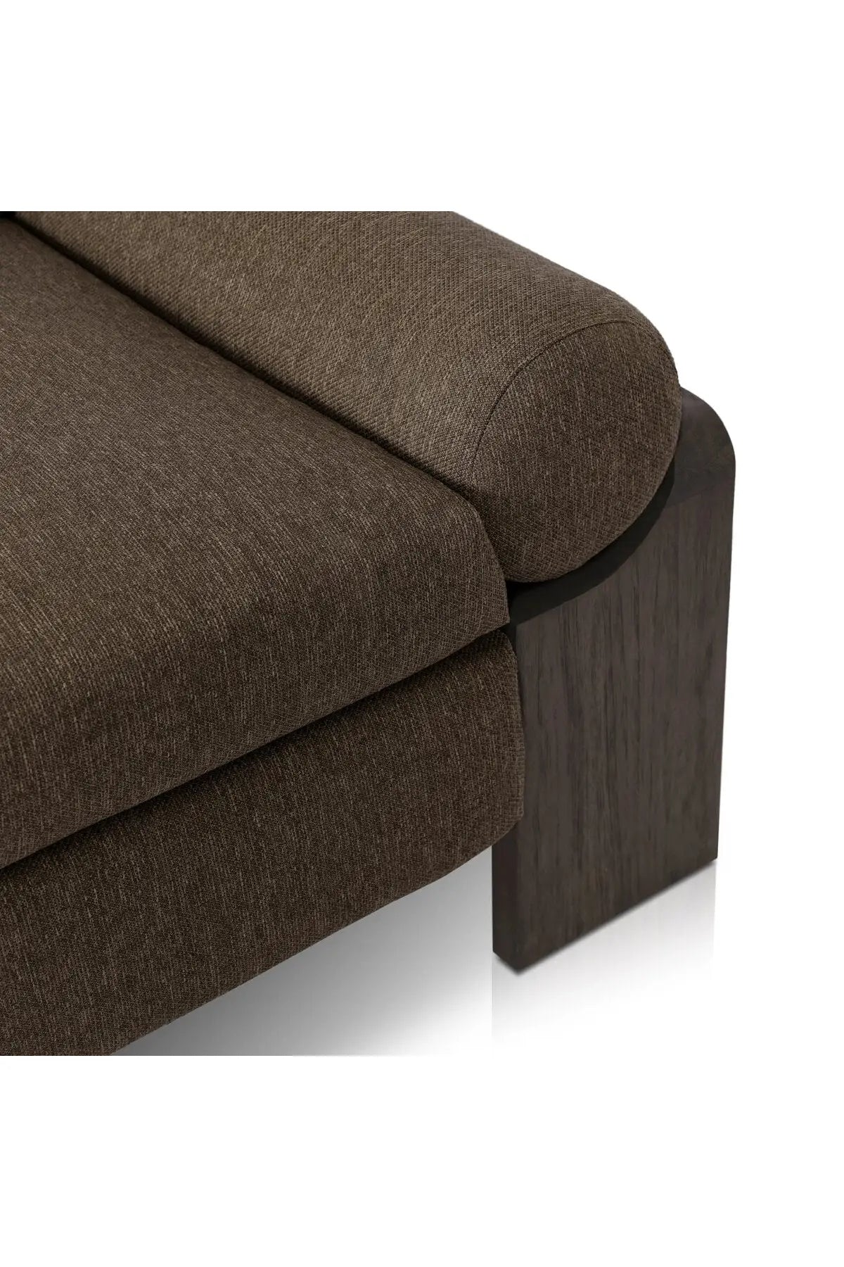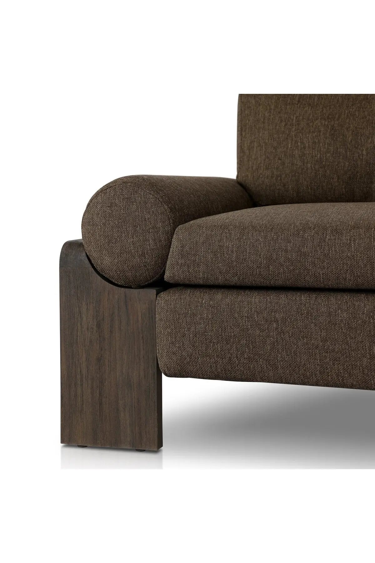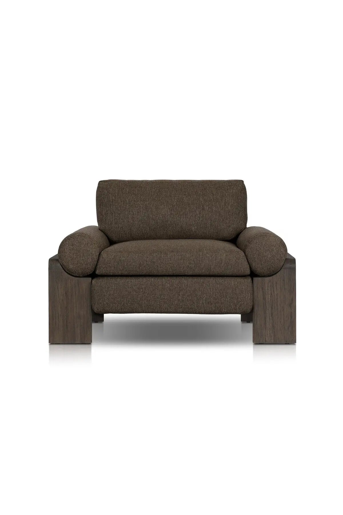 Heavy wood meets upholstery in the Potter Outdoor Chair. Loose bolsters cradle the fixed seat, adding a playful element to this bold, angular frame. The monochromatic look of textural deep brown fabric and saddle brown stained FSC®-certified teak ground the piece, accented with wide leg proportions and a box edge loose back pillow. Cover or store indoors during inclement weather and when not in use.