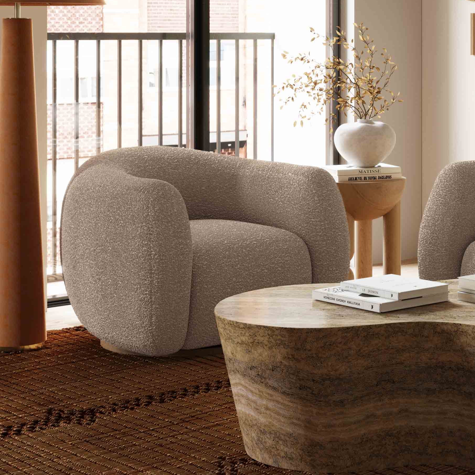 Introducing the Judy Boucle Swivel Chair, where comfort meets contemporary chic. Featuring solid wood legs and full foam construction. Wrapped in soft, thick yarn boucle, this piece boasts a delightfully thick curvature, adding an extra dose of style to your space without breaking the bank.