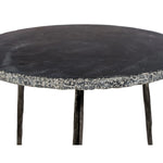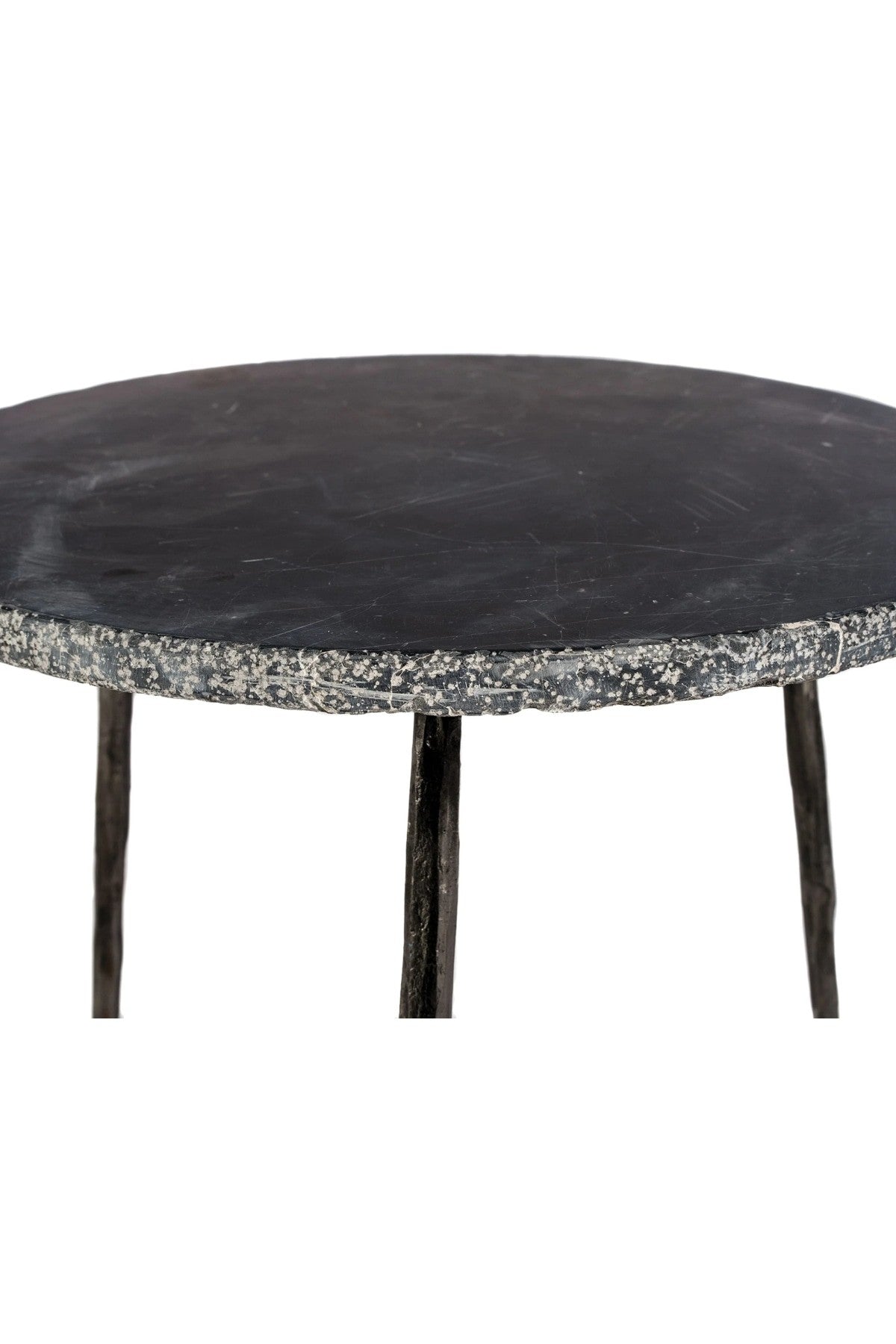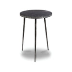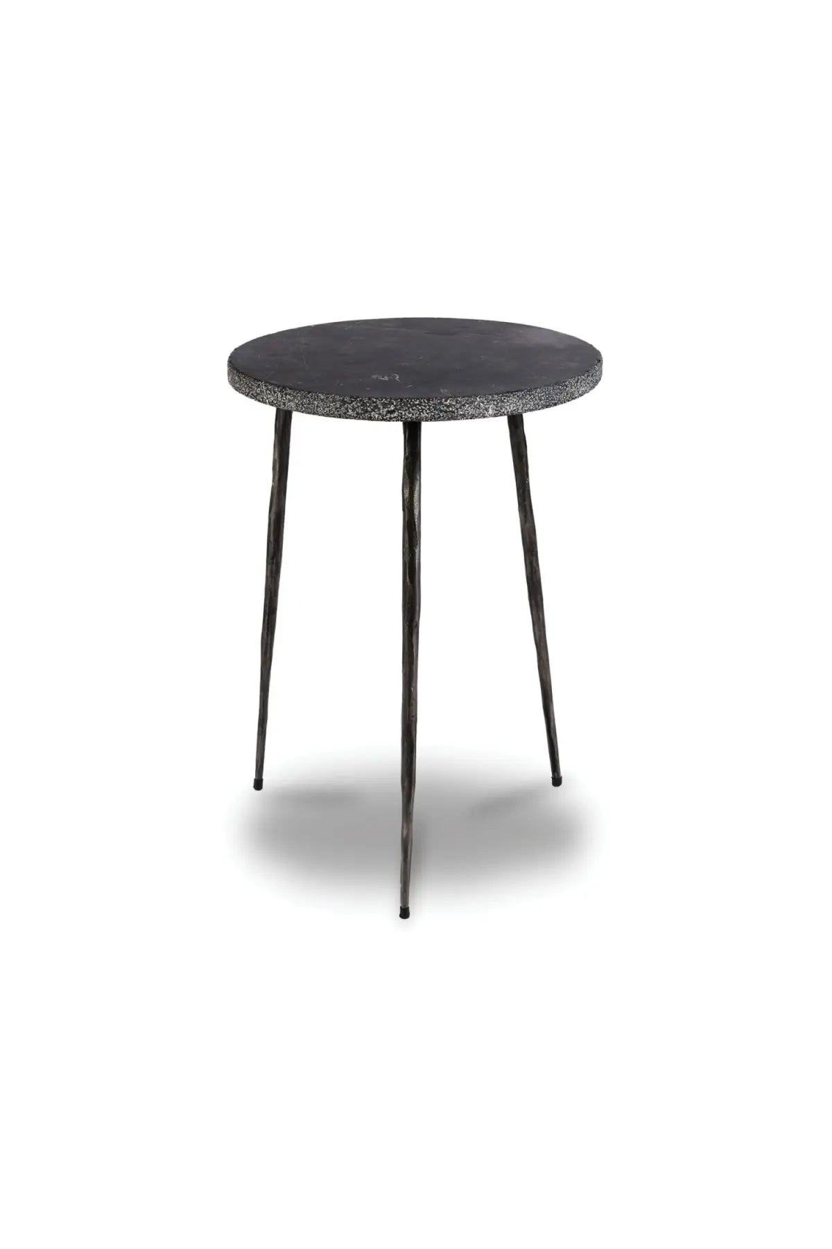 Raw materials meet industrial artisanal craftsmanship with the Kaii End Table. The Spanish Nero Marquina marble has a beautiful hammered pebbled rough edge and the black hand forged steel legs compliment it beautifully.