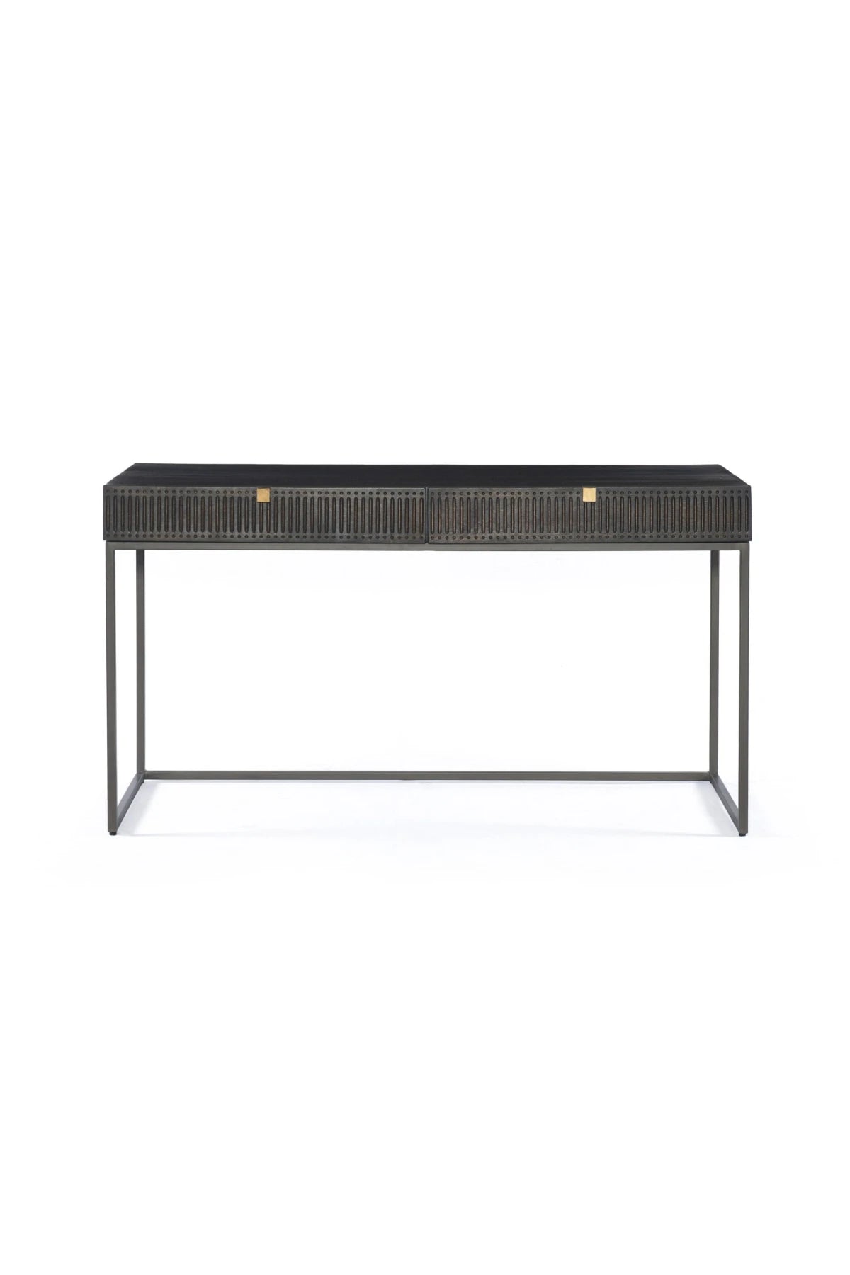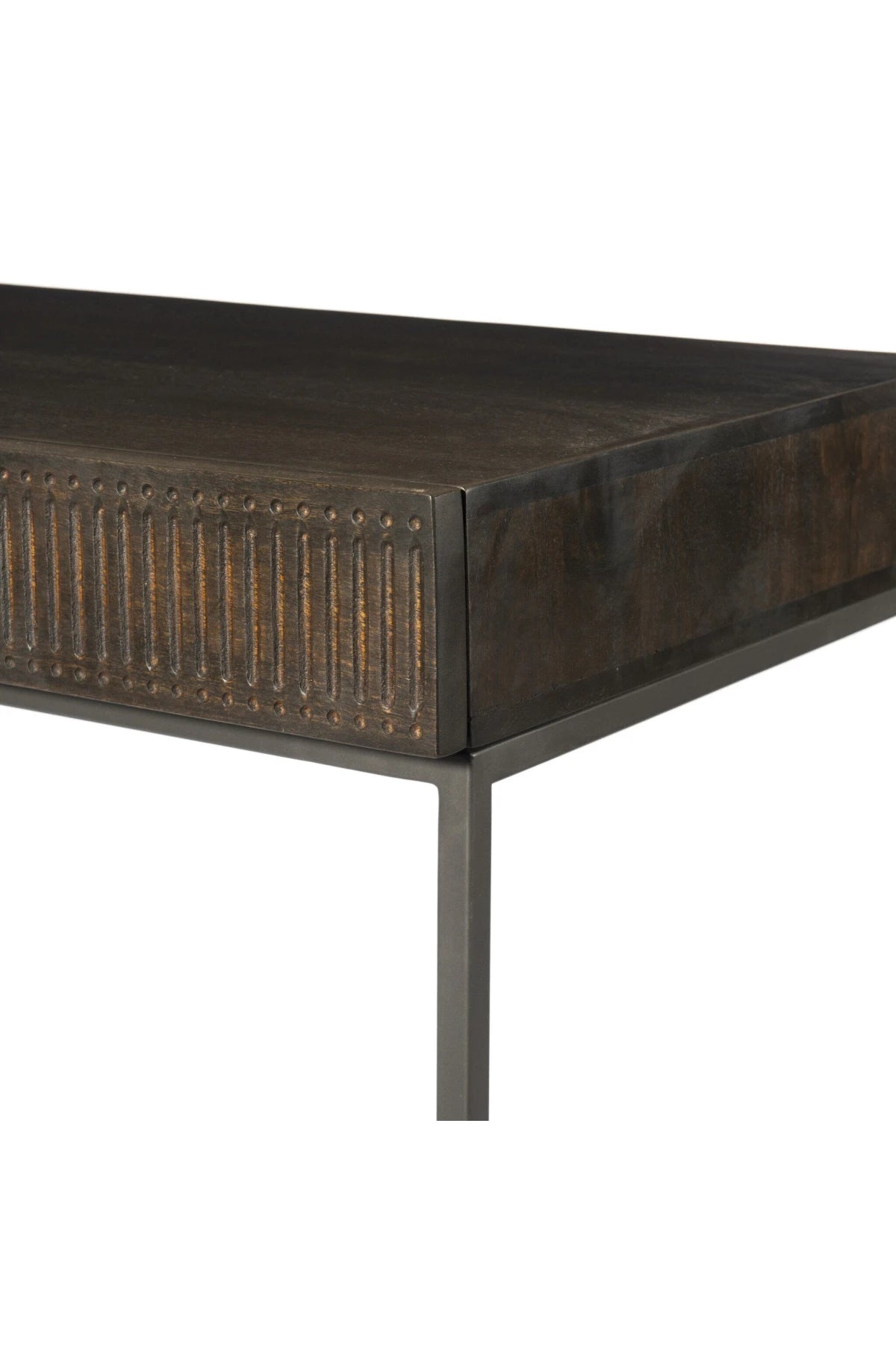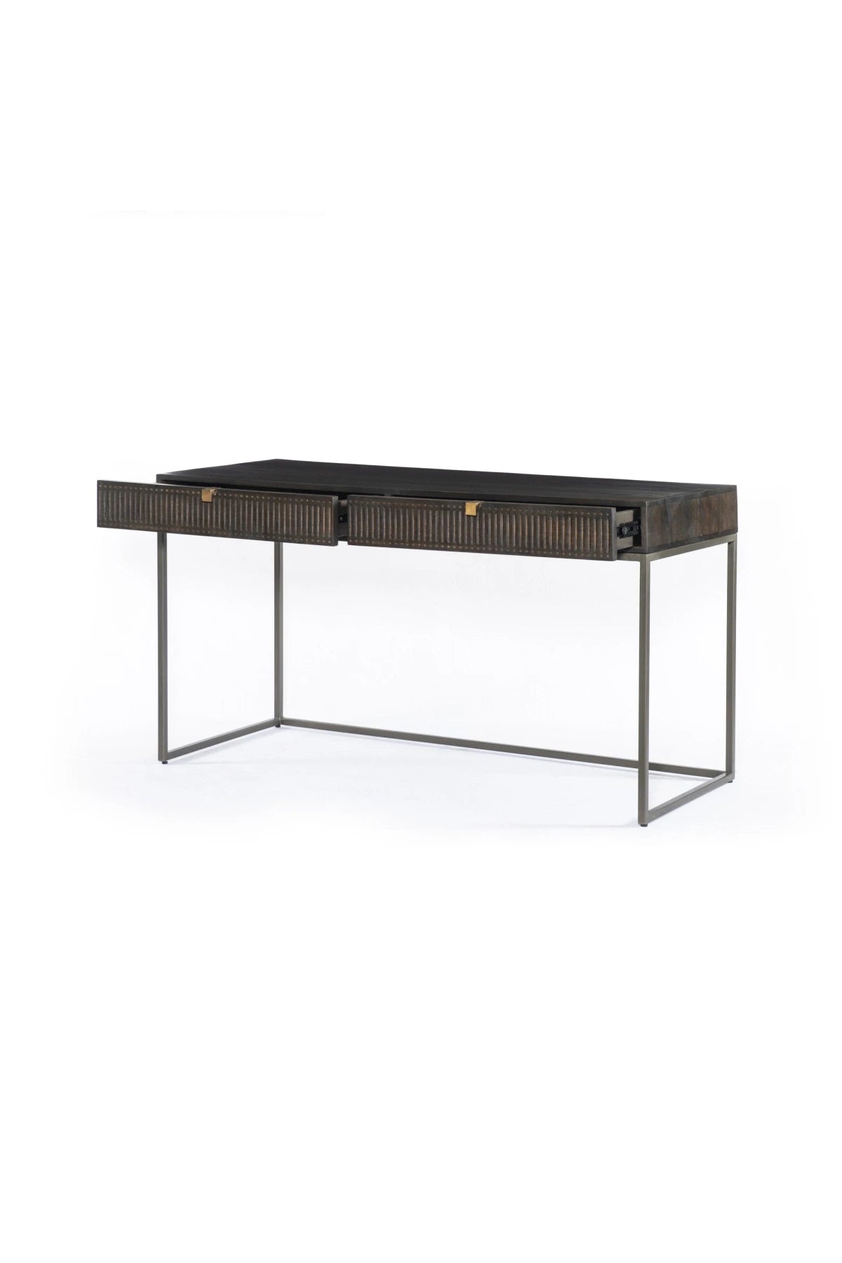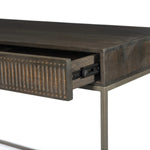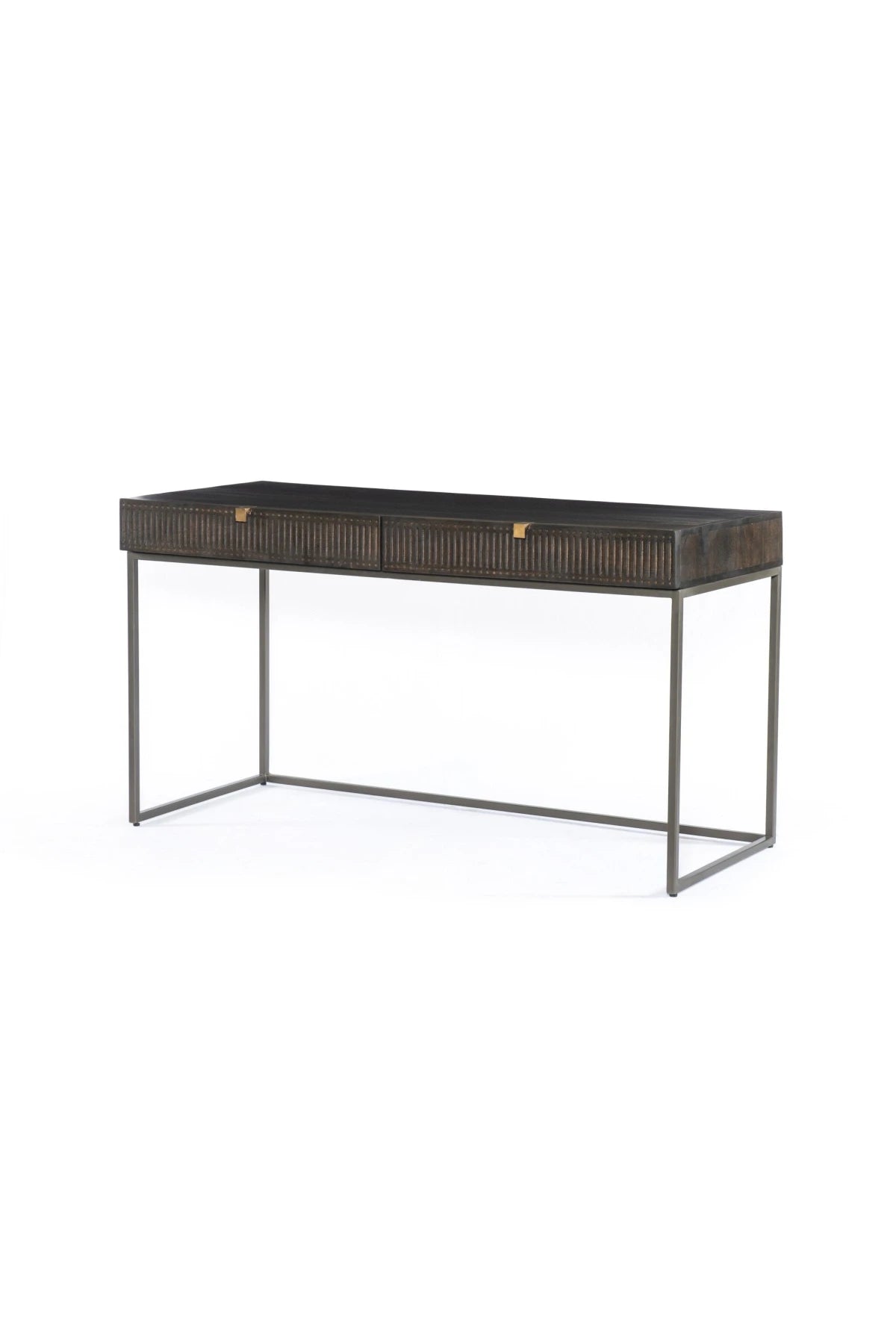 Meet the Kelby Writing Desk. Unique linear carving meets fresh dimension with an artisan slant in the Kelby Writing Desk. Mango wood casing is finished in a vintage brown, highlighting texture and high craftsmanship. A slim iron base adds a long, airy look, while dual drawers keep desk necessities on hand.