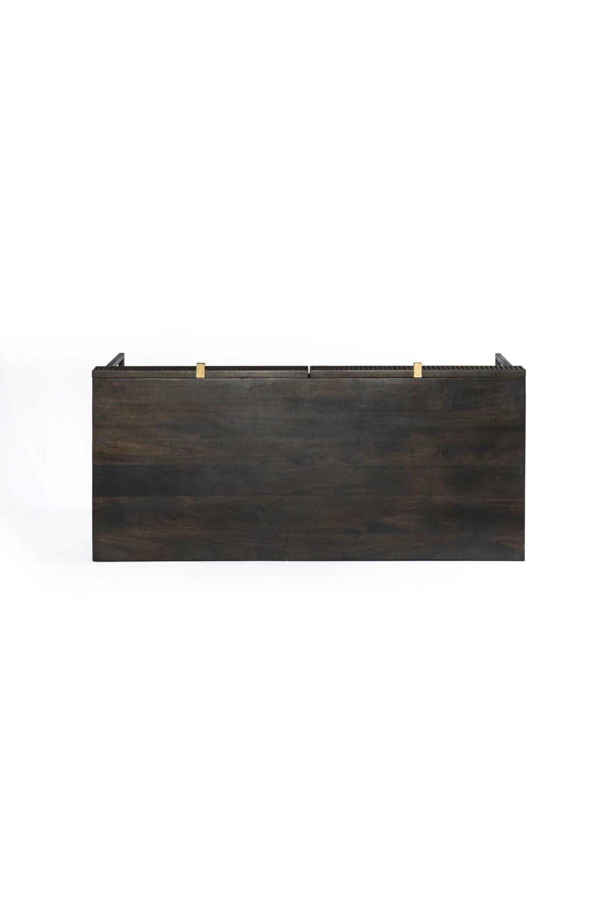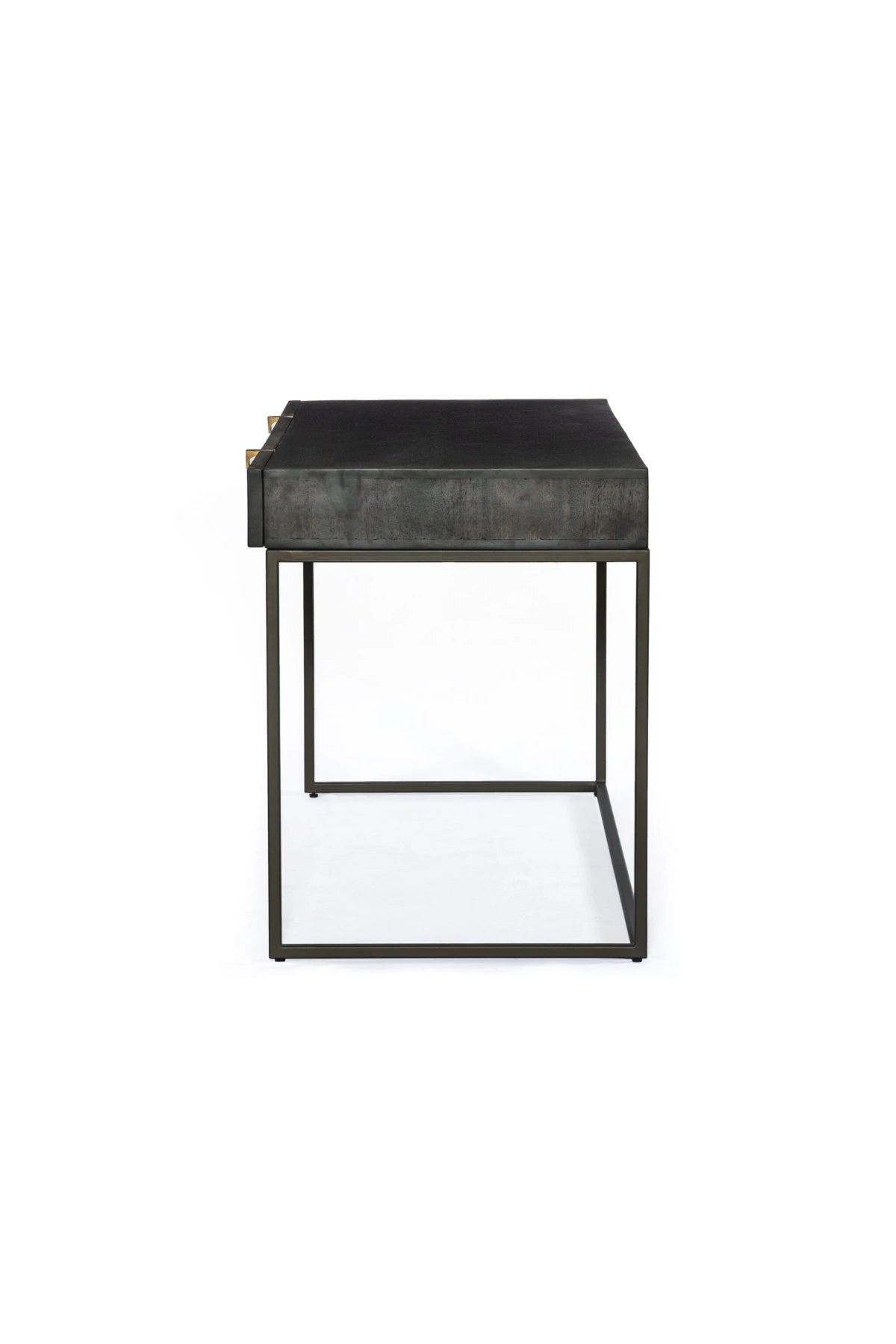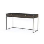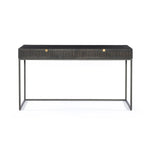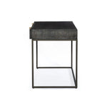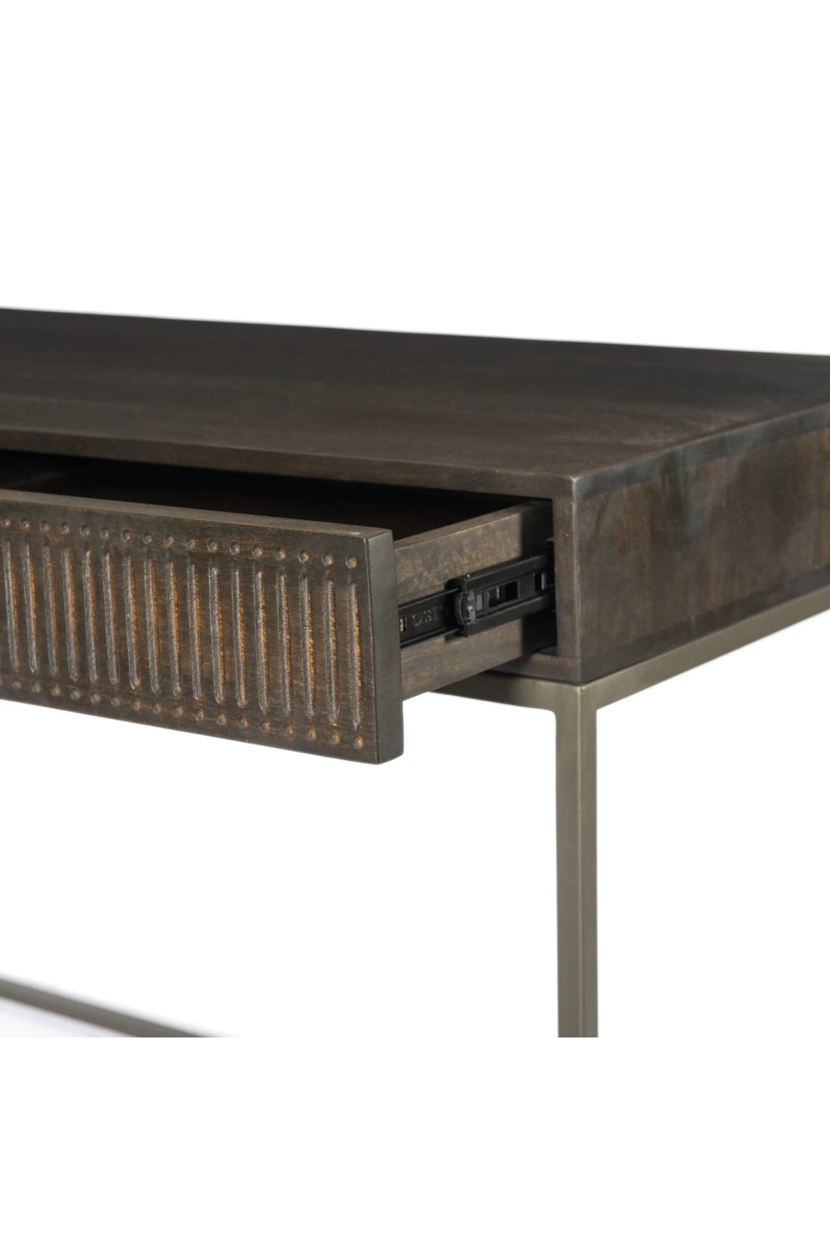 Meet the Kelby Writing Desk. Unique linear carving meets fresh dimension with an artisan slant in the Kelby Writing Desk. Mango wood casing is finished in a vintage brown, highlighting texture and high craftsmanship. A slim iron base adds a long, airy look, while dual drawers keep desk necessities on hand.