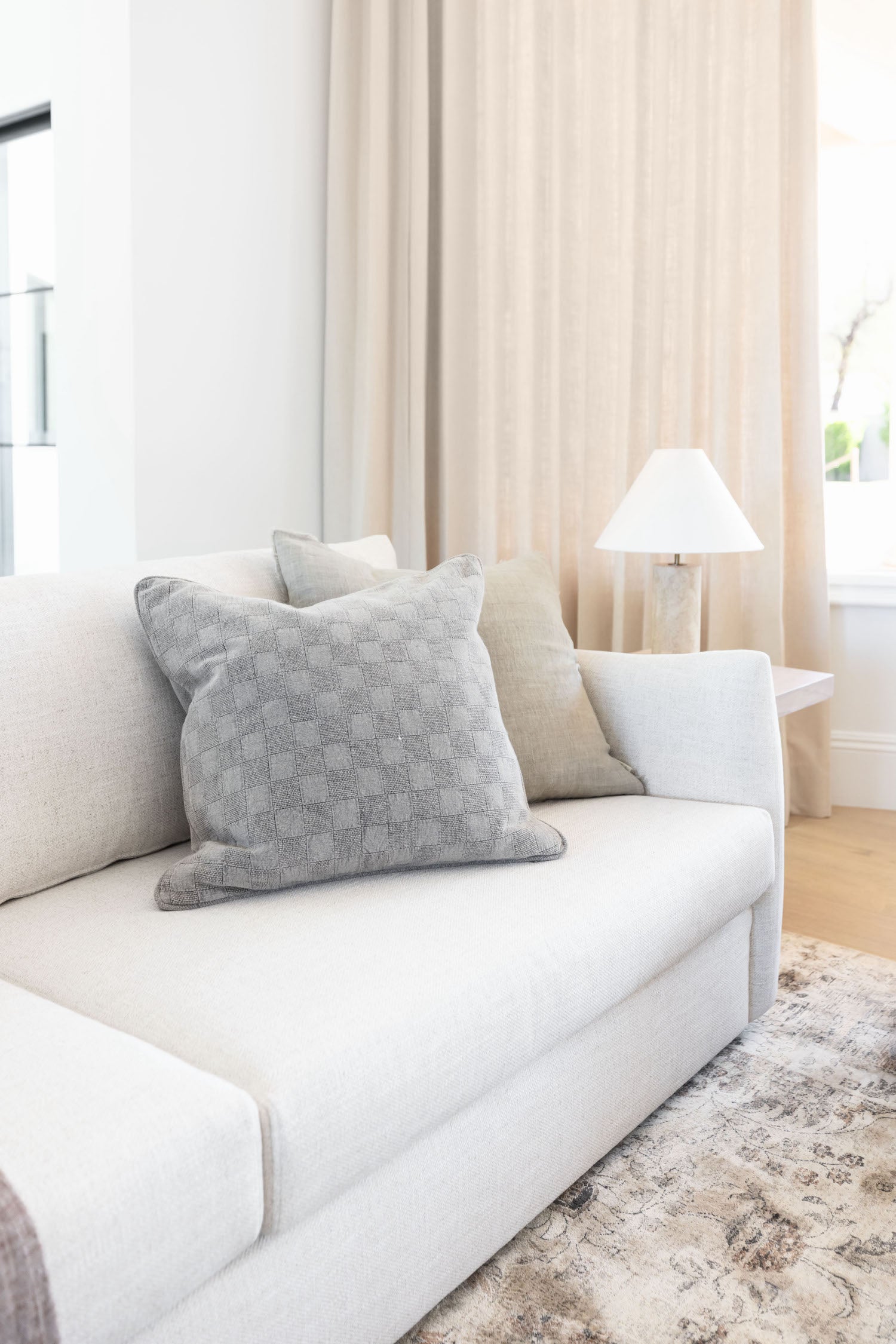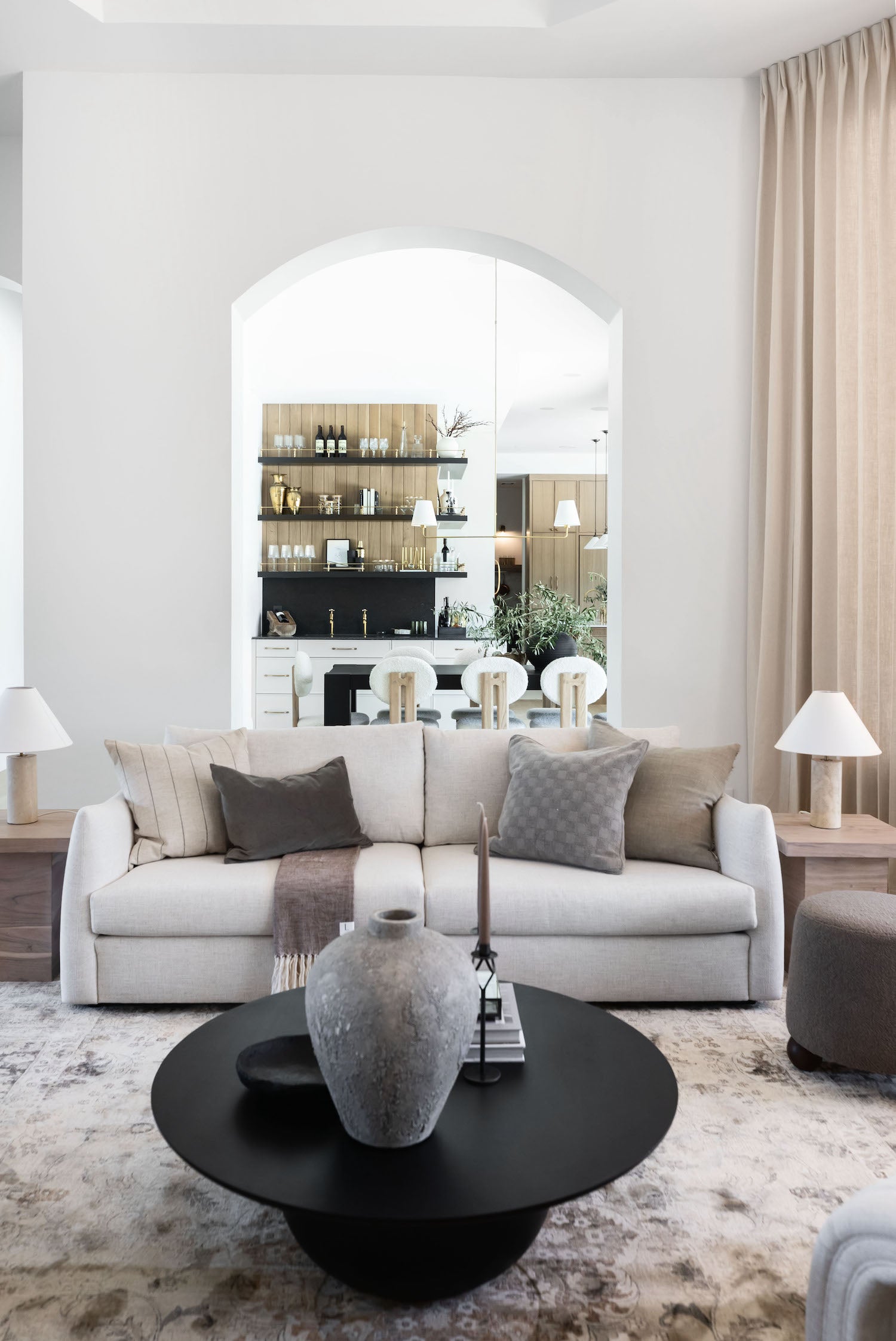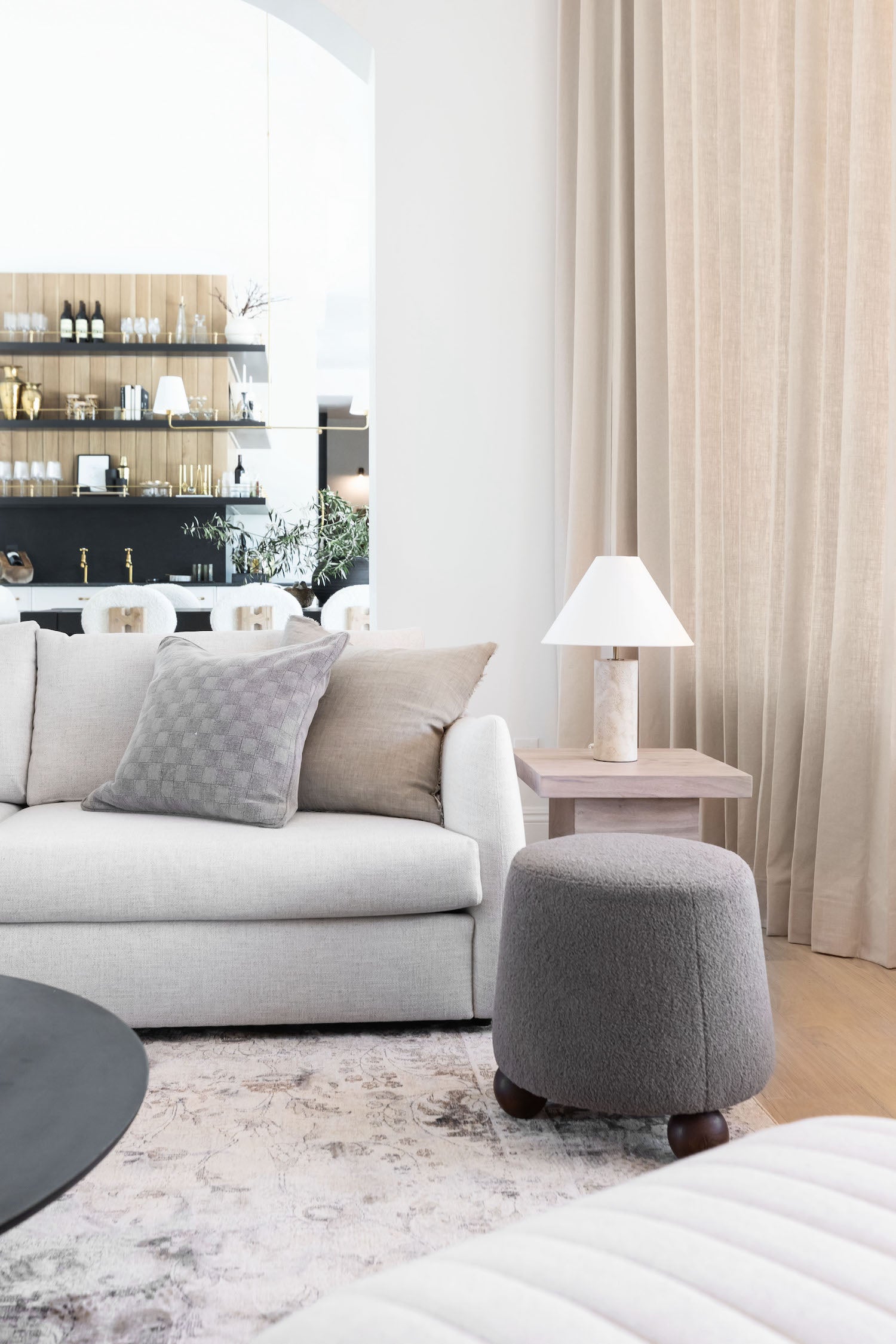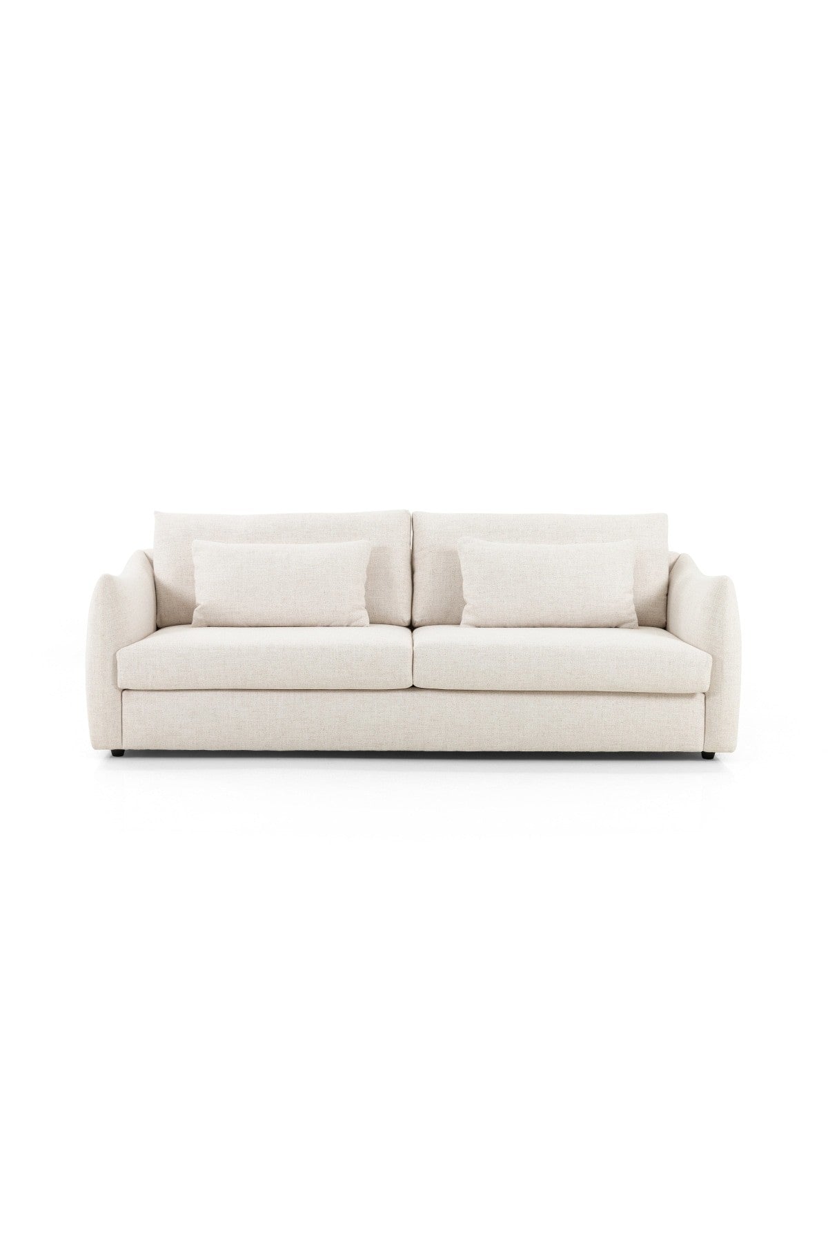 The Kelsey Sofa is designed to mimic the body's resting silhouette, scalloped sides refresh the traditional track-arm sofa, with off-white upholstery and double-stacked back cushions for comfort. Performance fabrics are specially created to withstand spills, stains, high traffic and wear, ensuring long-term comfort and unmatched durability.