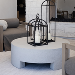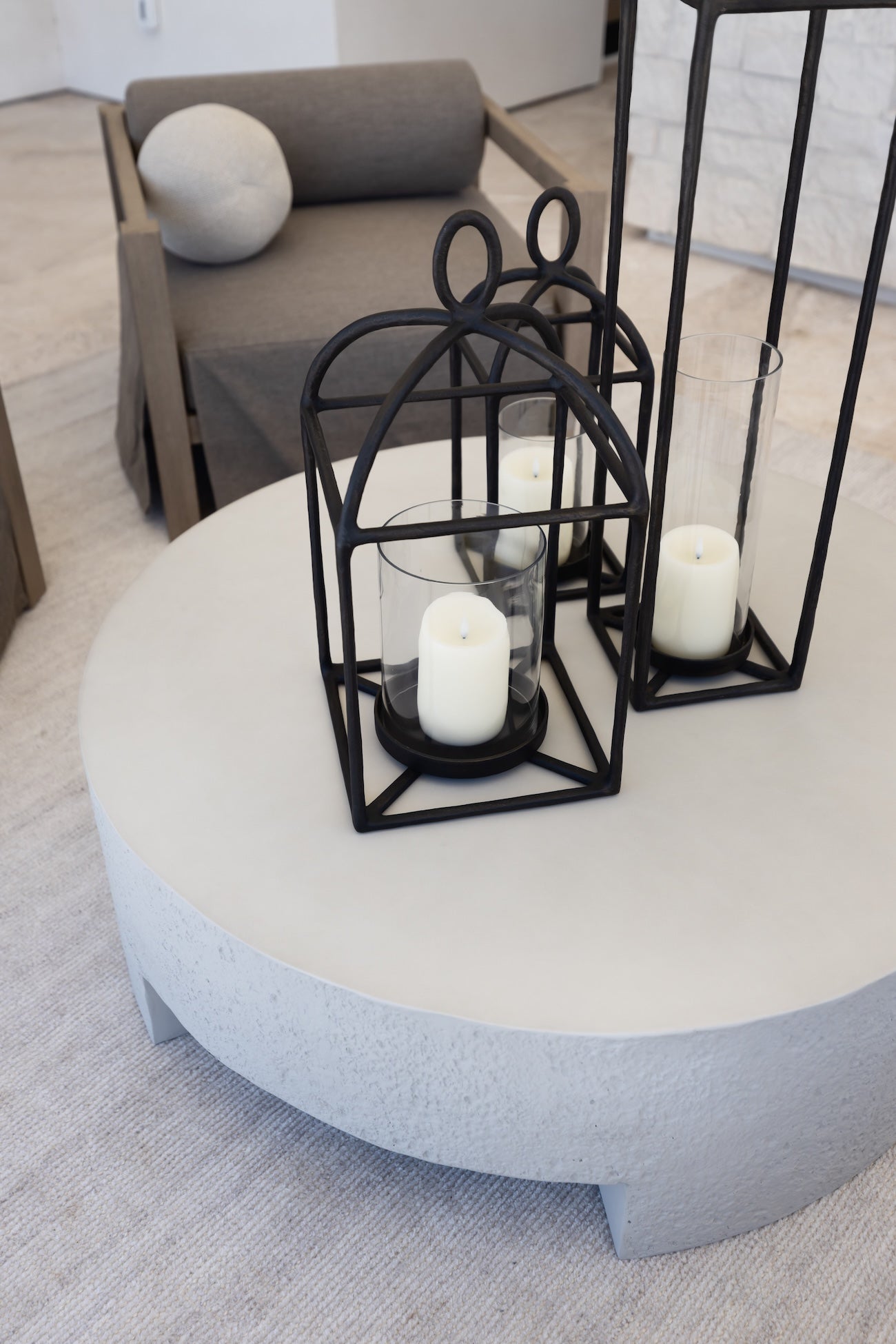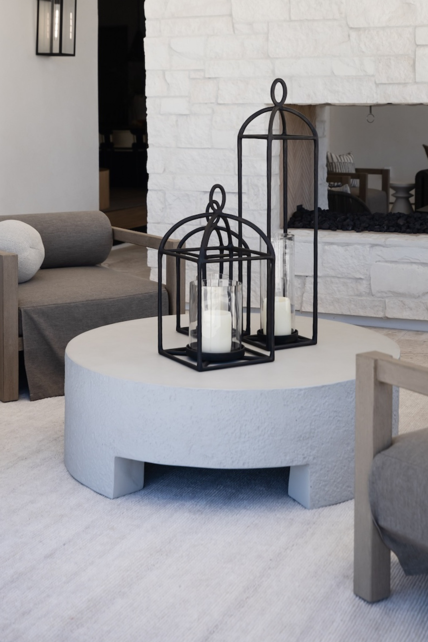 Meet the Kember Outdoor Coffee Table. Heavy texture of pumice concrete with a smooth top sets this up as an essential transitional piece for any outdoor style. A statement cylindrical shape lifted by cutout legs contrasts bold design with an airy lightness. Cover or store indoors during inclement weather and when not in use.