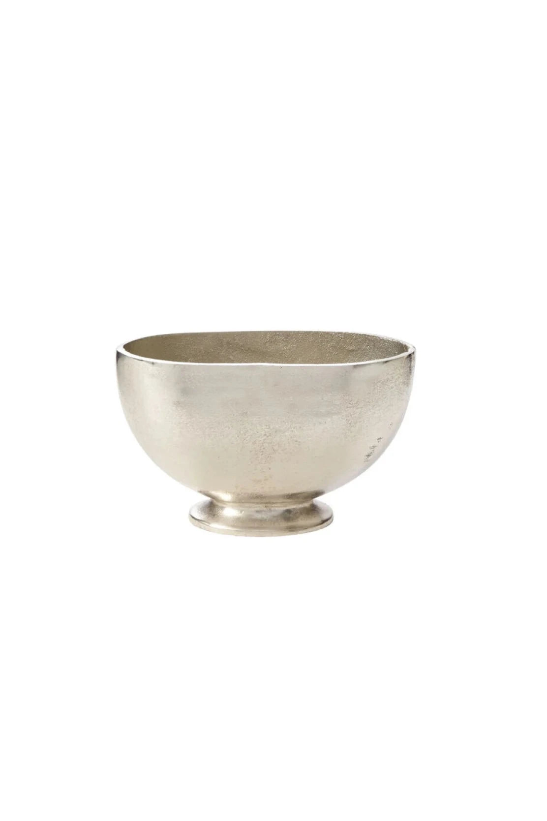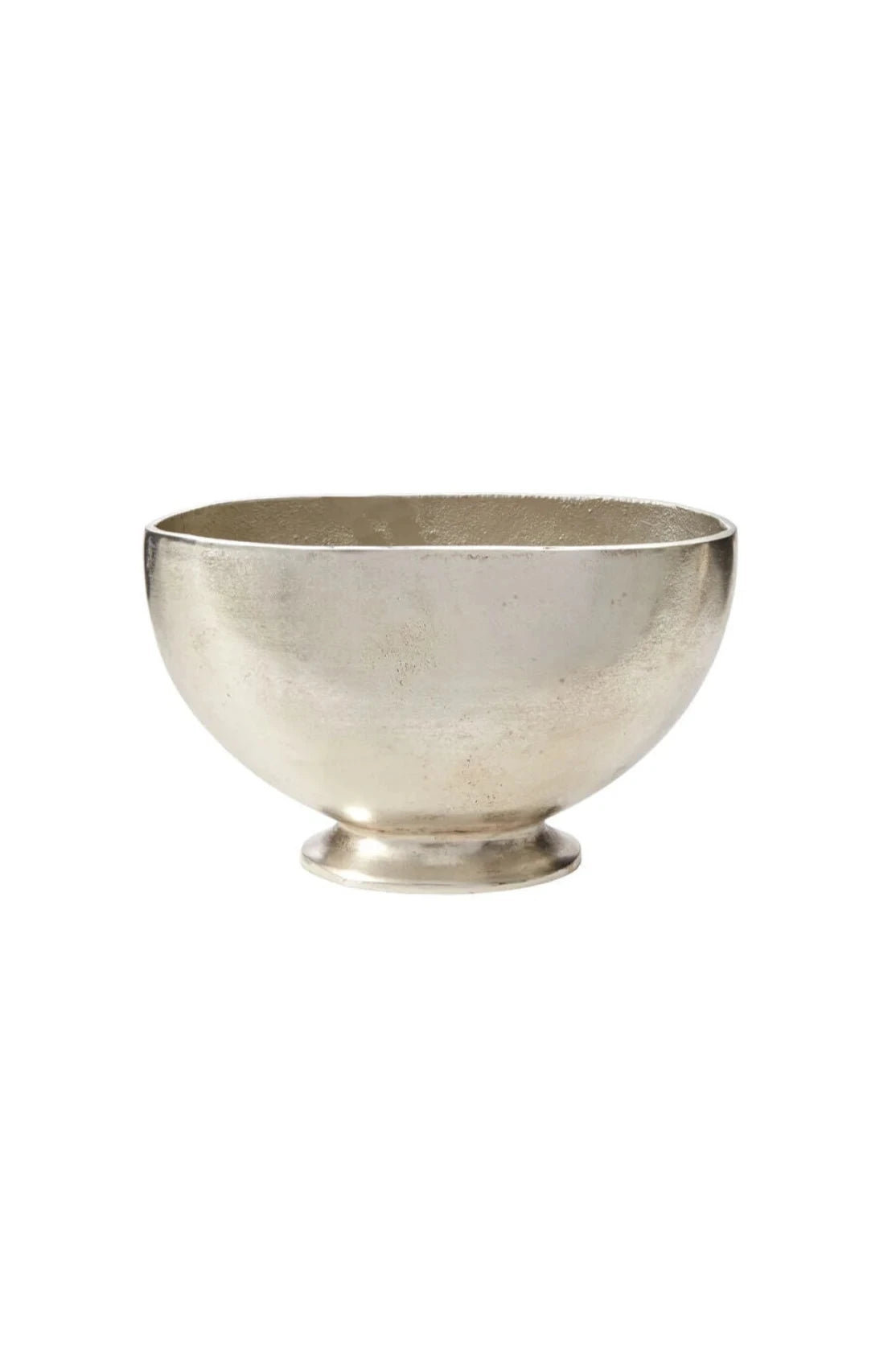 Bring sleek sophistication & visual impact to any table setting with the small, silver aluminum Khan Bowl. This oblong bowl with its cool tone, low foot, & rounded sides makes a striking wedding & event centerpiece with any tone of florals. A slim opening requires fewer stems to create a lush arrangement.