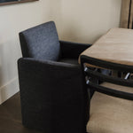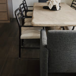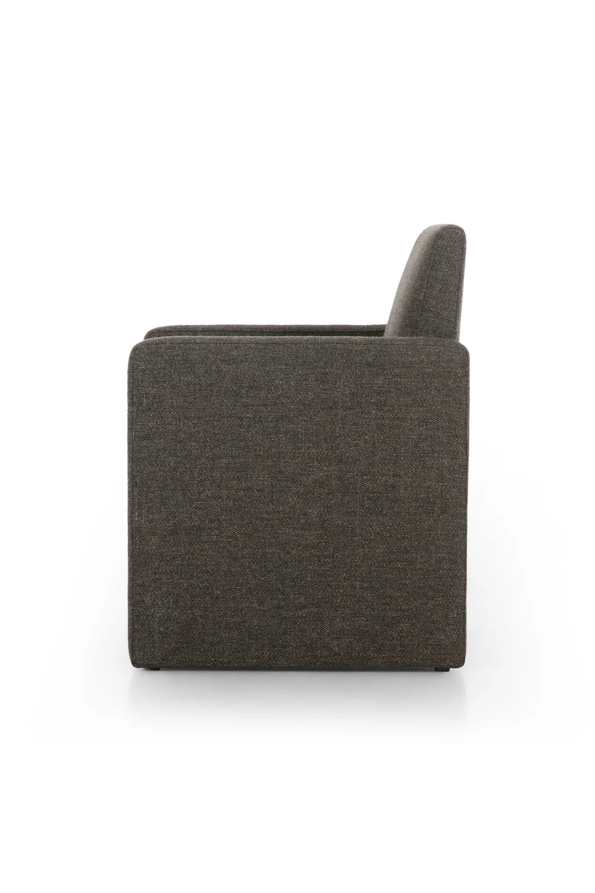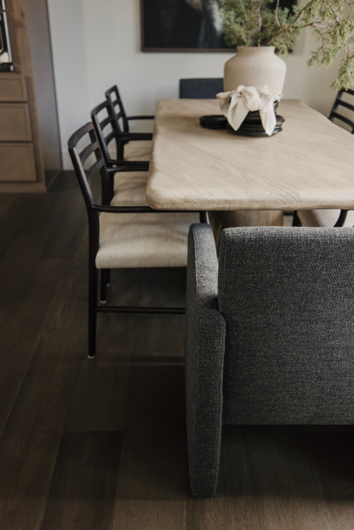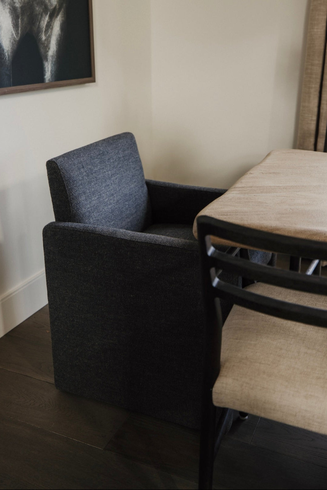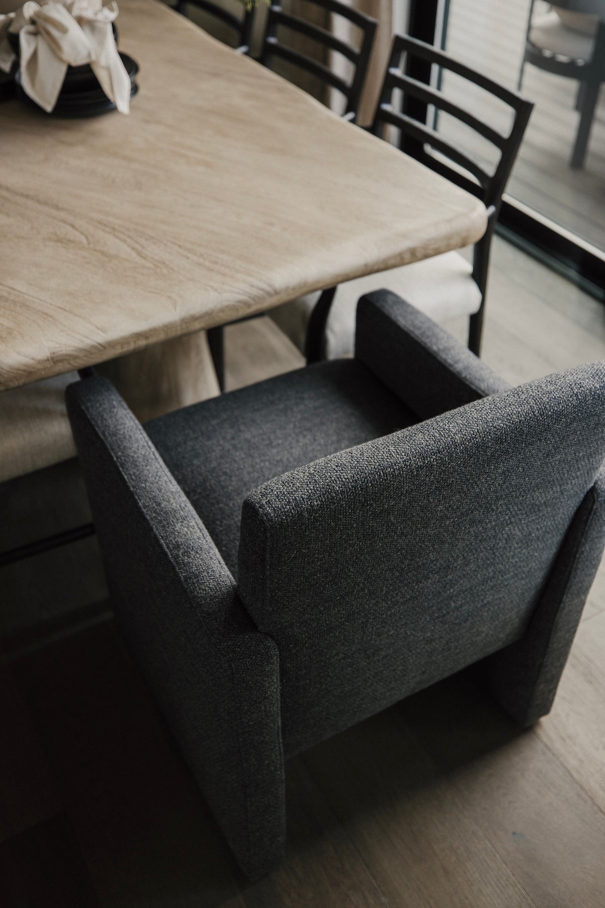 Meet the Kima Dining Chair. Think outside the box for everyday dining. Ash-colored performance fabric covers a soft, voluminous shape with oversized proportions.