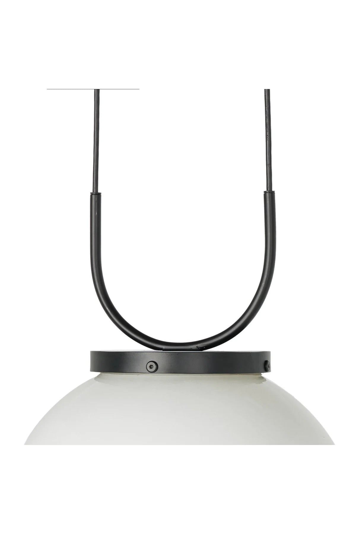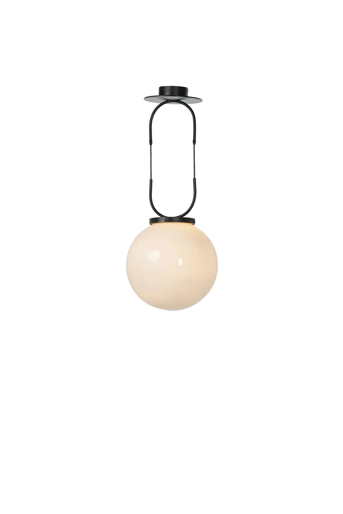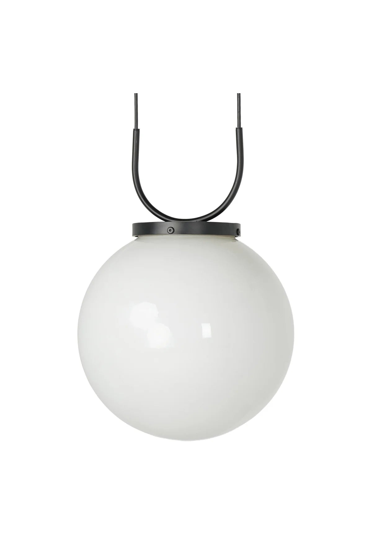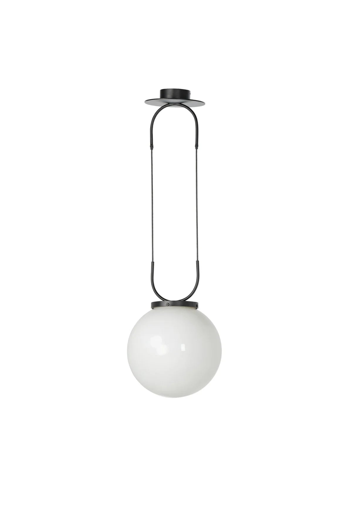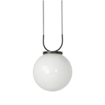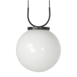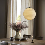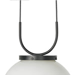 Meet the Kincaid Pendant. A large, milk glass-style globe shapes a striking pendant suspended by slim, curved metal with black fabric cording, which adjusts for customizable length. The 16" sphere diffuses a soft, ambient glow.