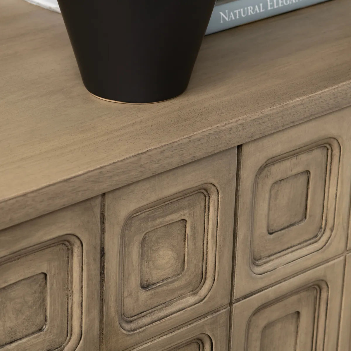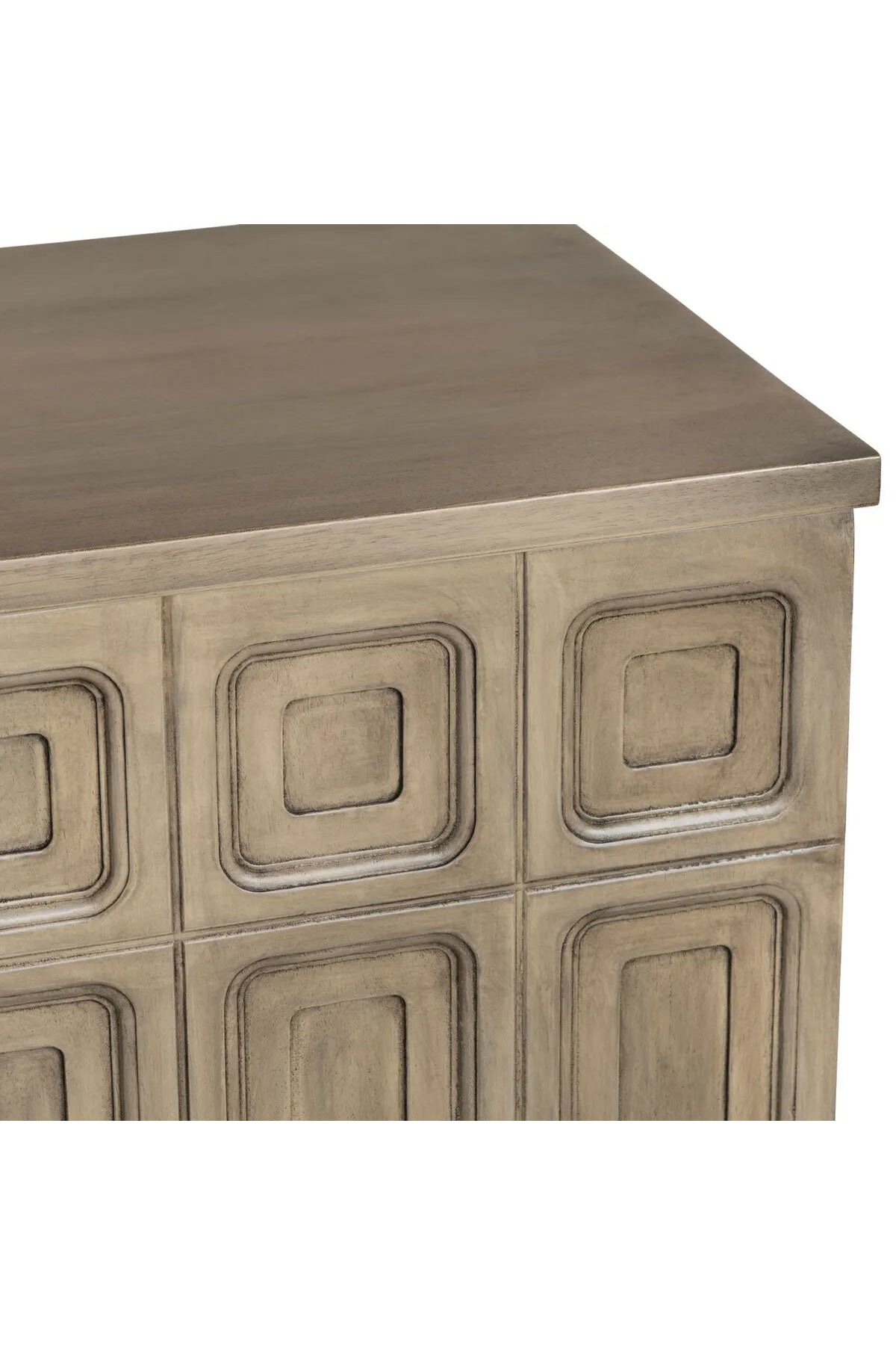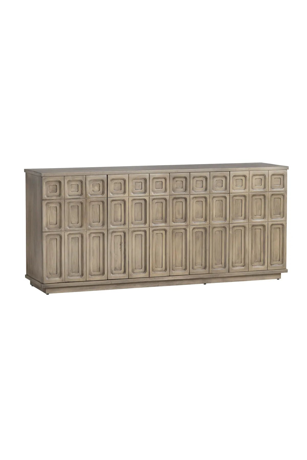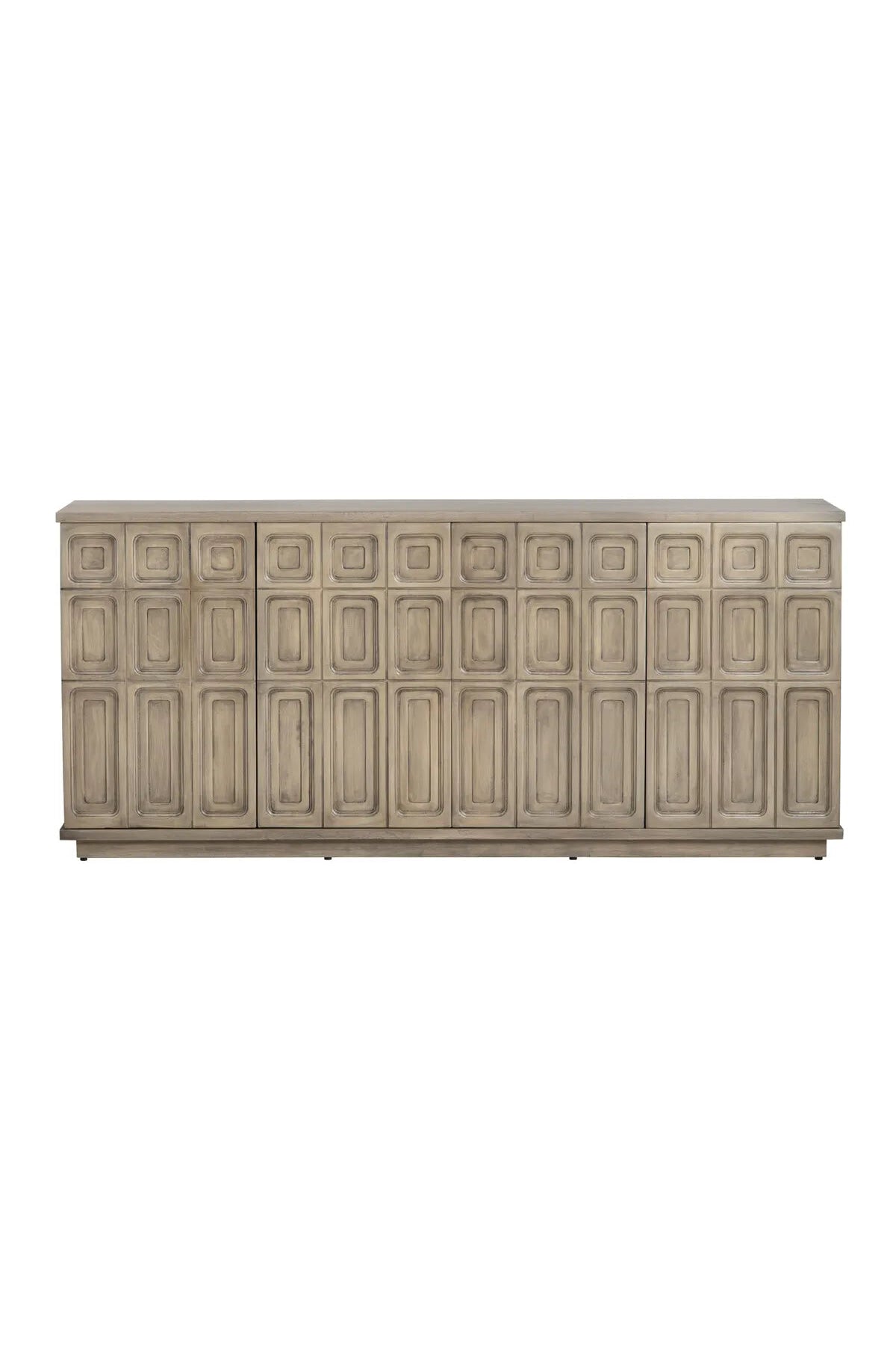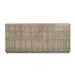 The Kinsley 4-Door Sideboard features a design with a light, weathered wood finish. The front is adorned with a repeating pattern of raised, rectangular panels, adding texture and visual interest. Its substantial size makes it ideal for storage and display in a living room, hallway, or dining area.