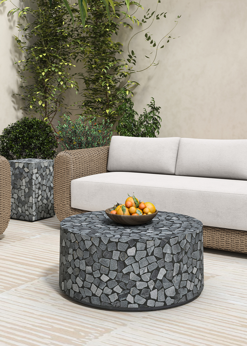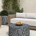 The Kiri Outdoor Coffee Table features individual pieces of marble meticulously placed by hand in a concrete mold. After setting, the surface is polished to enhance the inherent luster of the marble amidst the sturdy concrete matrix. The deliberate arrangement allows the character of the natural stone and concrete blend to define its minimalistic design.
