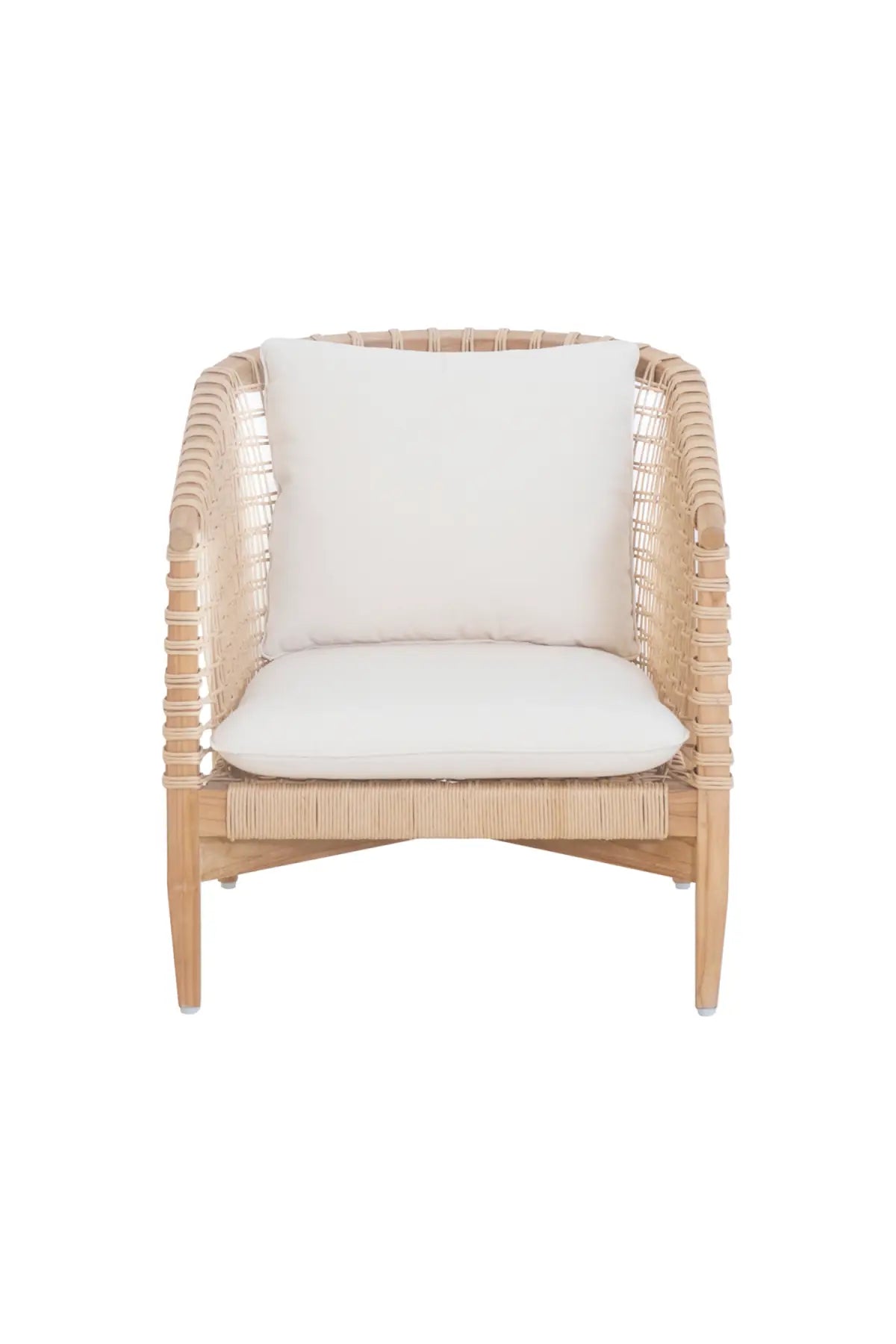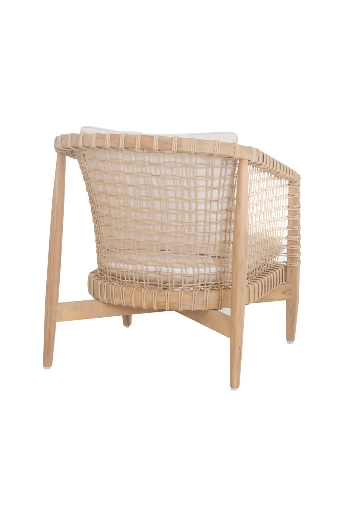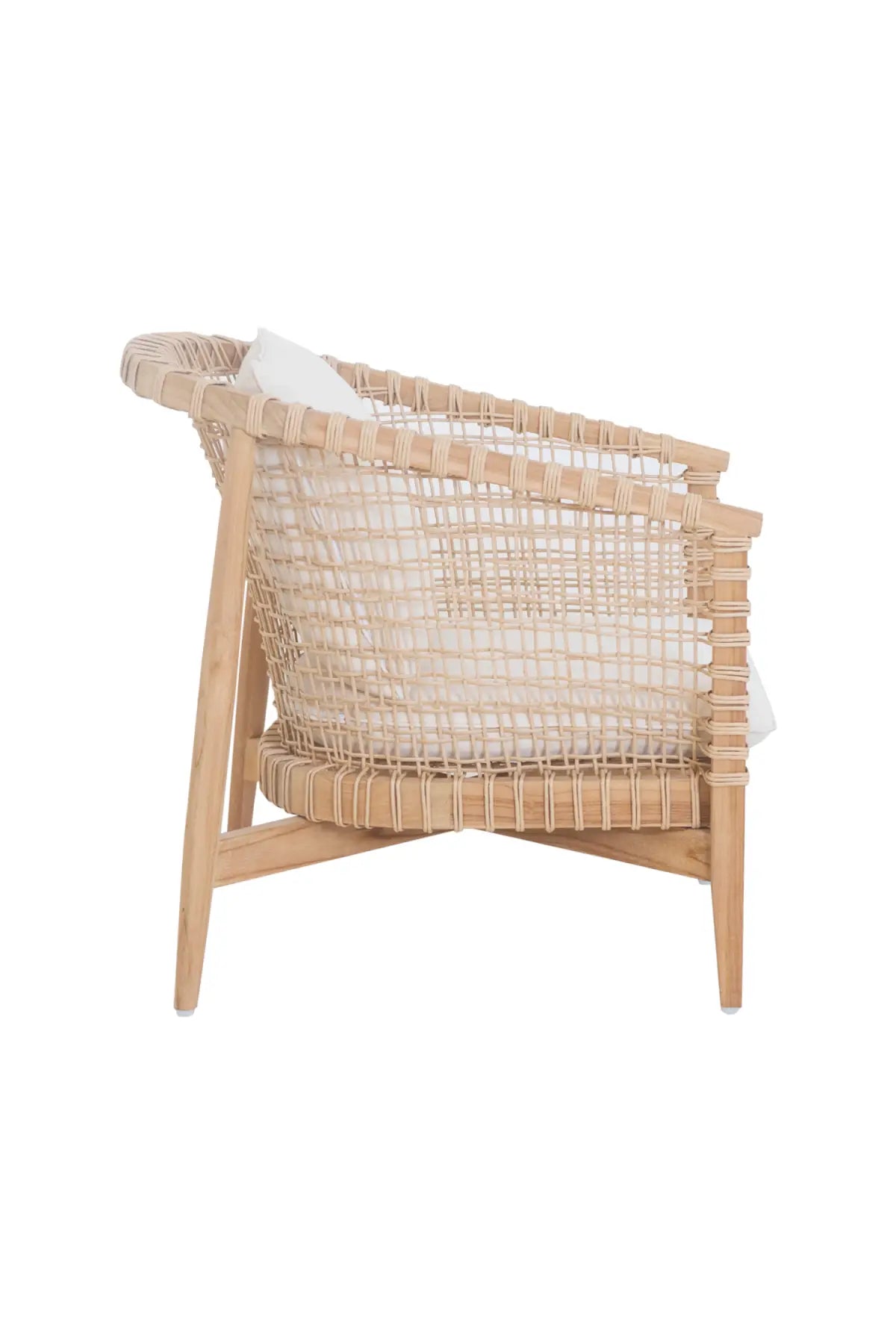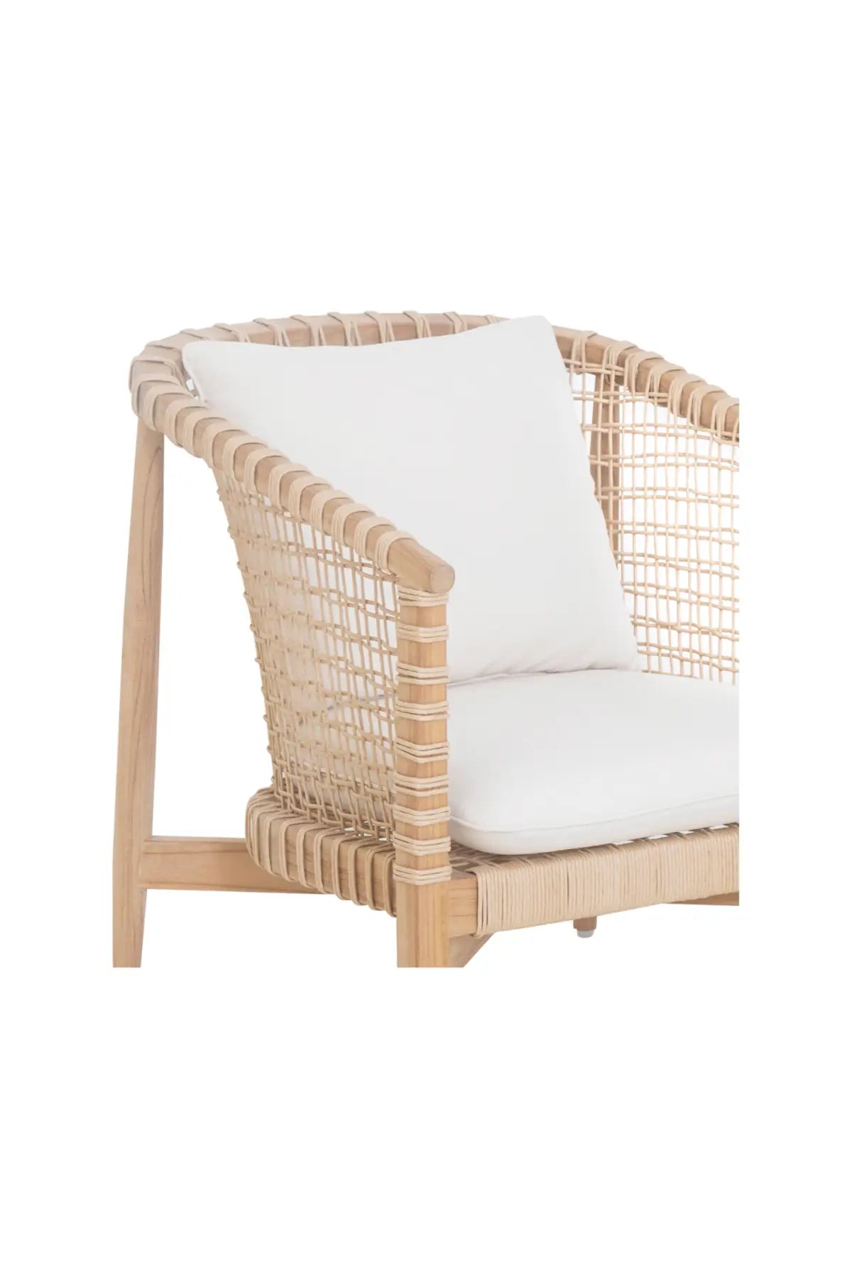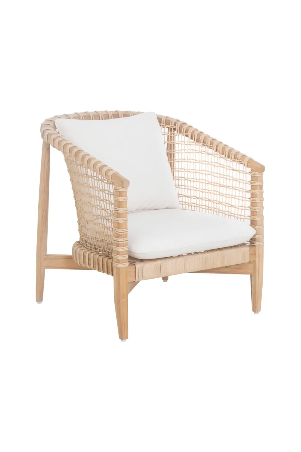 The Kuna Outdoor Lounge Chair features classic Lloyd Loom weaving on a teak frame that develops a rich patina over time. Its removable white cushions are easy to clean, keeping the chair stylish and ready for outdoor use.