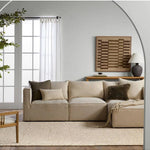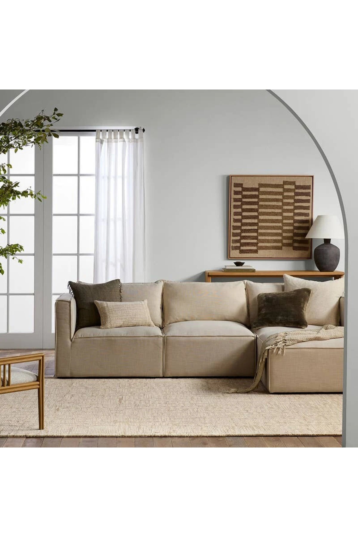 Meet the Labyrinth Rug - Cornstalk. The Labyrinth Rug features a soft wool blend with a textured cut and loop pile. Its abstract design in neutral taupe, cream, and tan adds subtle elegance, perfect for bedrooms and formal living areas.Samples are modeled at our North Scottsdale/Phoenix location.