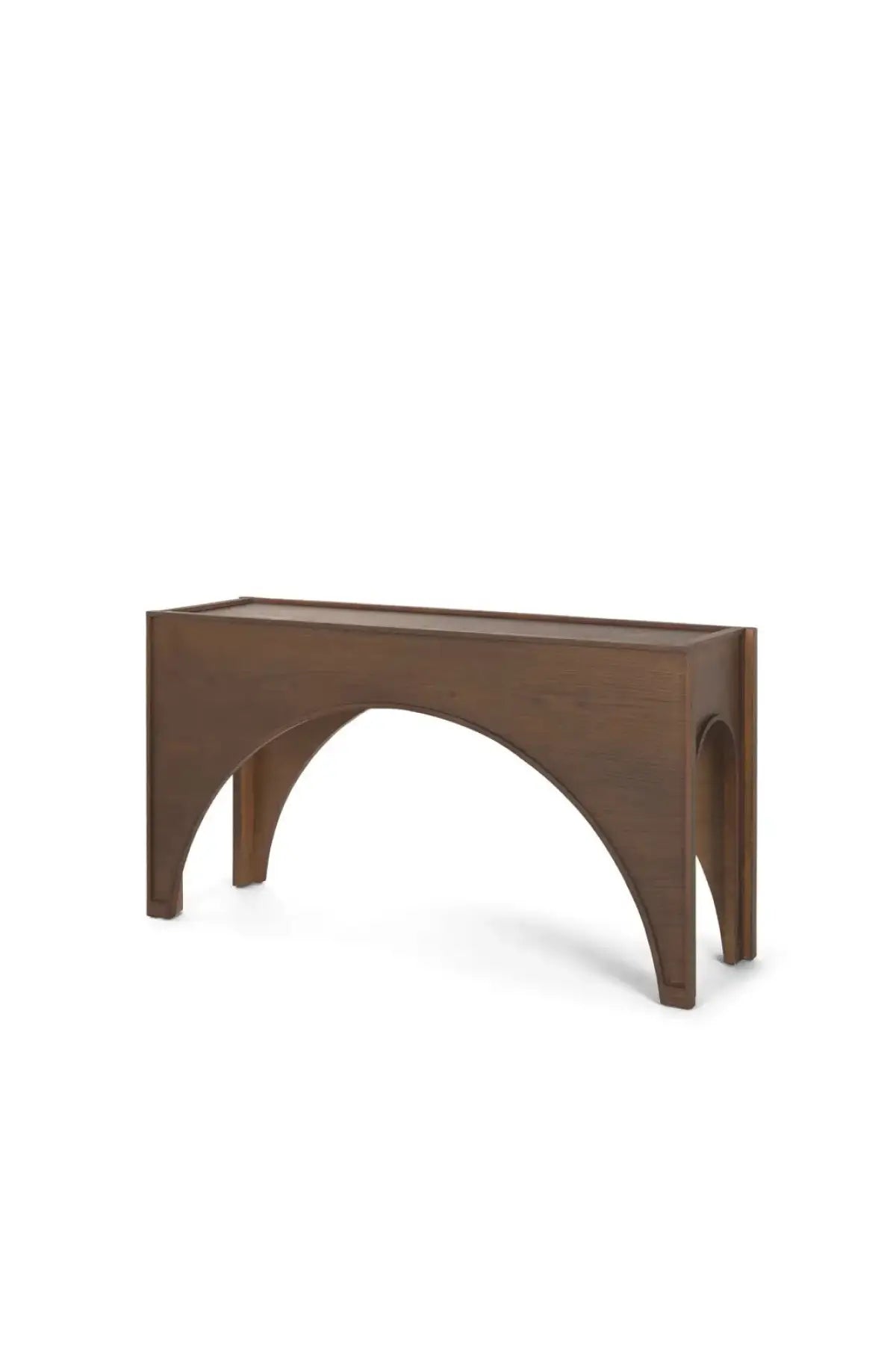 The Laraya Console Table showcases captivating arched framed legs supporting a sleek rectangular tabletop. Meticulously crafted from solid oak, the frame provides sturdiness, while the tabletop, composed of oak veneer on engineered wood, ensures enhanced durability.
