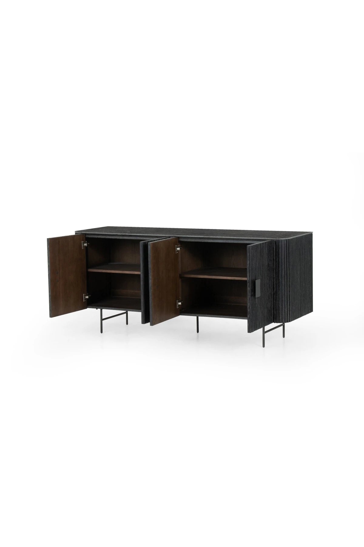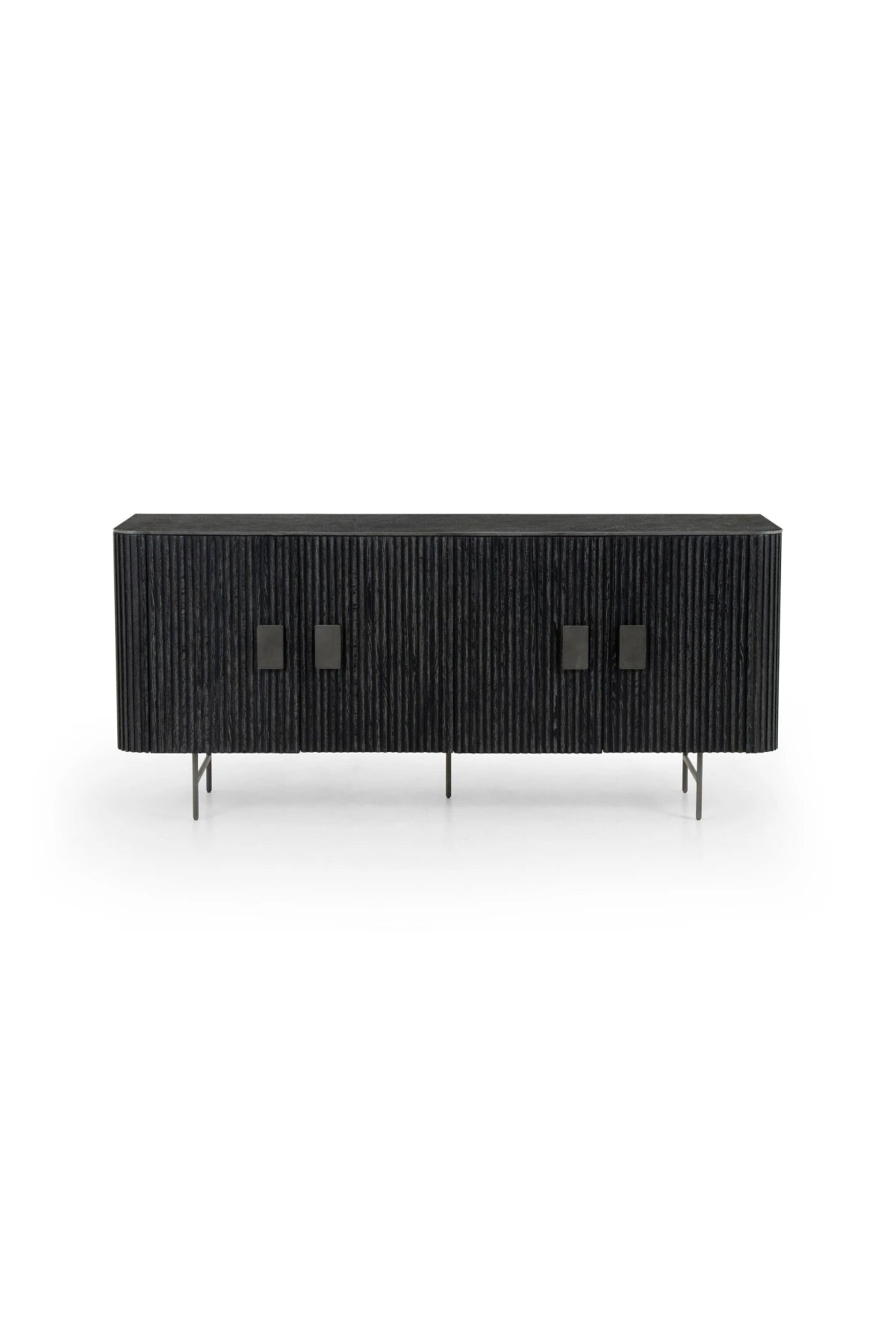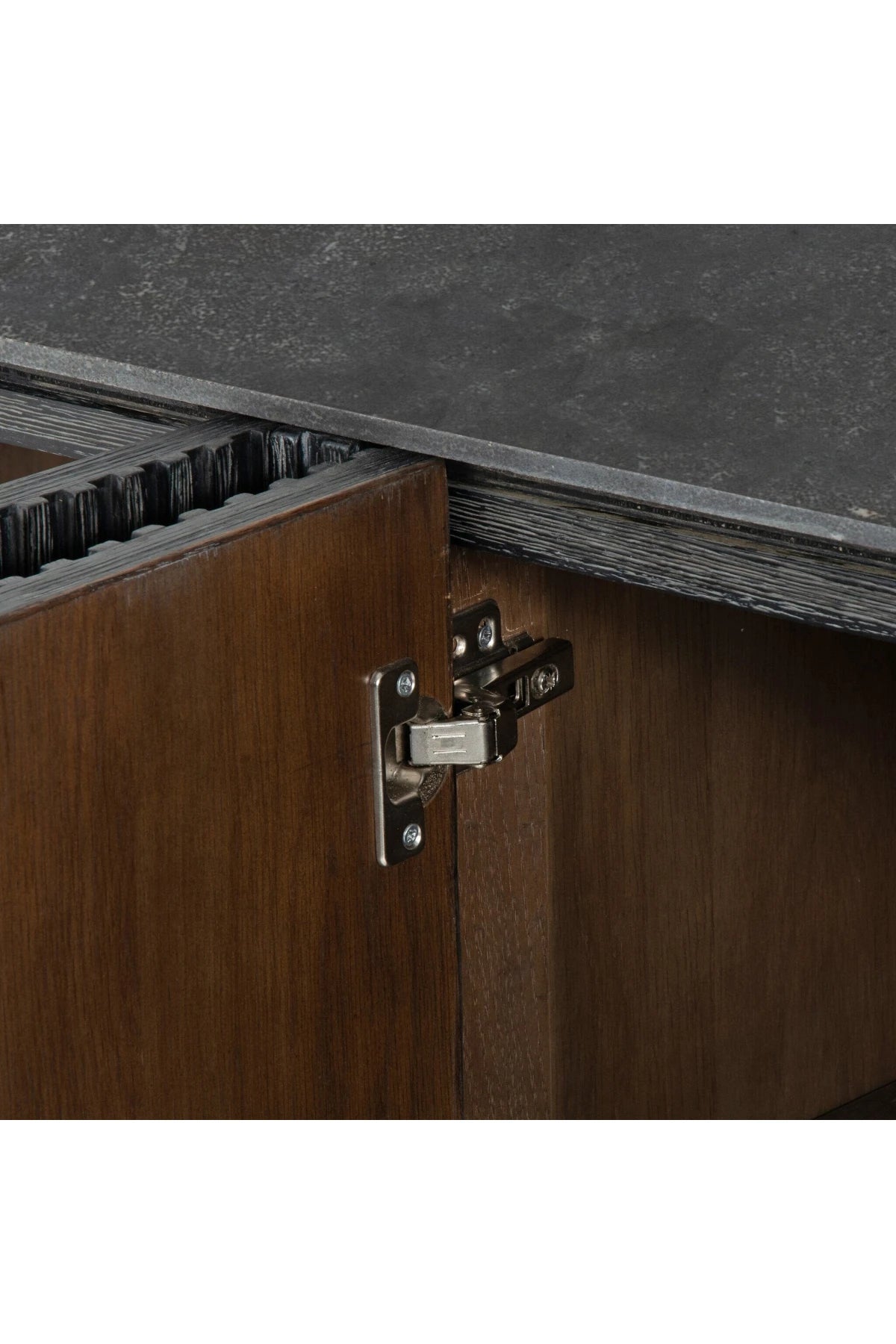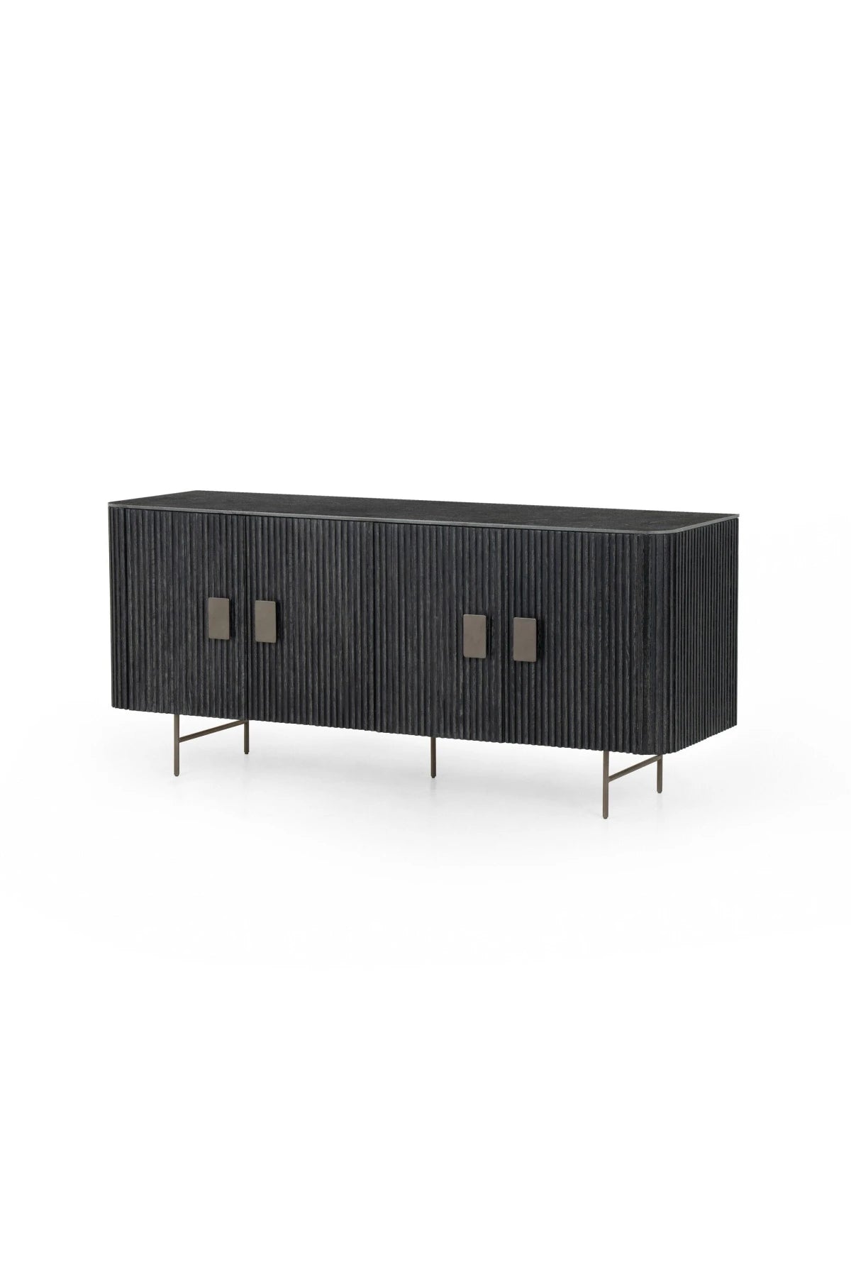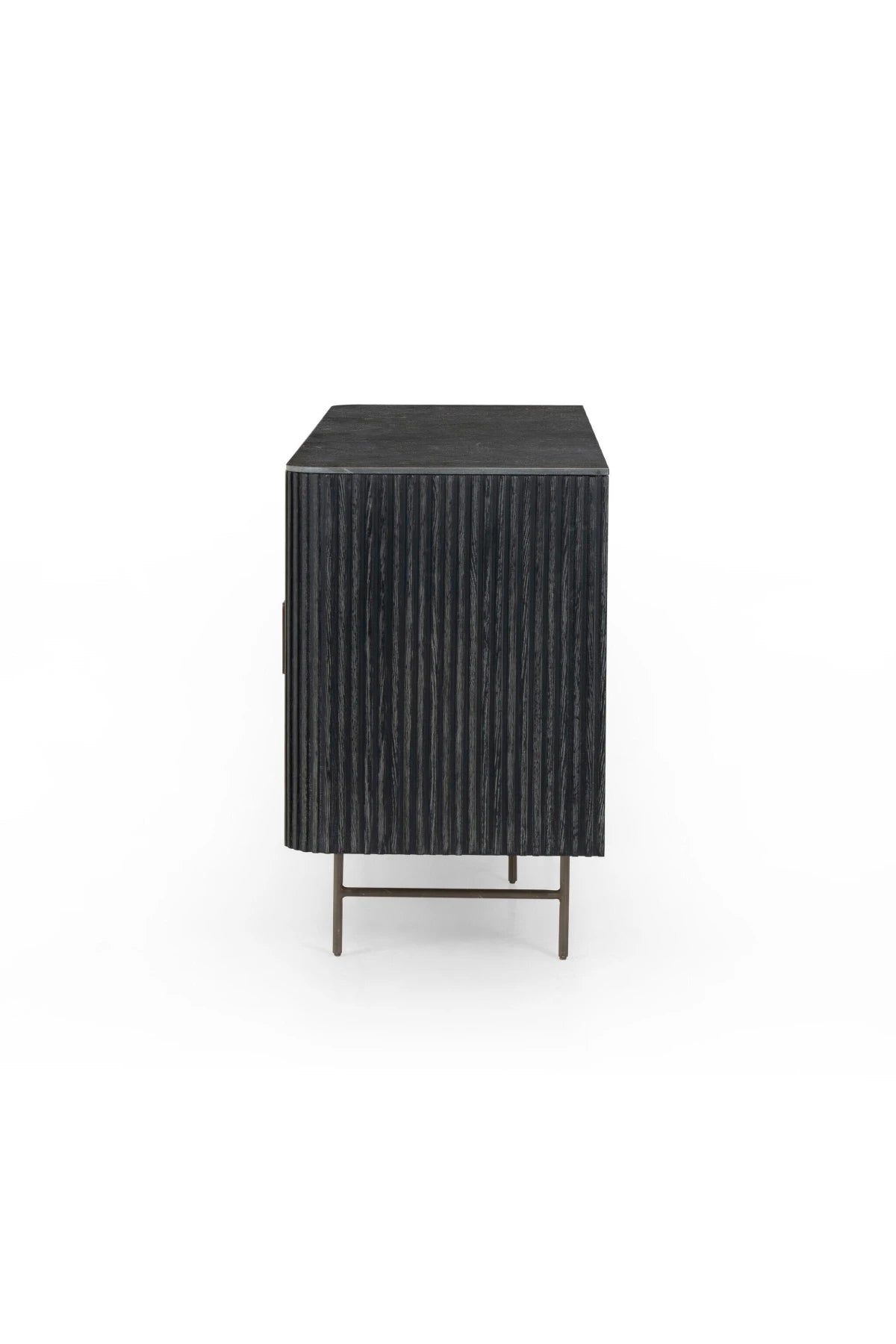Meet the Laverne Sideboard- a clean mid-century form, modernized by mixed materials. Black oak casing is whitewashed for a ceruse-like look, with vertical reedling for rich texture. A smooth bluestone top adds a sophisticated element of surprise, while oversize iron hardware hints fresh edge. Posterior cutouts for cord management.