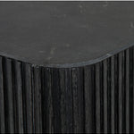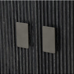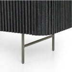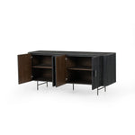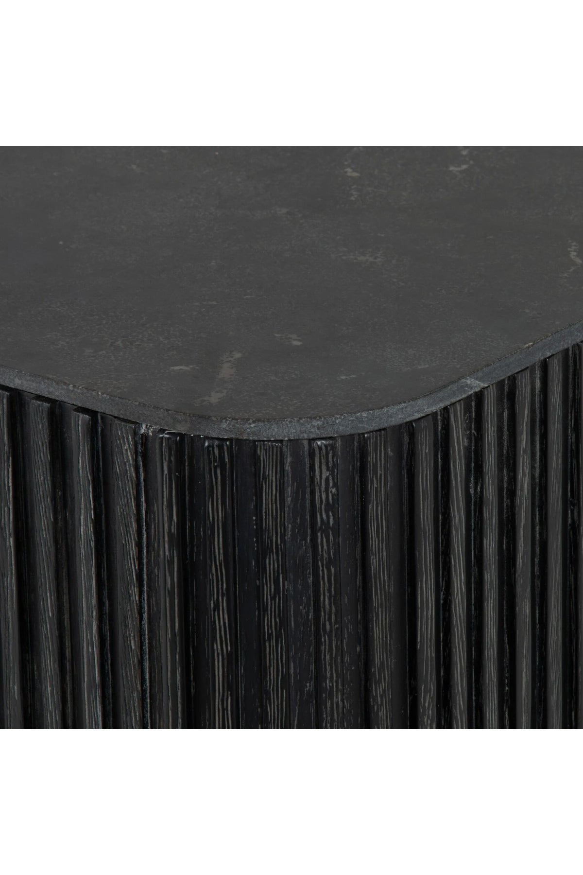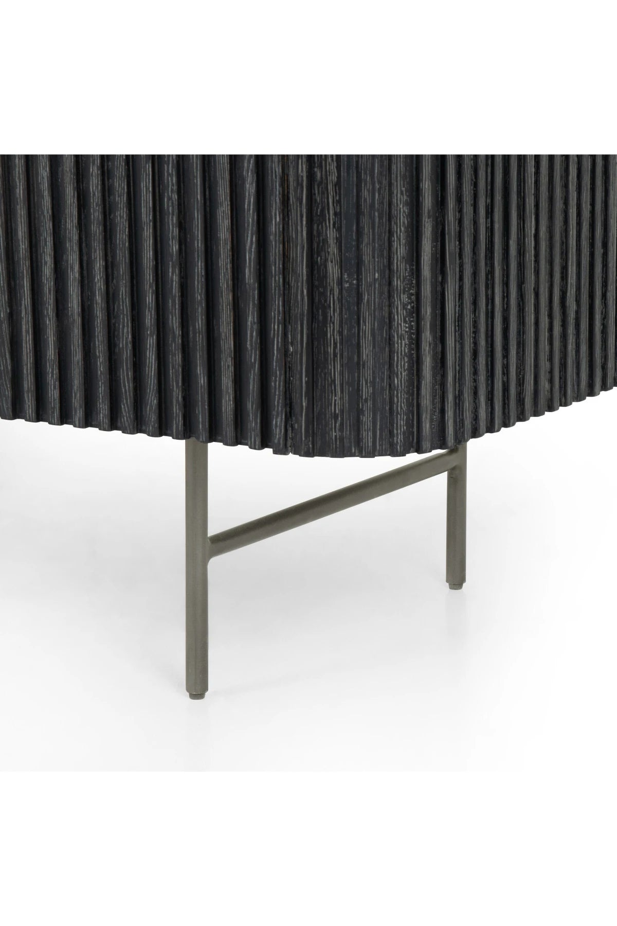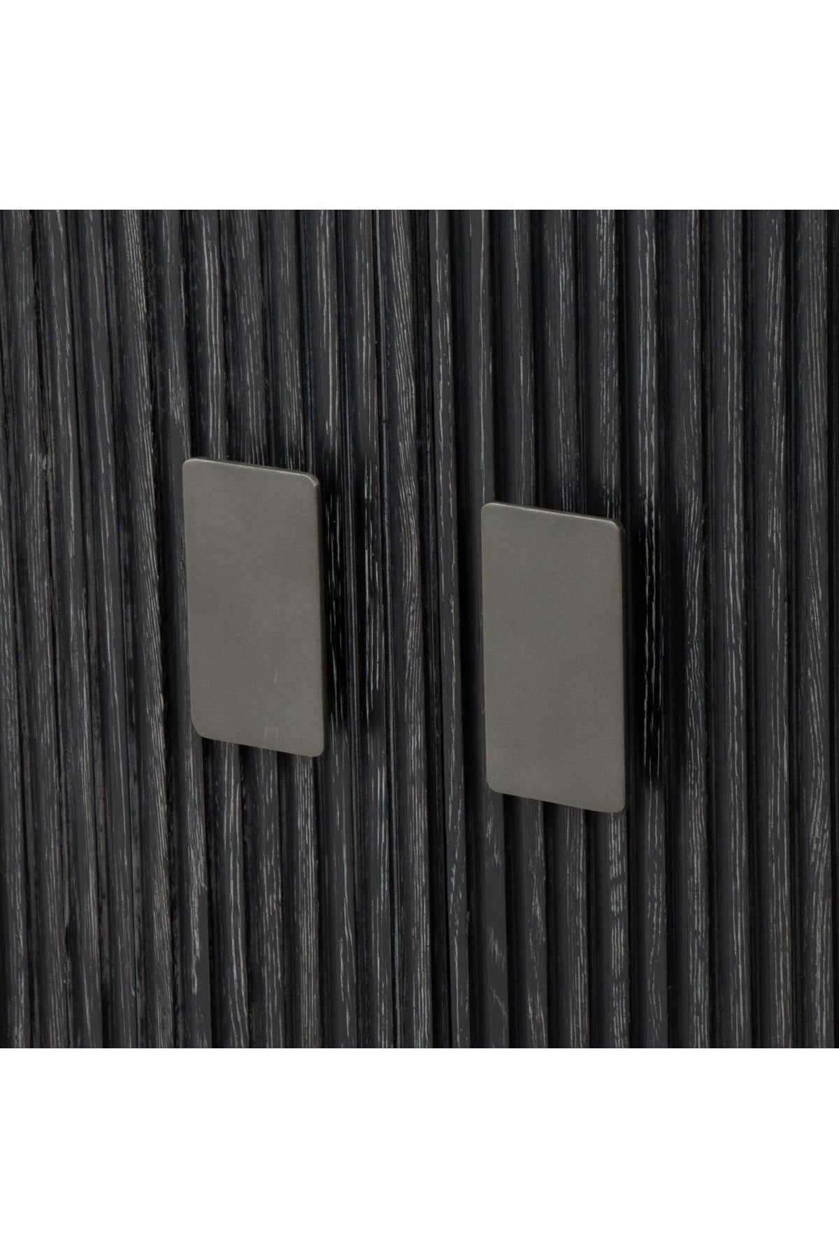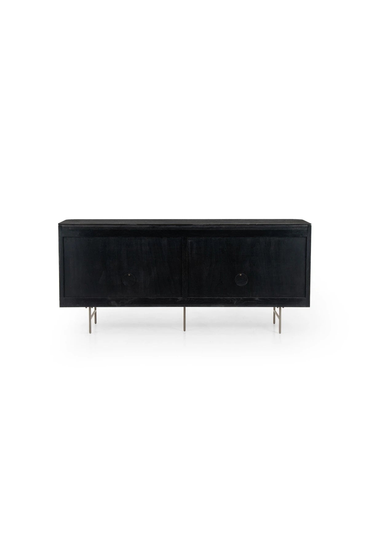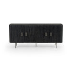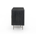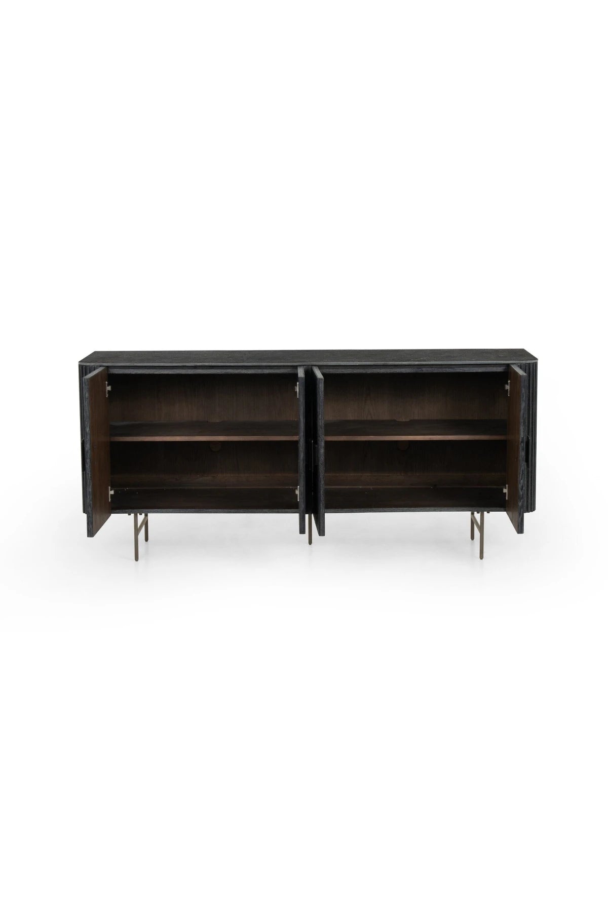 Meet the Laverne Sideboard- a clean mid-century form, modernized by mixed materials. Black oak casing is whitewashed for a ceruse-like look, with vertical reedling for rich texture. A smooth bluestone top adds a sophisticated element of surprise, while oversize iron hardware hints fresh edge. Posterior cutouts for cord management.