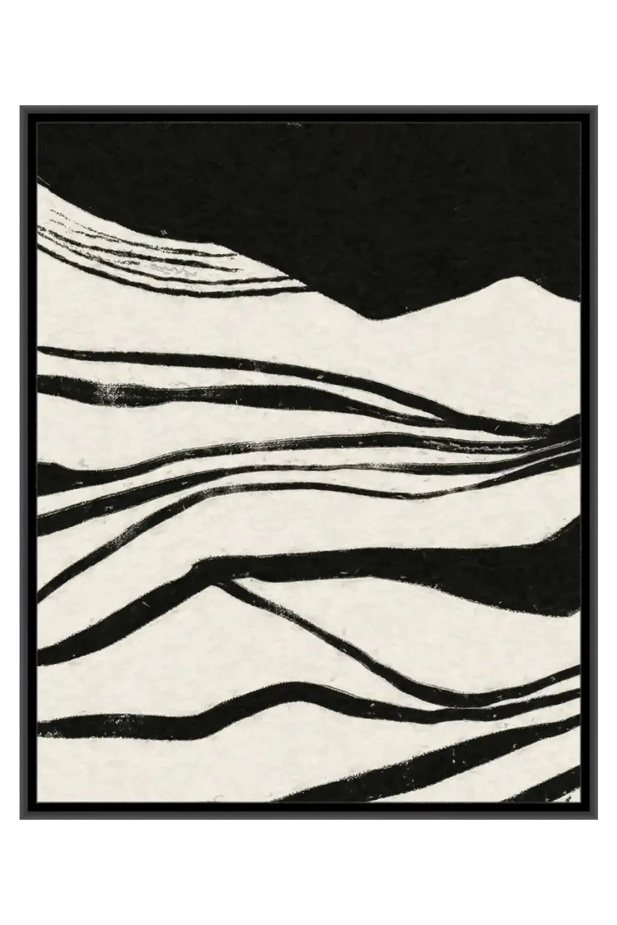 Meet the Lengthy Layers 1 Wall Art. This artwork displays bold, flowing black lines across a neutral background, creating an abstract, organic pattern reminiscent of natural contours. Printed as a fine art giclée on premium artist-grade canvas, ensuring exceptional color accuracy and detail for a gallery-quality piece. A gel finish is a hand-applied with brushstrokes that follow the contours of the original image, adding a subtle and authentic texture. Crafted from sustainable polystyrene, the floater frame creates a striking effect by suspending the artwork within the frame, adding depth and a touch of modern elegance. Professionally framed and ready to hang.