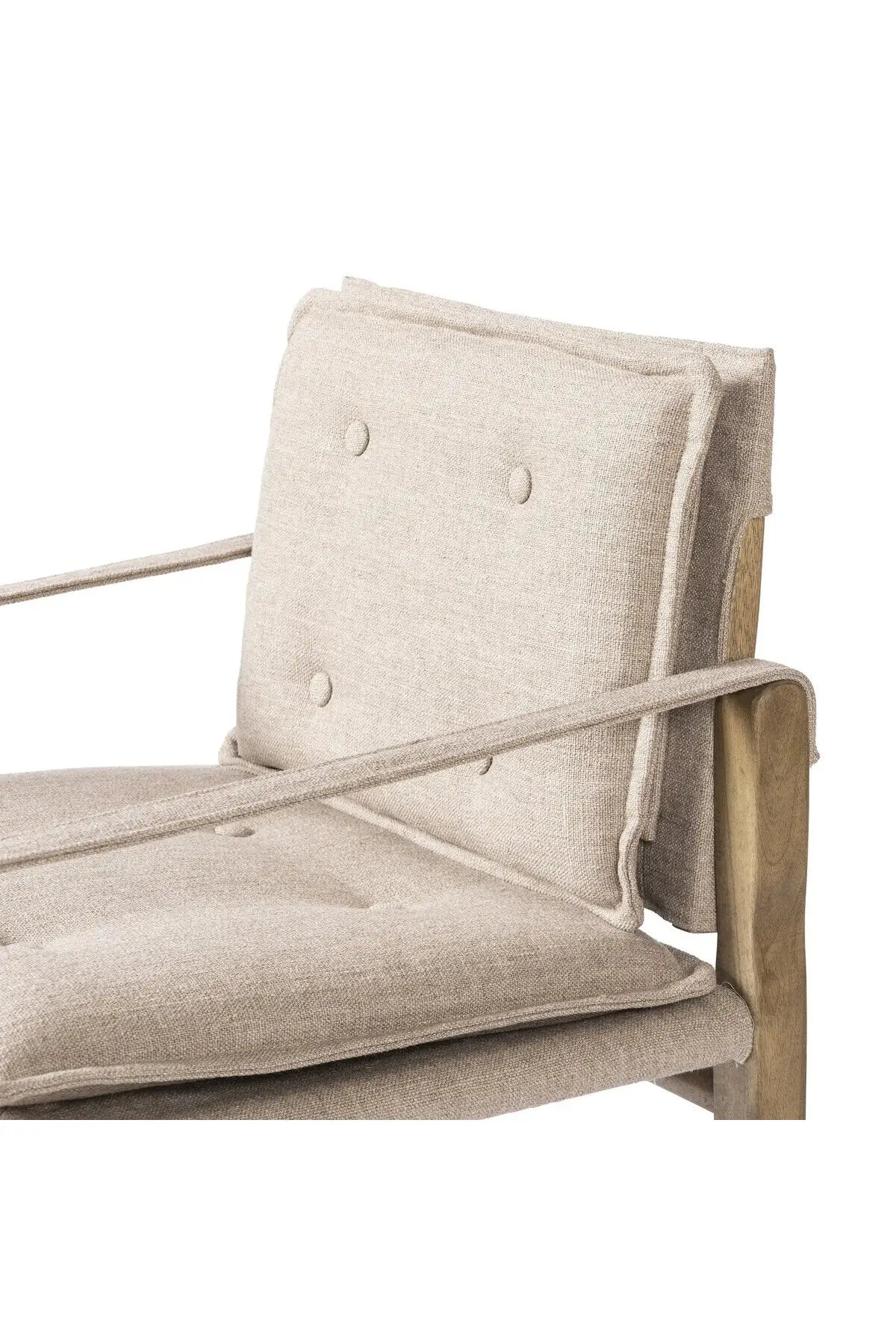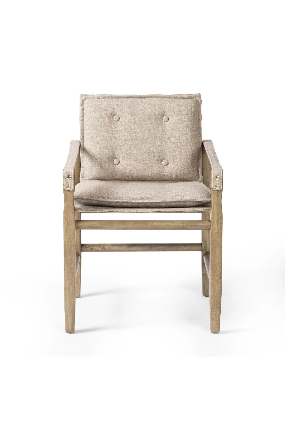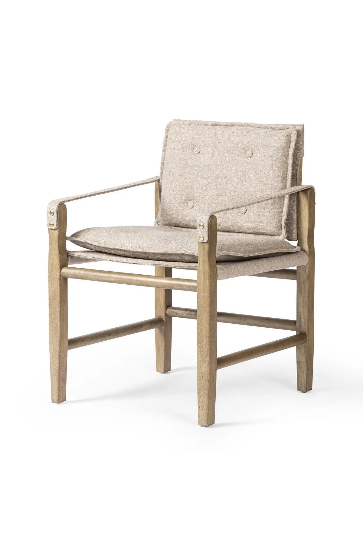 Inspired by a vintage safari-style frame, the Lenz Dining Armchair is defined by the fluid strap arms. Semi-attached cushions in taupe performance fabric, finished with button tufting details. Framed out by warm parawood. Performance fabrics are specially created to withstand spills, stains, high traffic and wear, ensuring long-term comfort and unmatched durability.