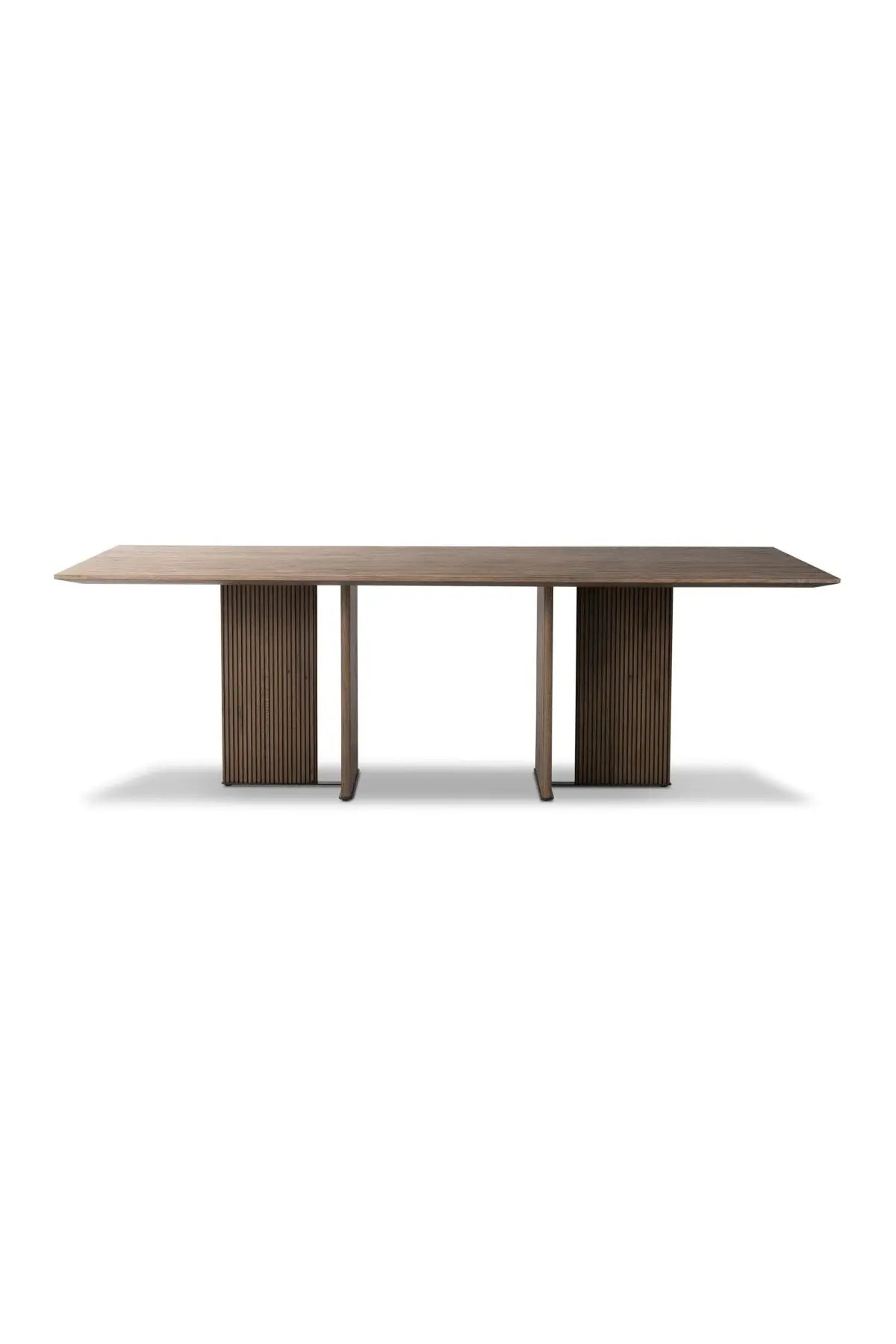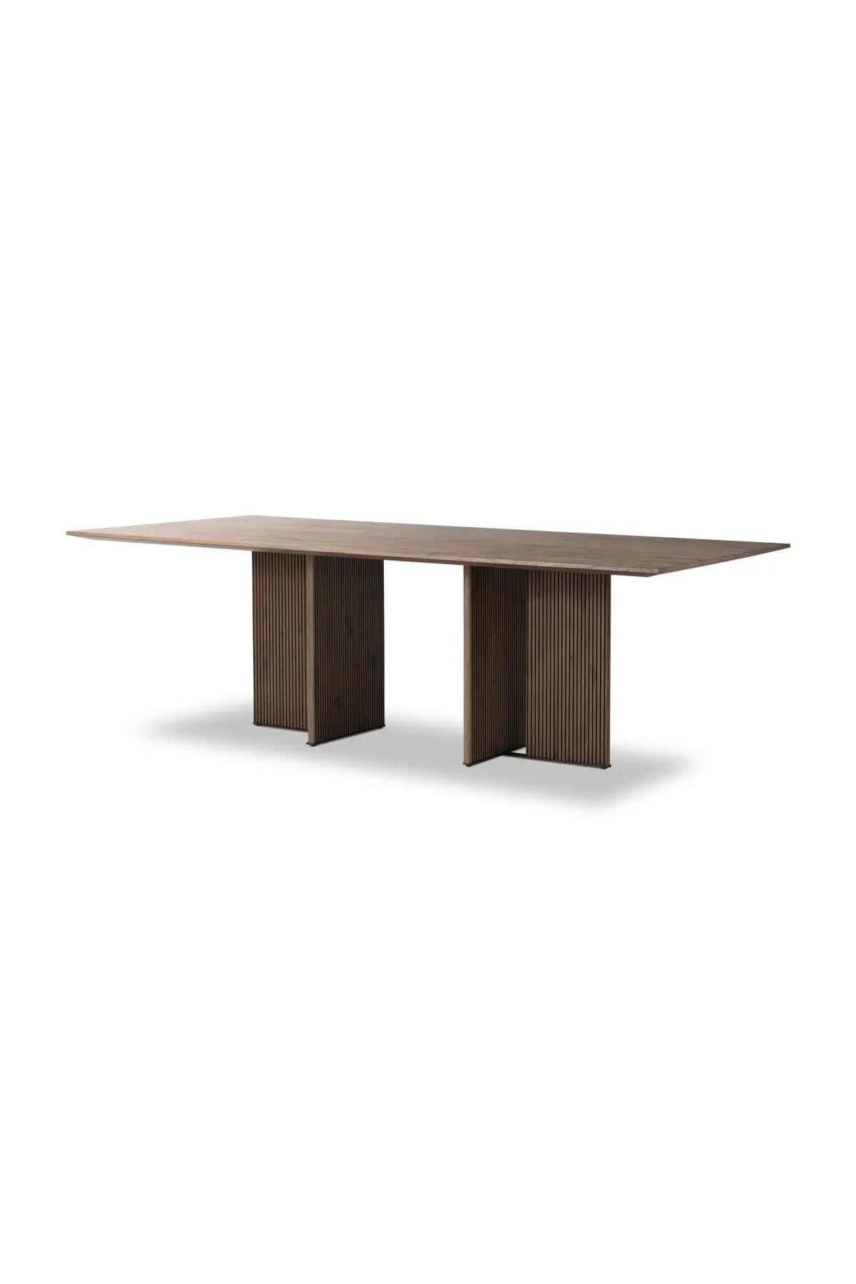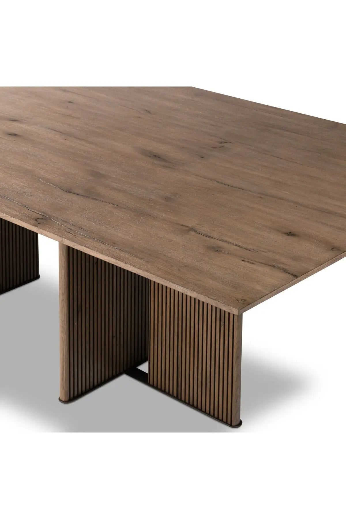 Meet the Leo Dining Table. Made from rustic-finished oak, clean, structured lines define this rectangular dining table. Reeding on base panels for great texture and a linear look.