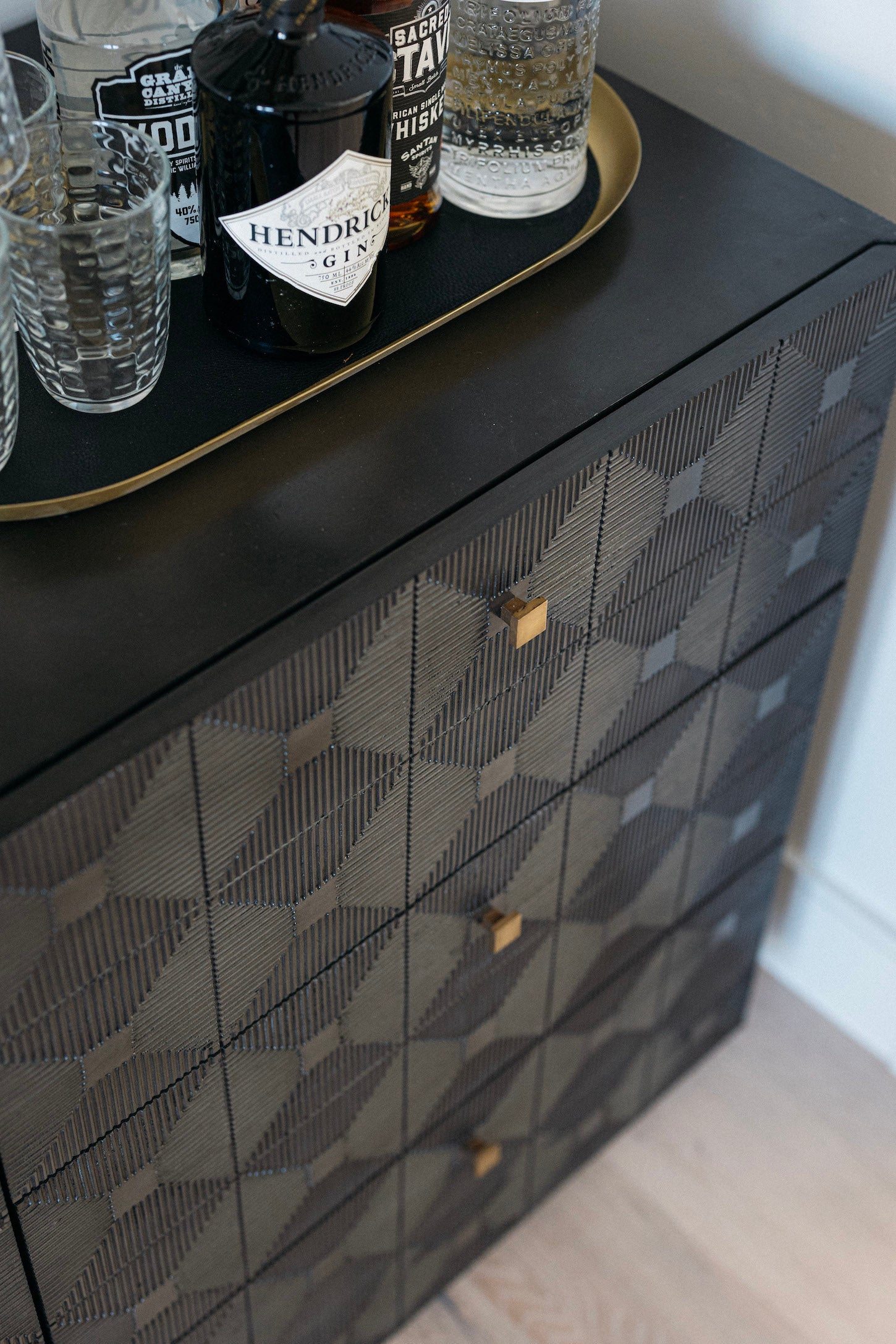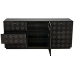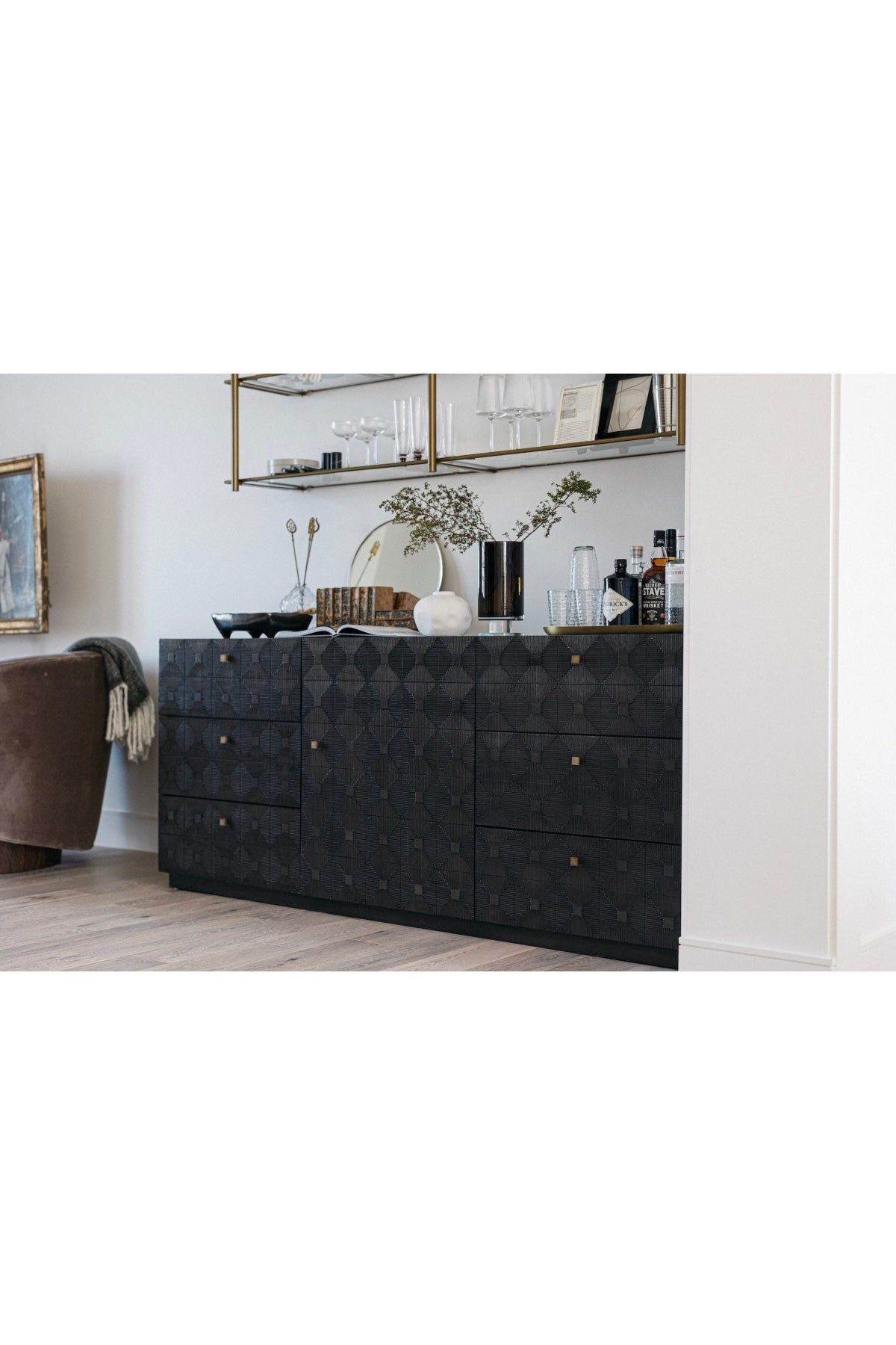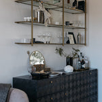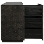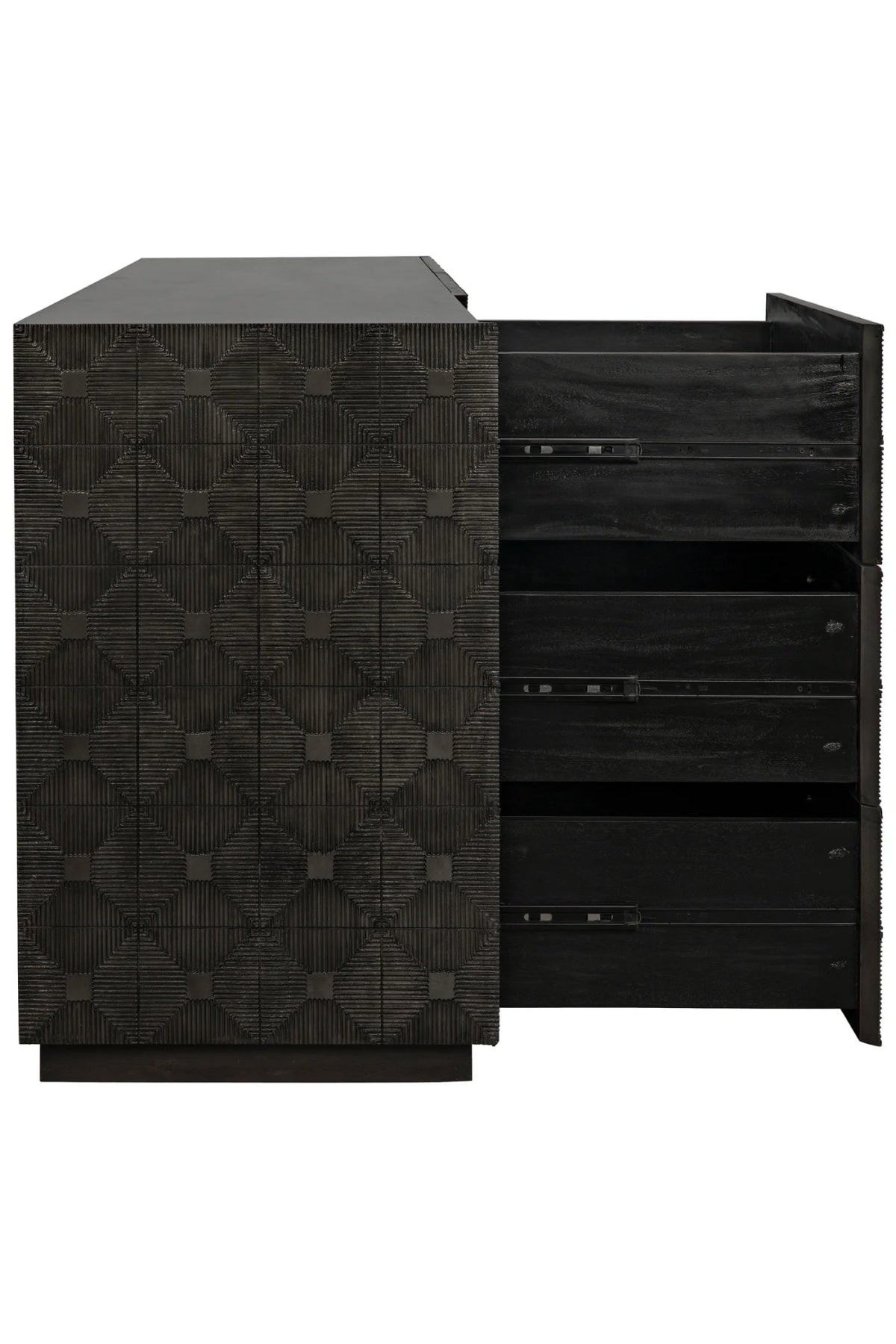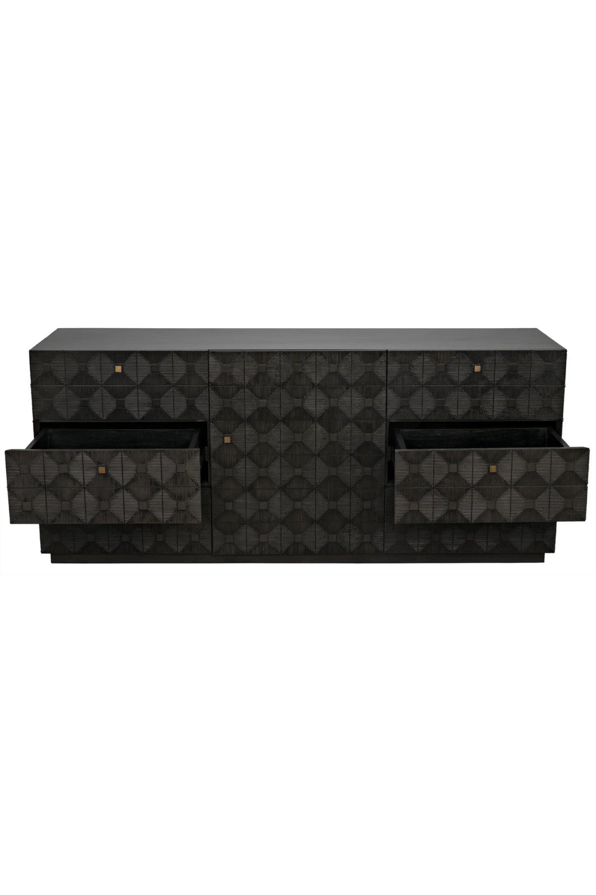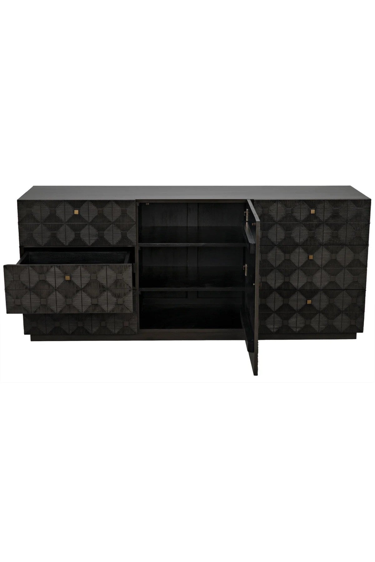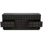Meet the Leon Dresser. Carved of the most revered hardwood, mahogany, three sides of this exquisite dresser are adorned with decorative geometrical patterns. Its central cabinet opens to reveal three shelves, and is itself surrounded by six generous drawers.