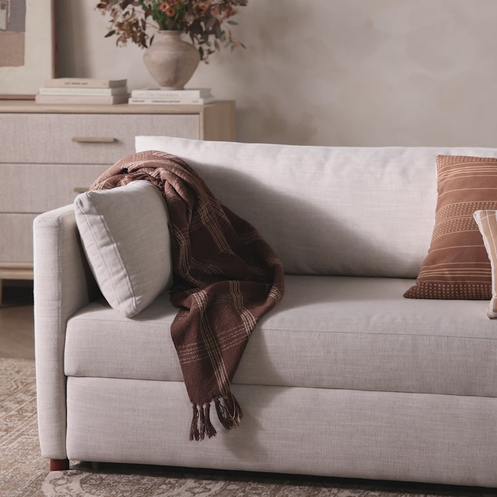 Meet the Lincoln Sleeper Sofa. This cleverly designed sleeper sofa hides a Queen-sized sleeping surface within its modern silhouette. With a simple roll-out and counterbalanced mechanism, it effortlessly transforms into a bed, making it a space-saving solution with hidden functionality. When unfolded, the cushions form a comfortable bed, perfect for overnight guests or movie nights — no extra mattress necessary.