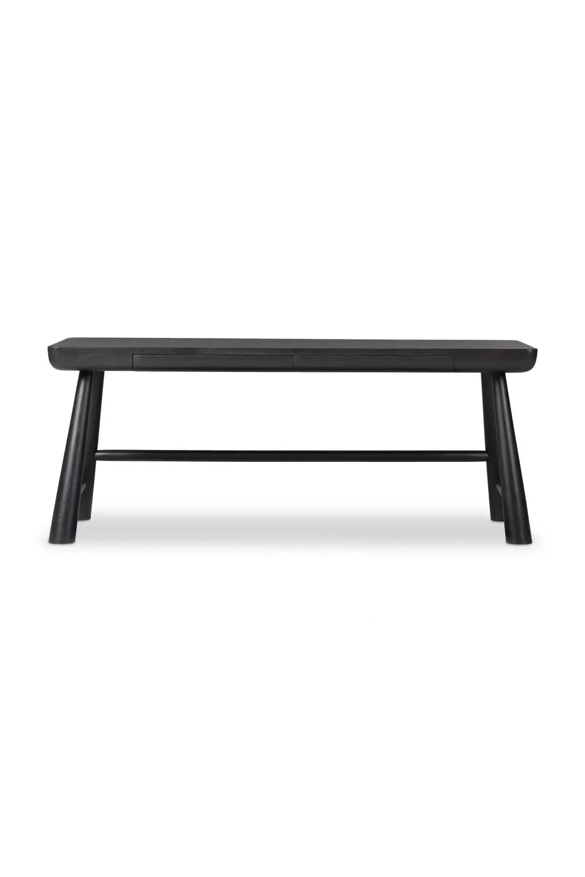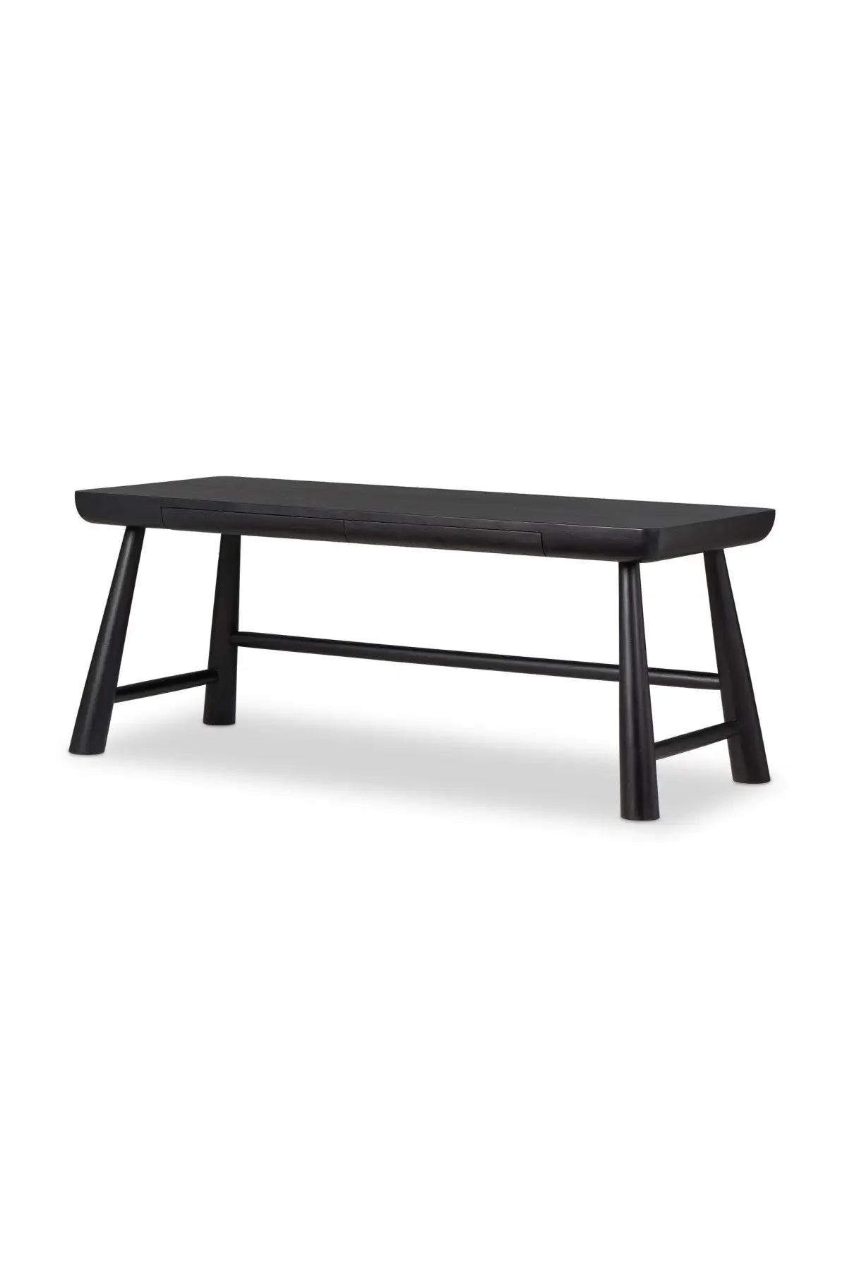 Meet the Lorik Desk. This rustic desk features a modernized shape crafted from caramel-finished wood. Designed with cylindrical legs that are both angled and tapered for added movement. Built-in, hidden pencil drawers keep the focus on the natural graining and grooves of the wood used to craft this piece.