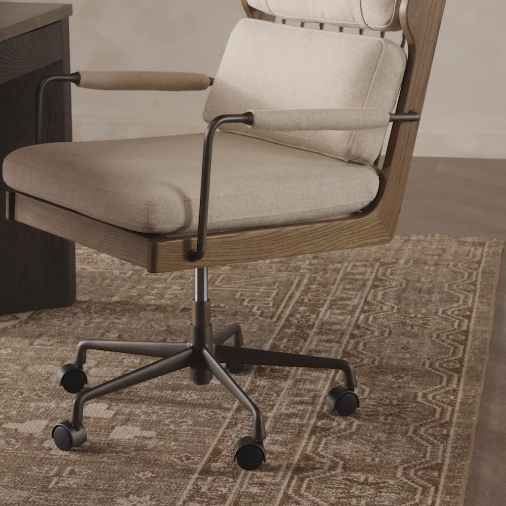 Meet the Ludvig Desk Chair. An aged oak frame pairs with striking accents including metal back spindles and fabric-wrapped arms. An upper cushion with strap and snap detailing adds both comfort and a touch of modern character. Styled in a linen-cotton-poly performance blend. Steaming required. Performance fabrics are specially created to withstand spills, stains, high traffic and wear, ensuring long-term comfort and unmatched durability.