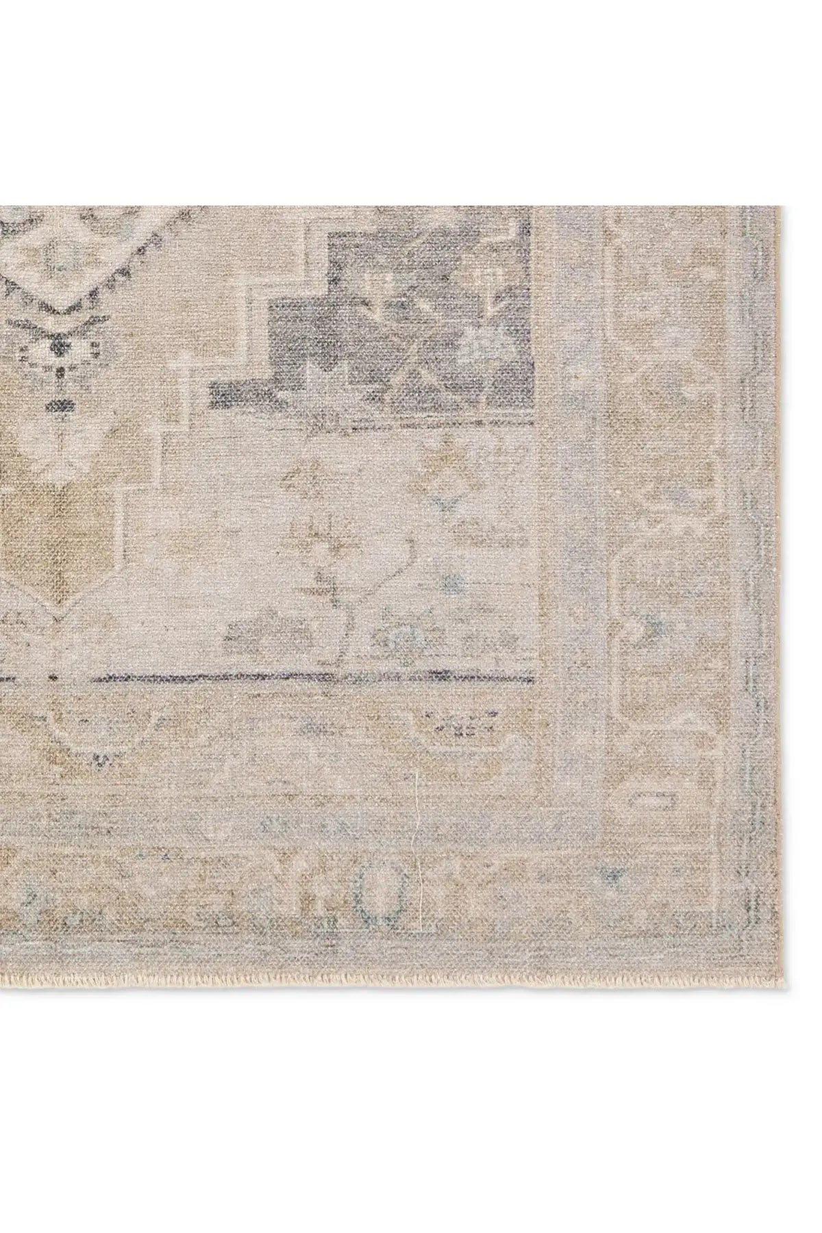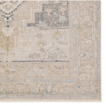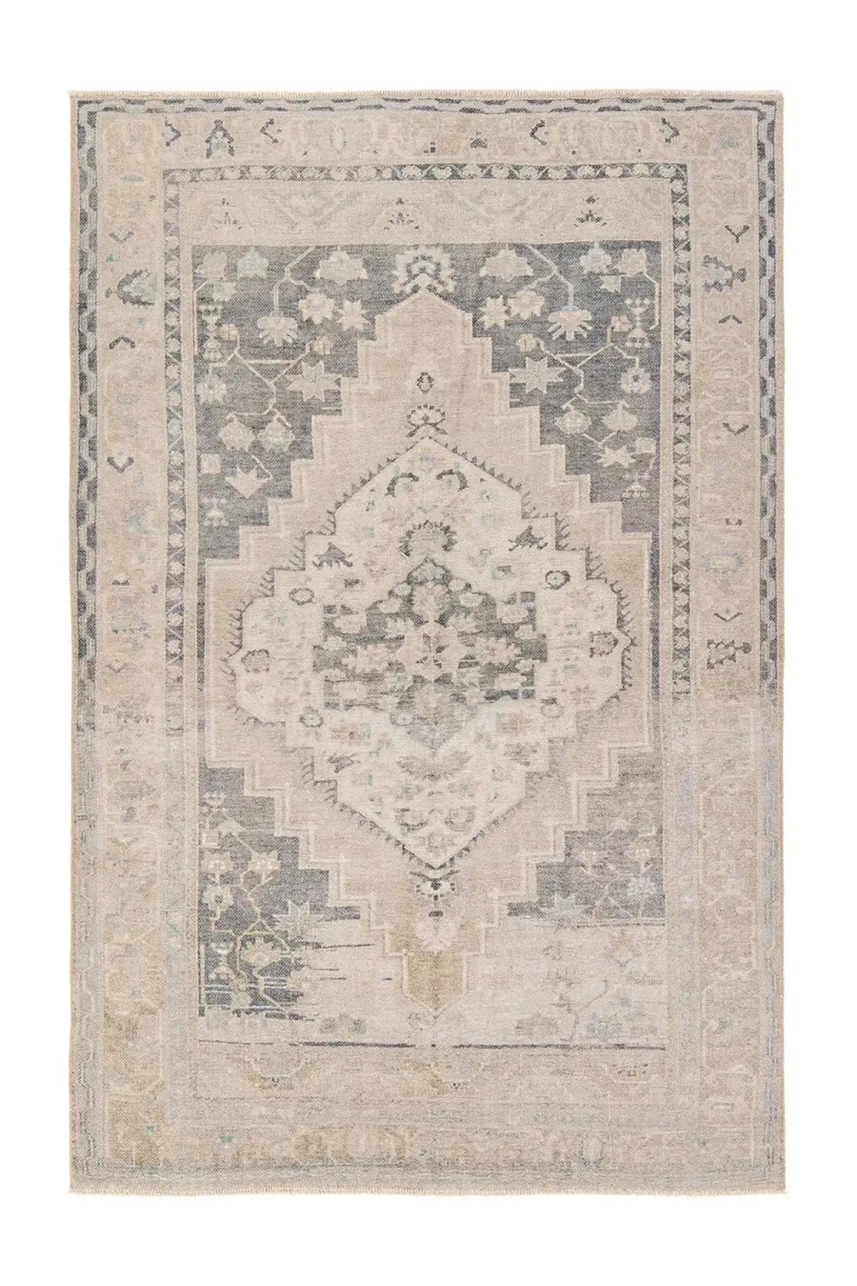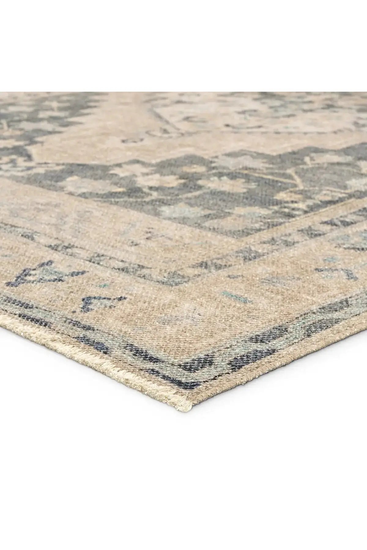 Meet the Lumal Rug. This Rug features a vintage-inspired medallion and floral borders in navy, green, cream, gray, and tan. Made of soft, stain-resistant polyester, this machine washable rug is easy to clean and perfect for homes with kids and pets. Samples are modeled at our North Scottsdale/Phoenix location.