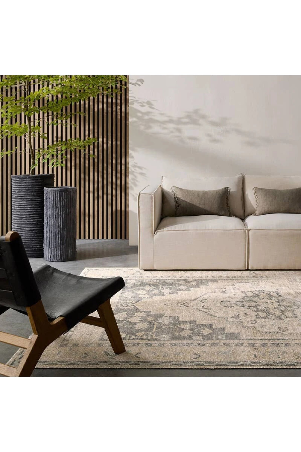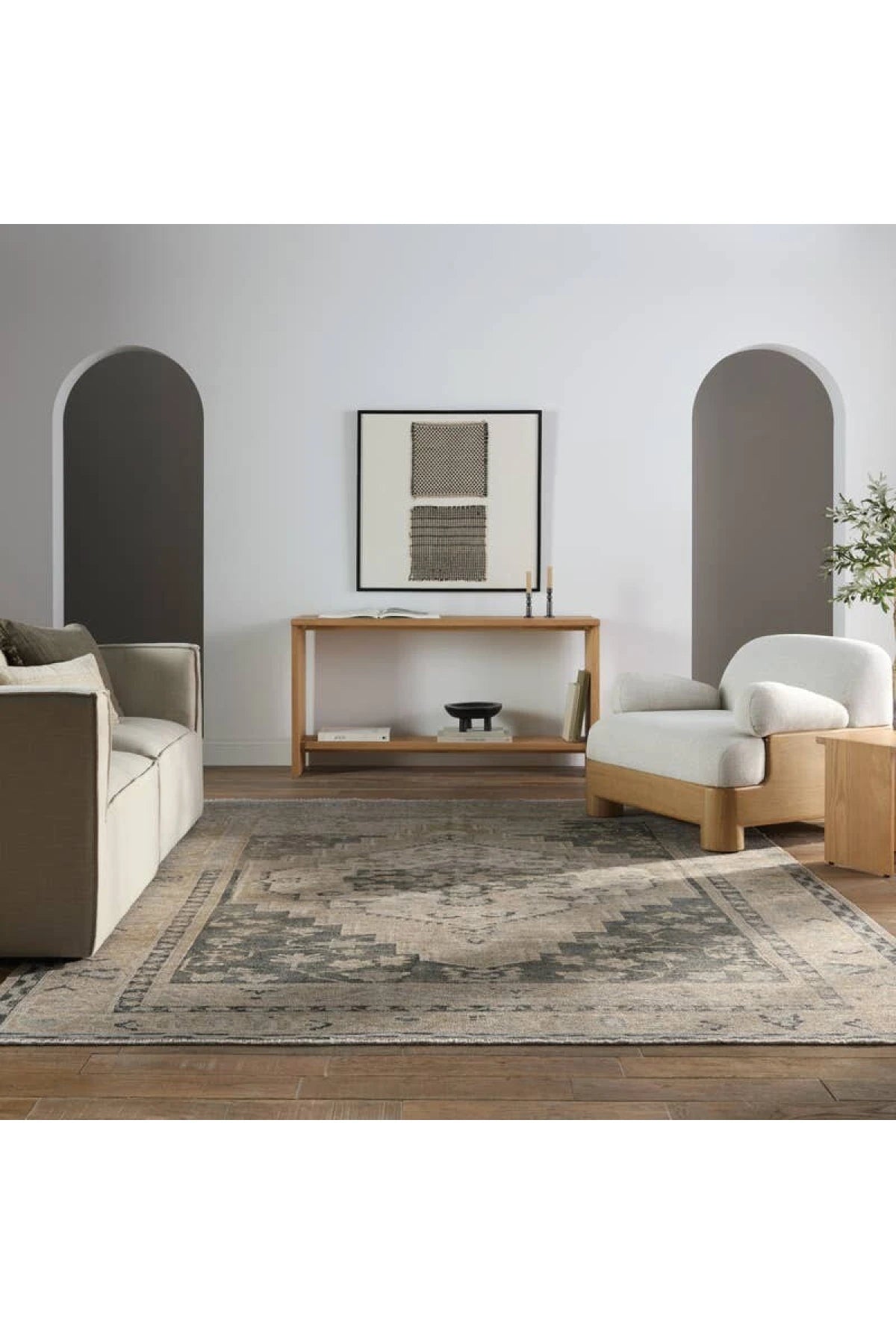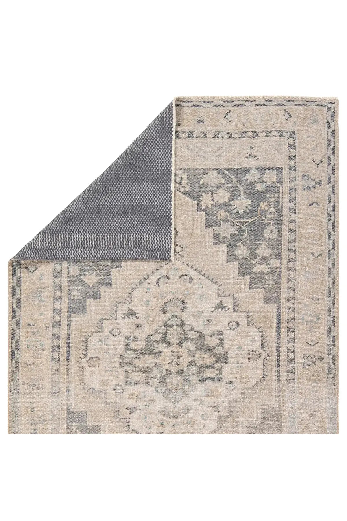 Meet the Lumal Rug. This Rug features a vintage-inspired medallion and floral borders in navy, green, cream, gray, and tan. Made of soft, stain-resistant polyester, this machine washable rug is easy to clean and perfect for homes with kids and pets. Samples are modeled at our North Scottsdale/Phoenix location.