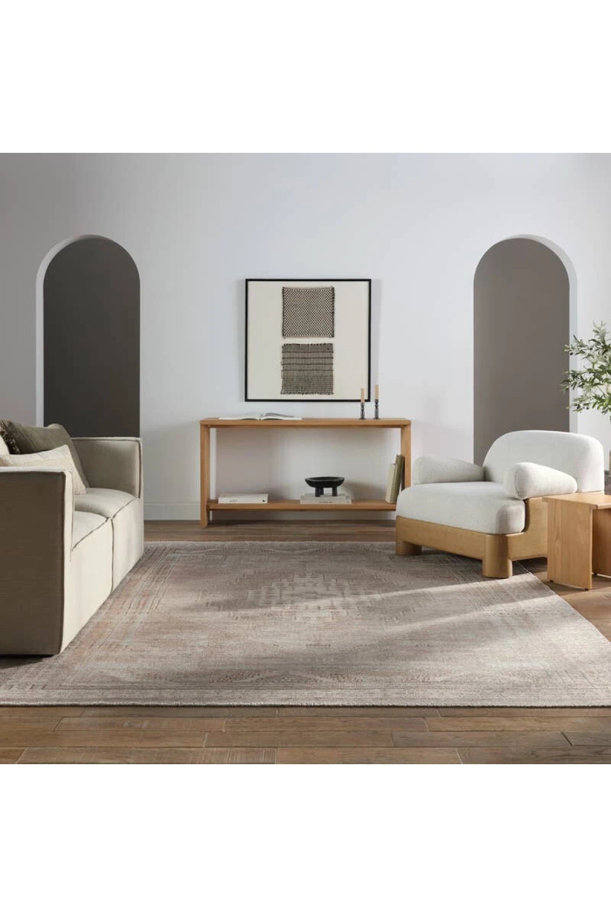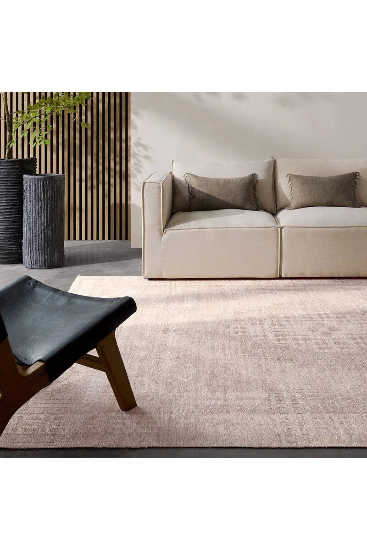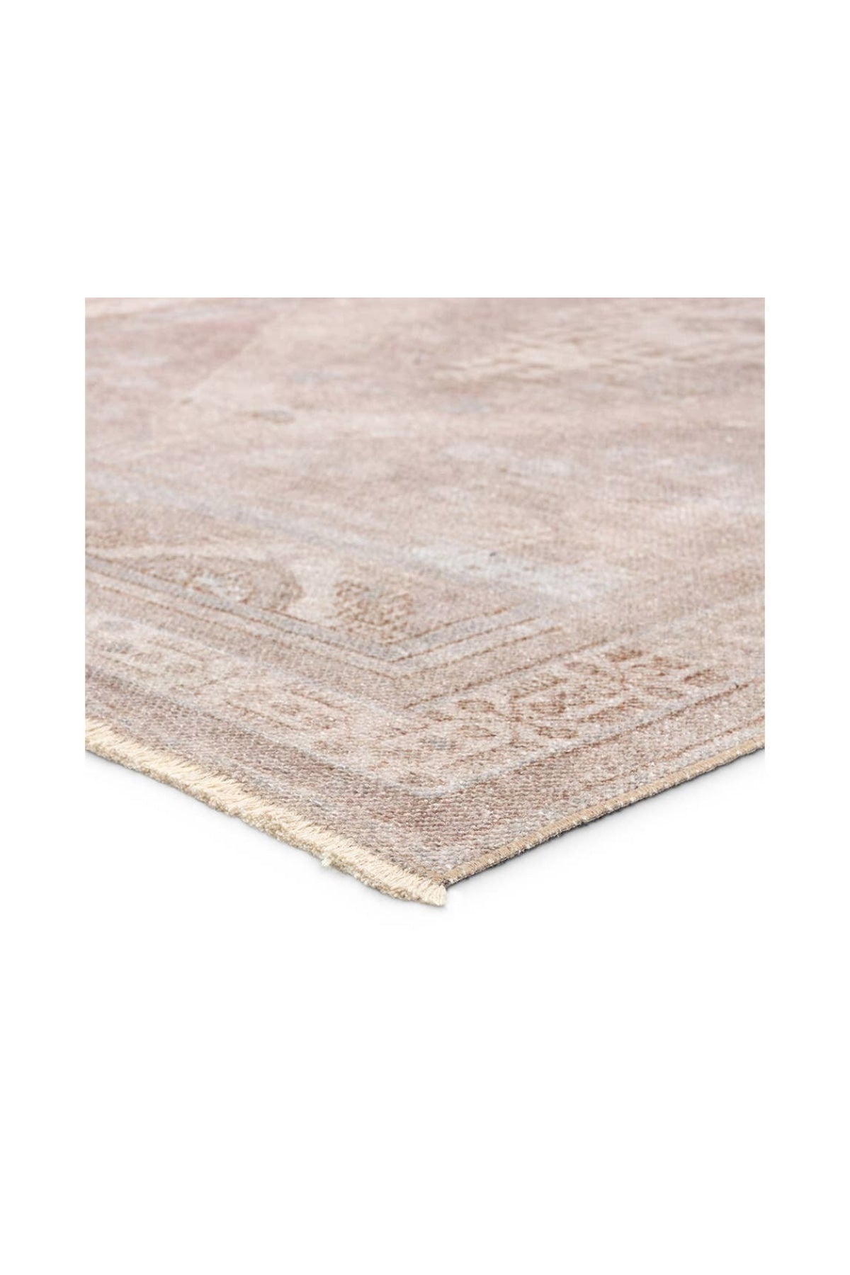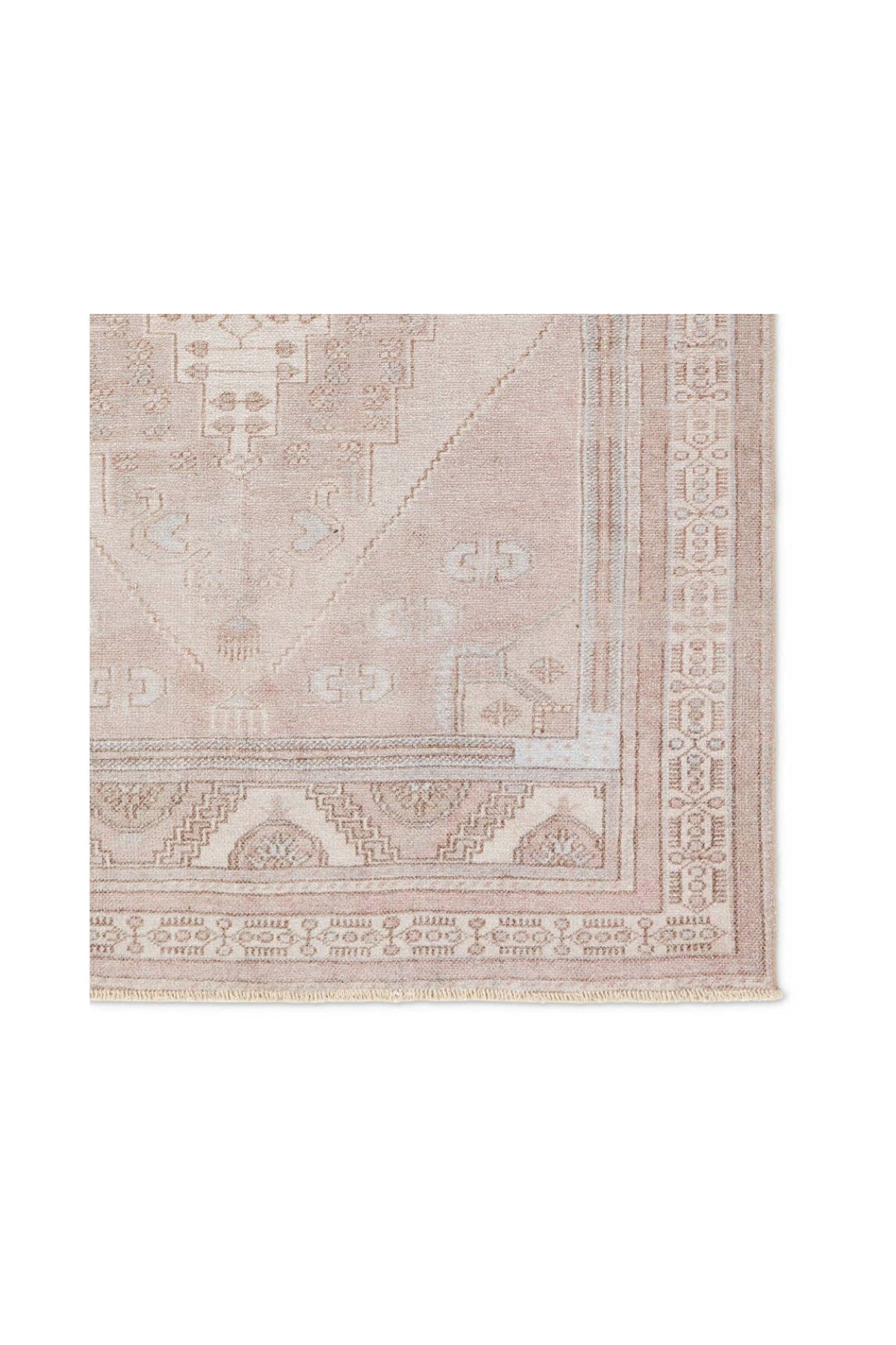 Meet the Lumal Rug. Distressed, vintage designs offer an elevated tone for the Lumal Rug. The rug features a Southwestern-inspired medallion, geometric border, and intricate detailing in tones of mauve, light blue, brown, and cream. This machine washable rug is stain resistant and easy to clean, perfect for homes with children and pets. The 100% polyester fibers allow for maximum clean-ability while maintaining a soft hand.