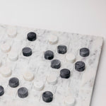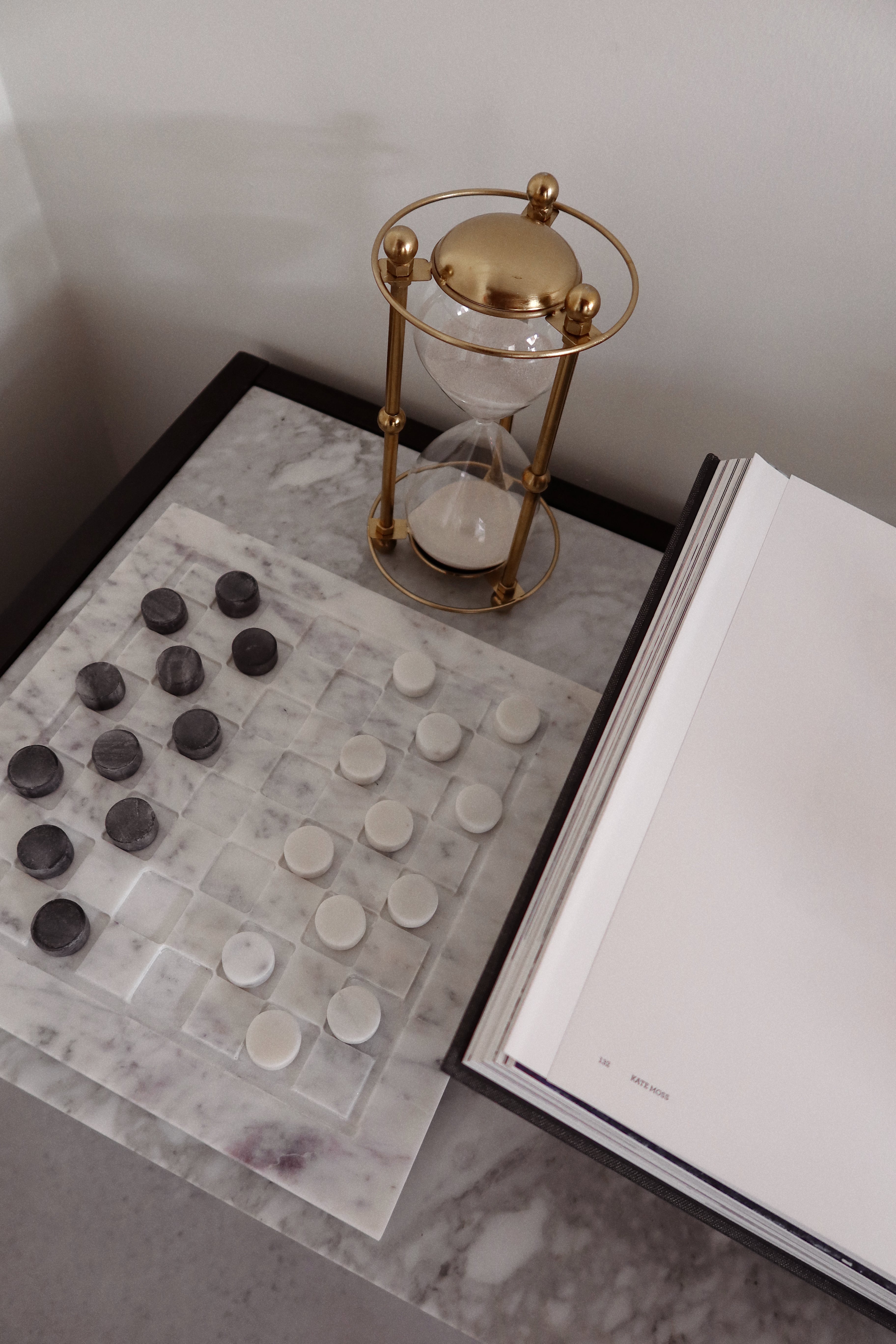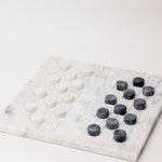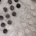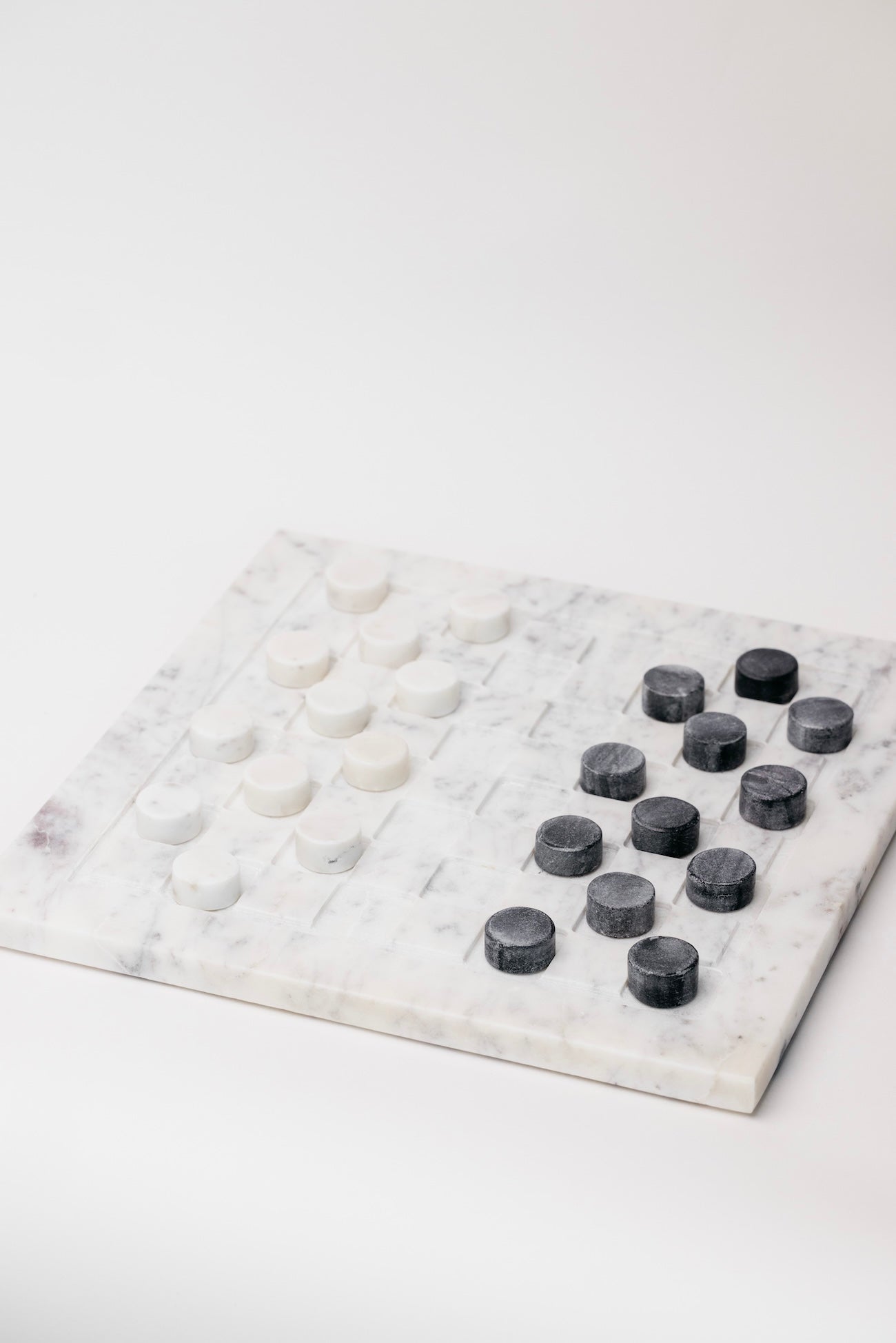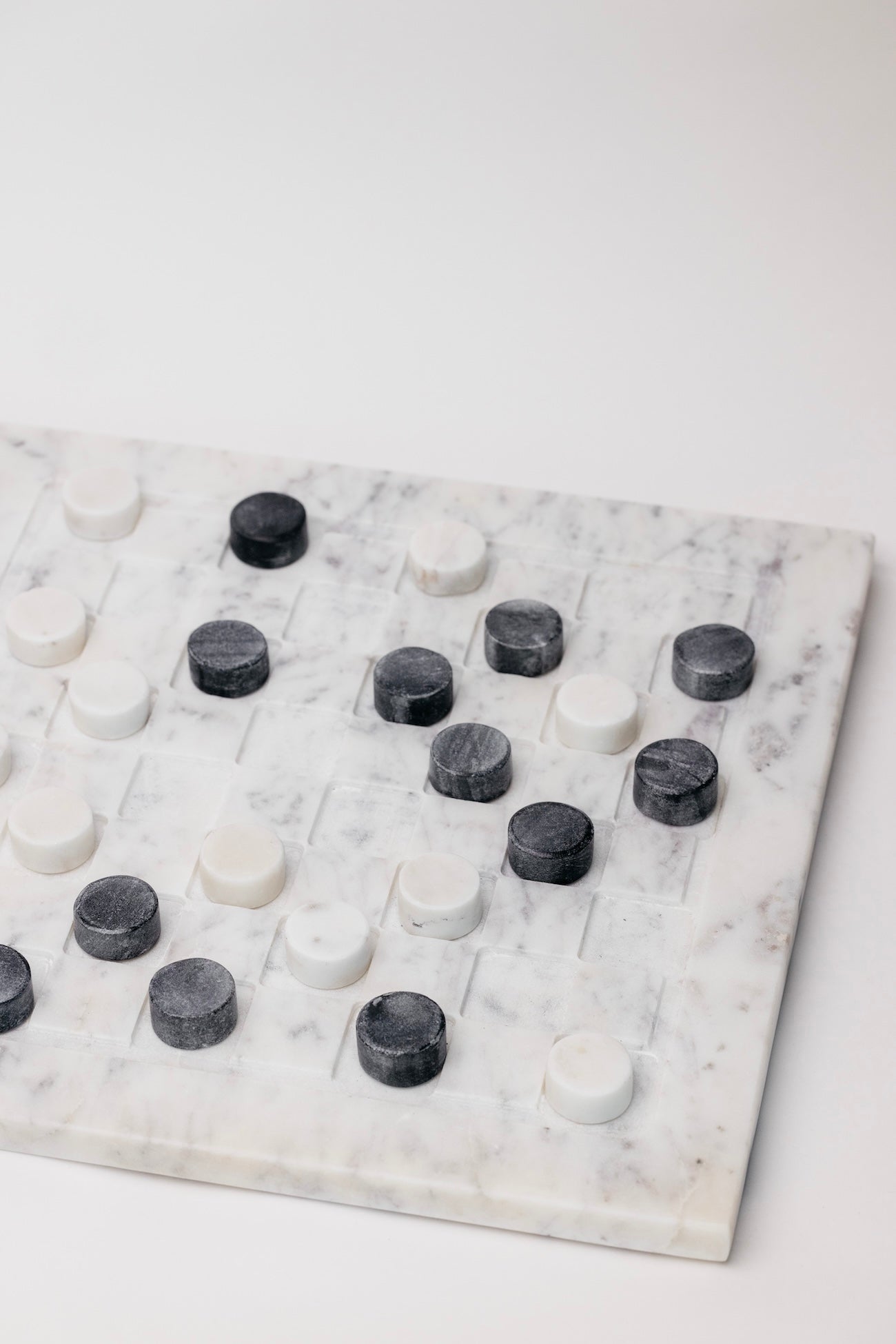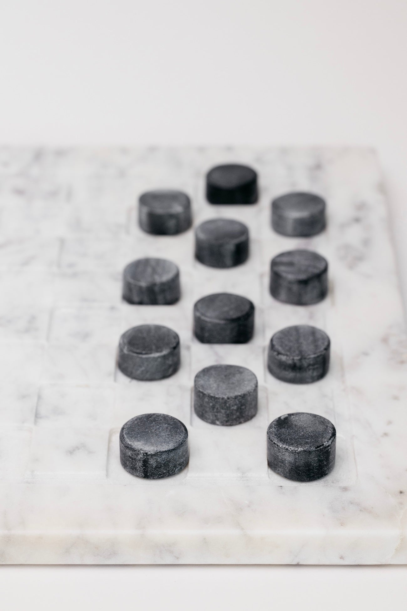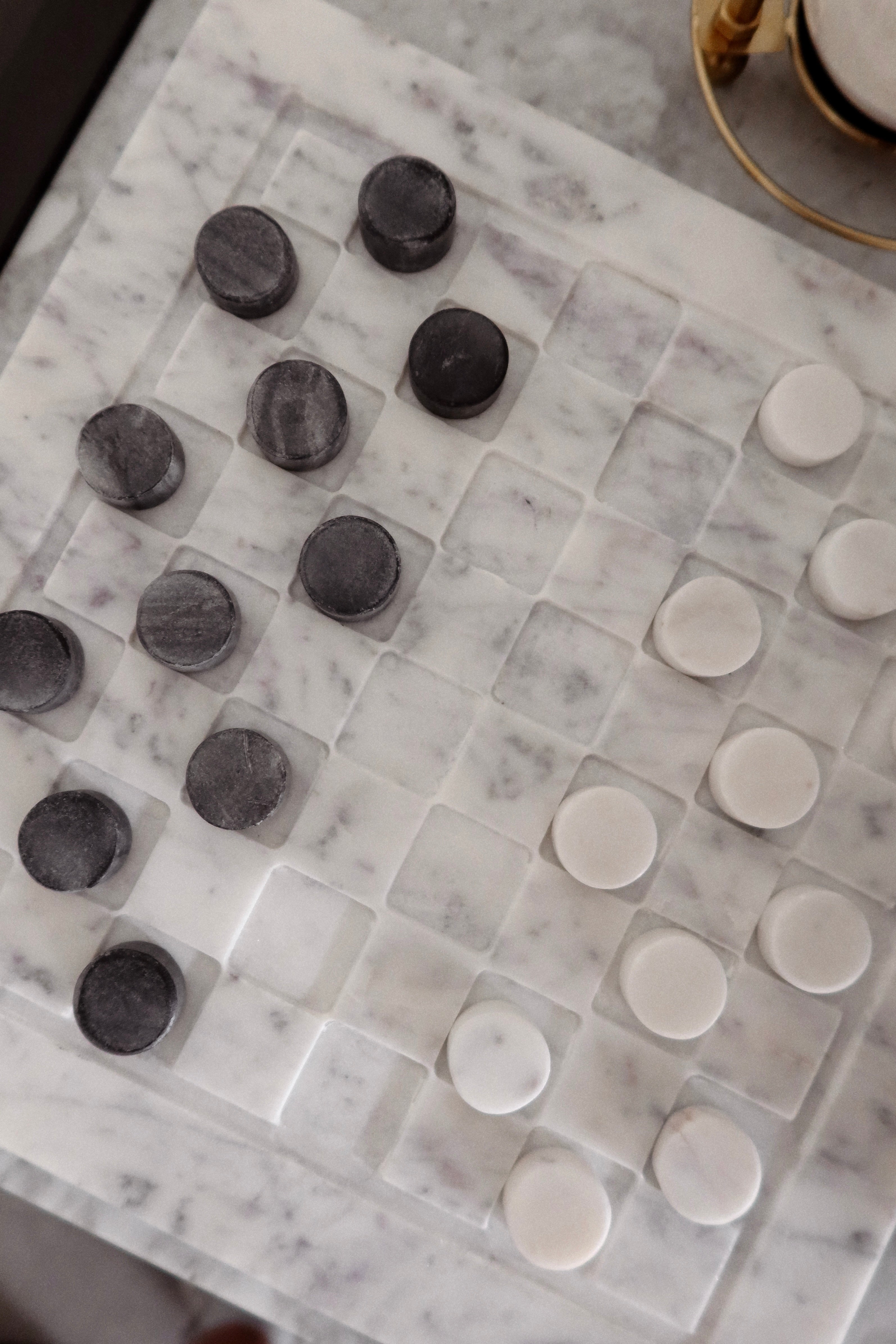 Upgrade your checkers game with our Maize Marble Checkers! These sleek + elevated pieces will add a timeless touch to your matches. We love these styled on a coffee table for a playful + sophisticated touch! Includes 24 game pieces + 1 marble board. Wipe clean with a lint-free, dry cloth.