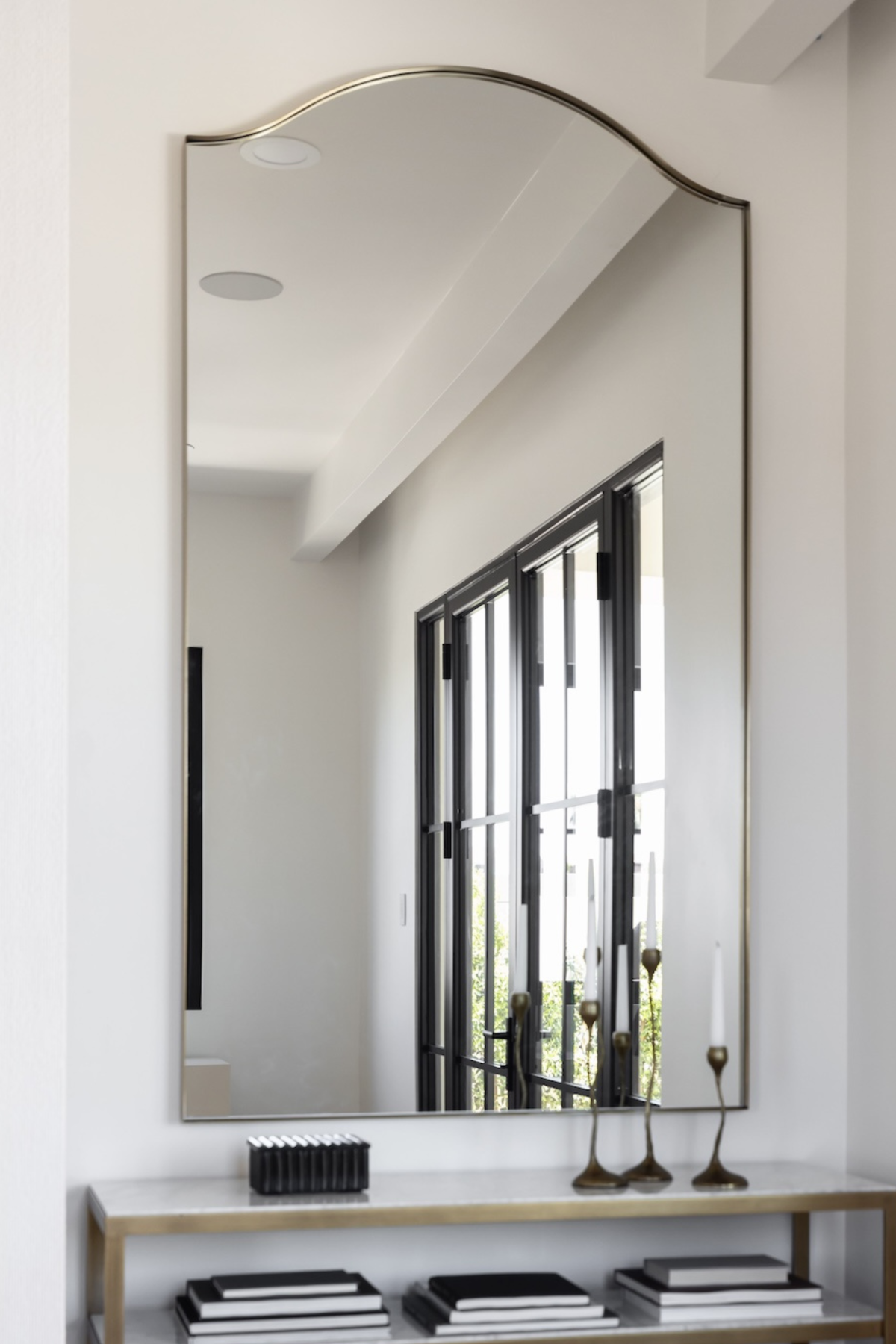 The Mallorca Mirror embodies timeless elegance with its sleek stainless steel frame and distinctly feminine silhouette, finished in a warm, plated brushed brass.