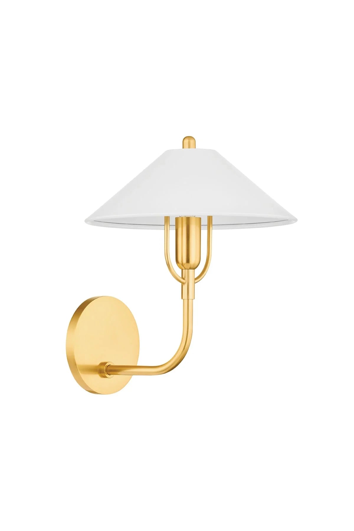Meet the Mariel Sconce. In a modernization of a traditional style, the shaded silhouette of Eastwood utilizes the harp holding the metal shade as a design detail. The curve of the harp complements the socket cup with a halo-like effect. A rounded finial in Aged Brass provides a finishing touch on top of the shade. Bulb(s) not included.
