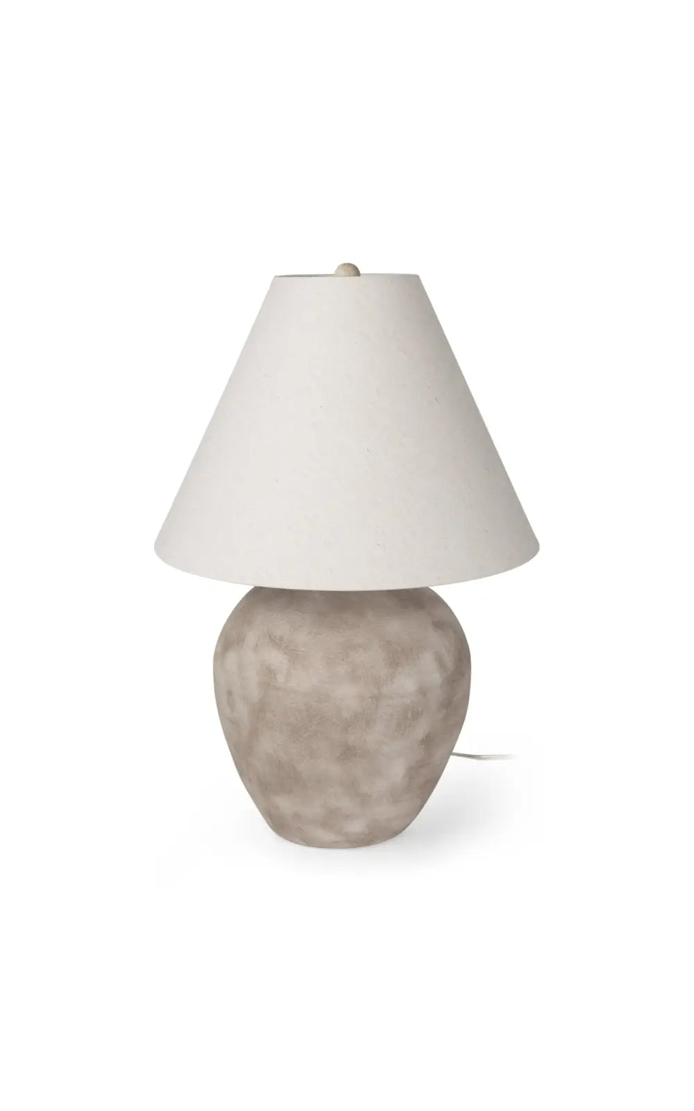 The Marvin Table Lamp features a solid tapered base with blends of dark taupe and cream. The smooth, artisan-style painted finish lends a rusticity to the design, complemented by a cream tapered lamp shade speckled with tans and browns. Bulb(s) not included.