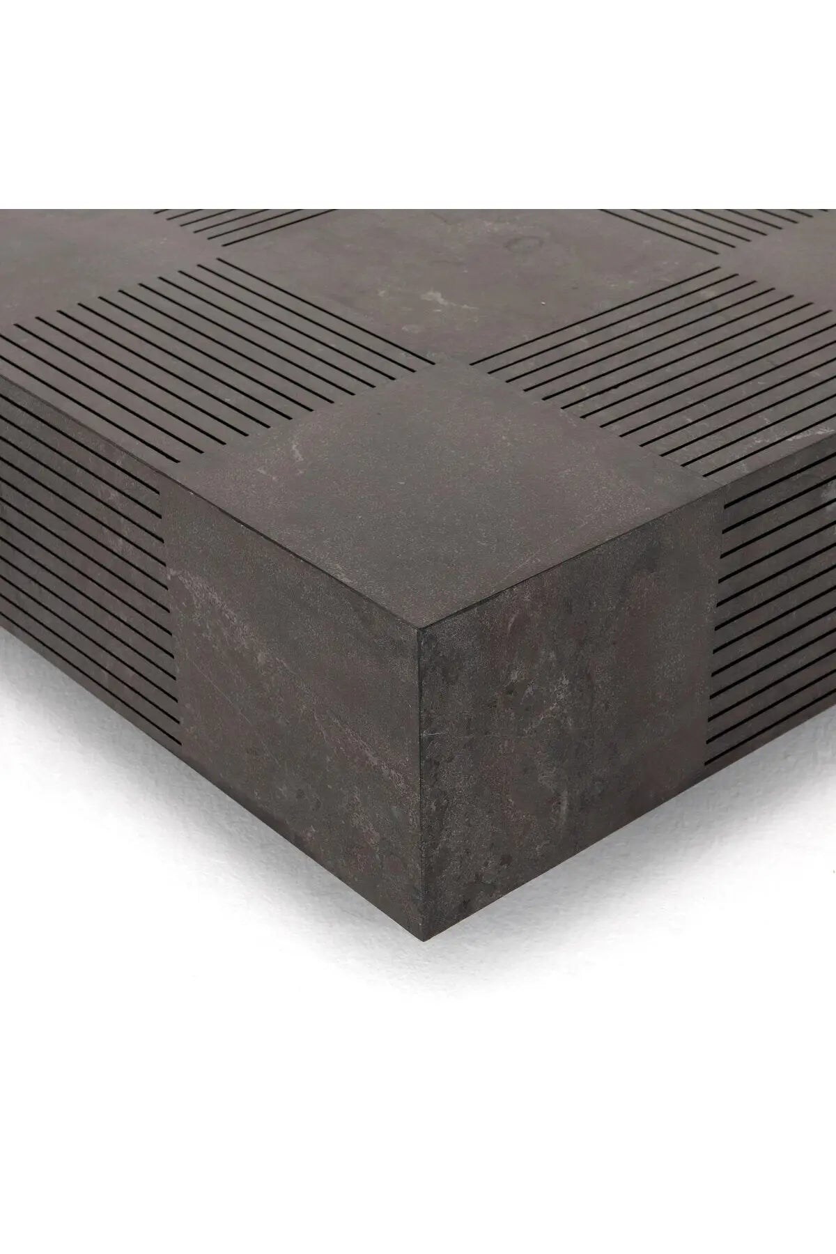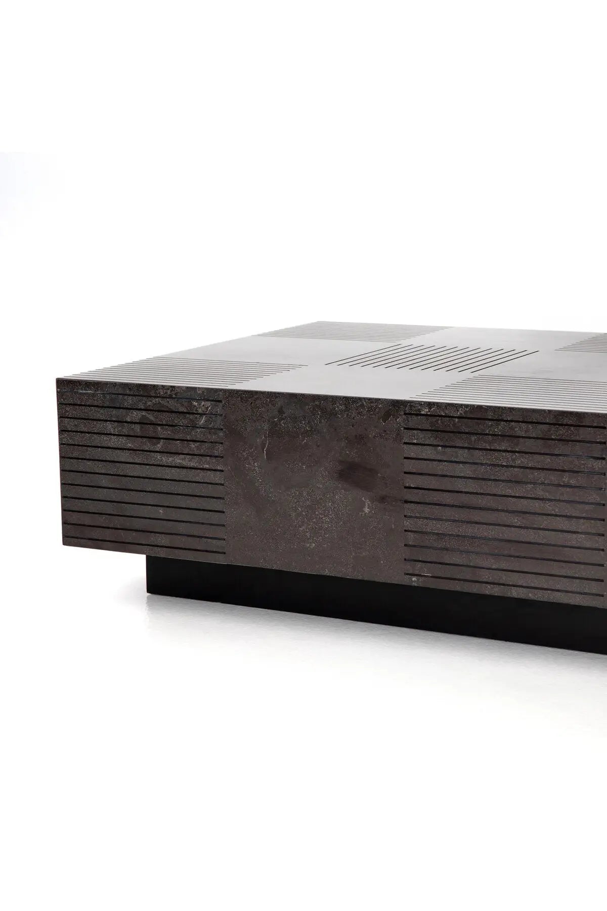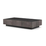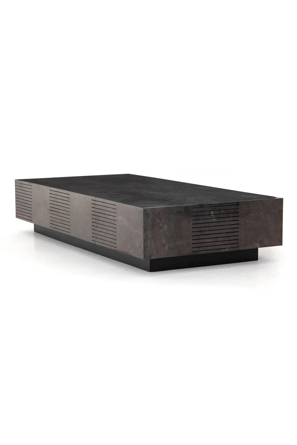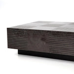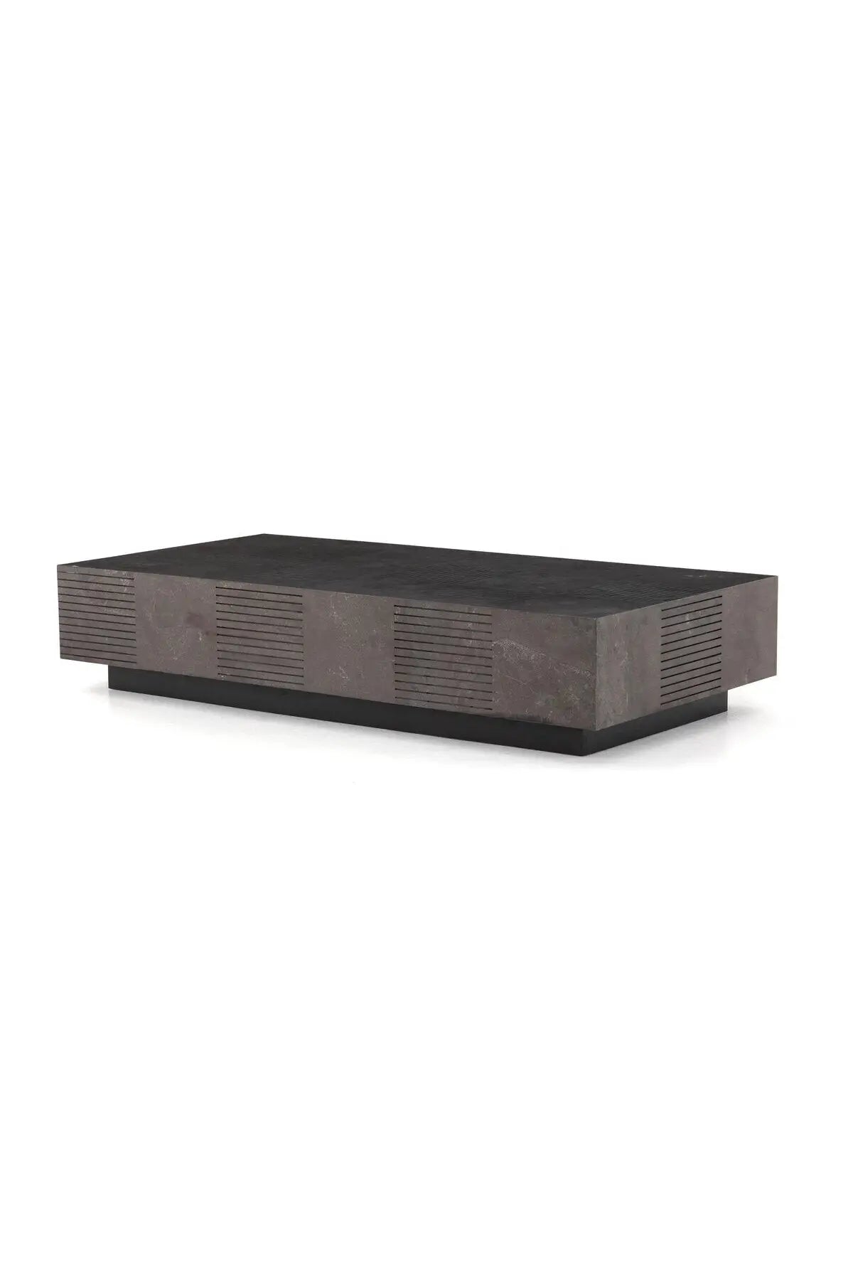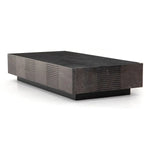 Meet the Masera Rectangular Coffee Table. Make a long, low statement. A rectangular bluestone slab features etched lines, forming parallel patterns for a unique look + textural touch. Plinth-style base of black oak for a modern finish.