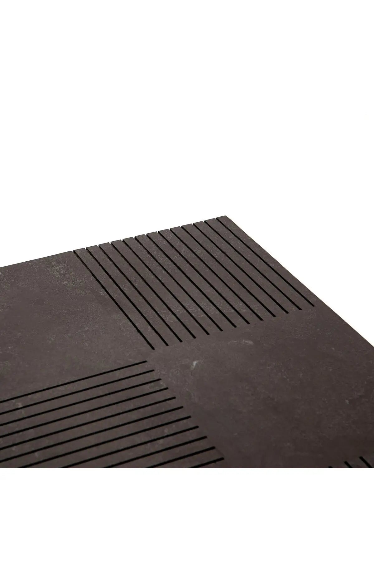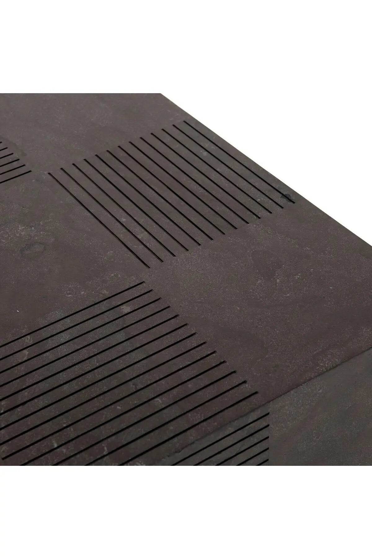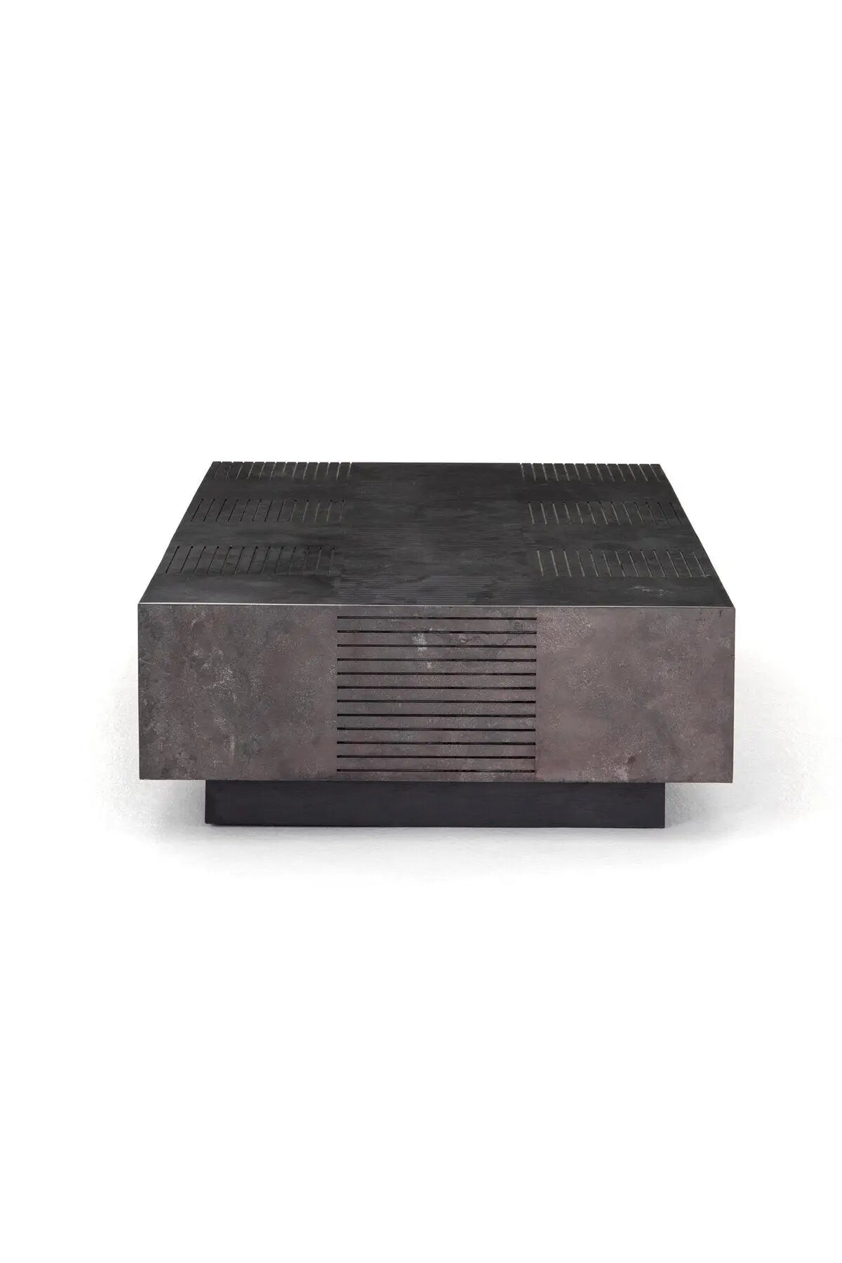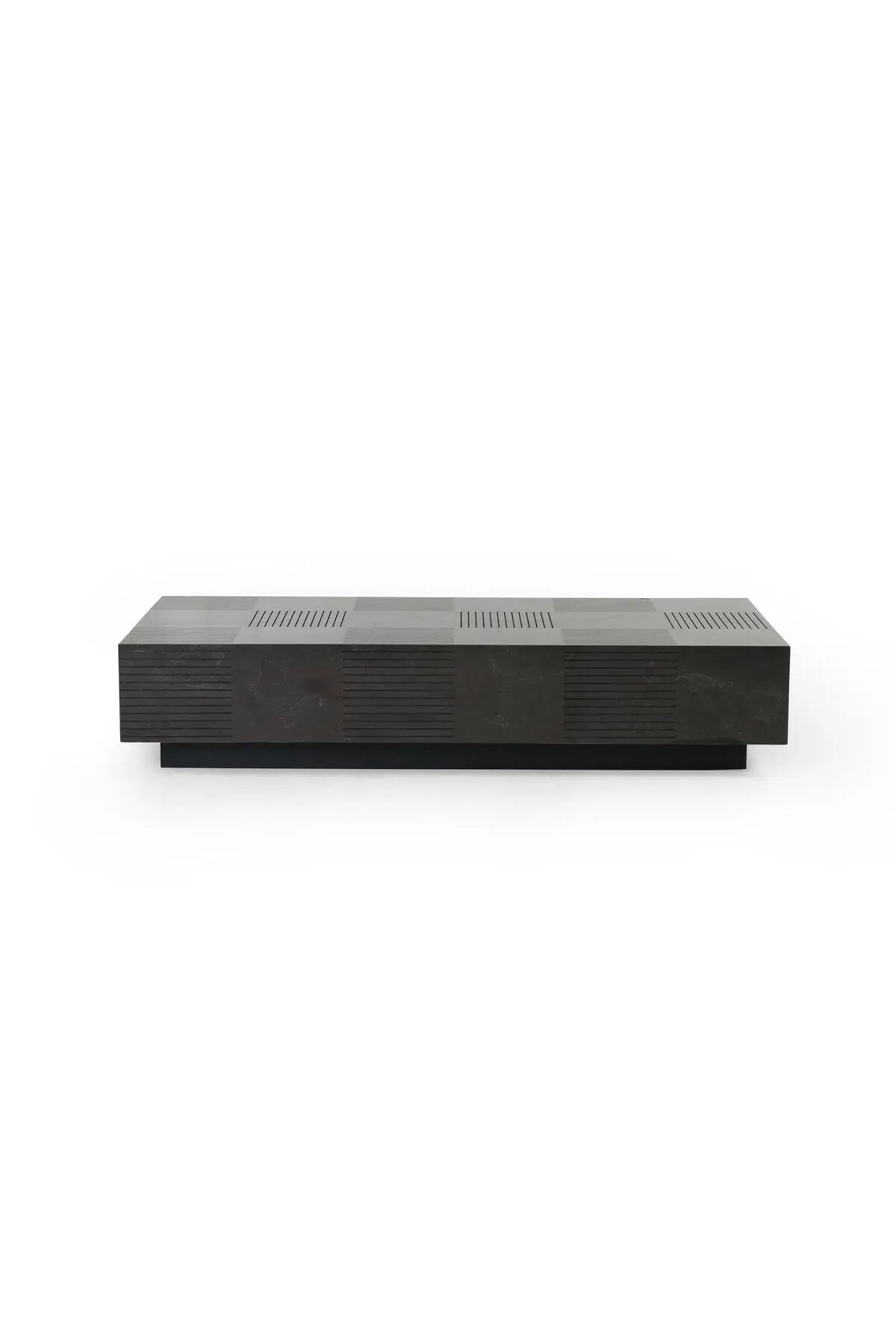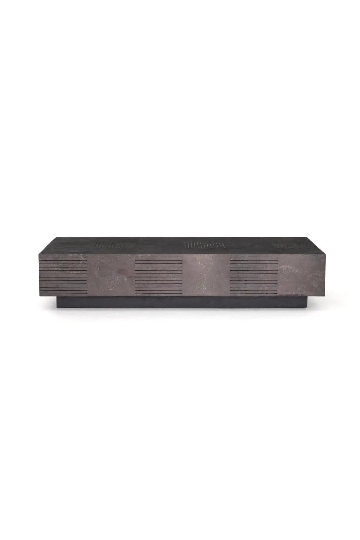 Meet the Masera Rectangular Coffee Table. Make a long, low statement. A rectangular bluestone slab features etched lines, forming parallel patterns for a unique look + textural touch. Plinth-style base of black oak for a modern finish.